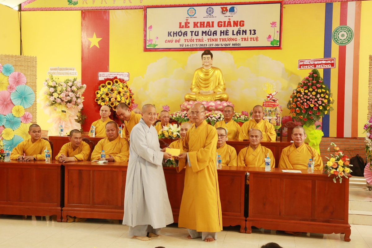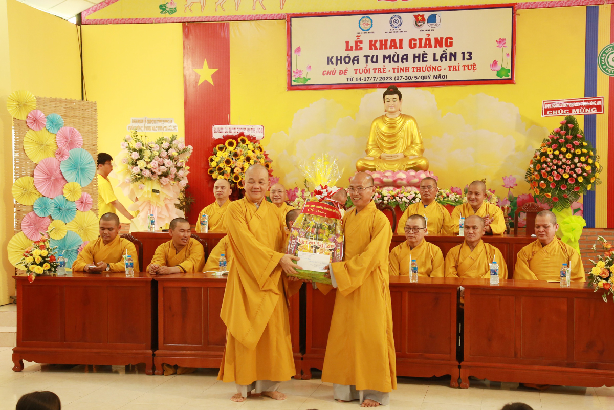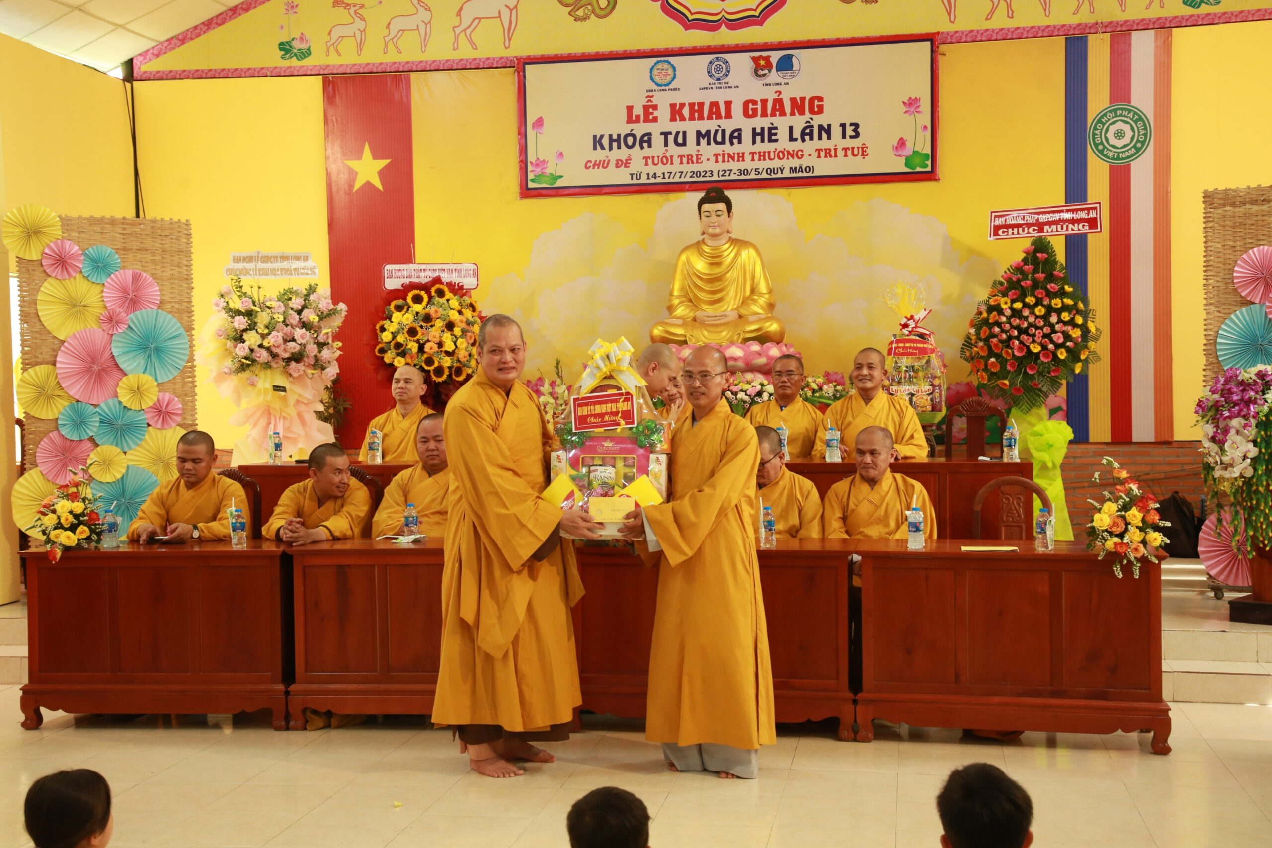 Nhân dịp này, Ban Tổ chức đã nhận được những lẵng hoa và phần quà cao quý từ chư Tôn đức gửi đến chúc mừng Khoá tu. Bài hát “Khoá tu mùa hè” do PT Tuệ Tâm trình bày đã được vang vọng khắp nơi để chào mừng cho buổi lễ.