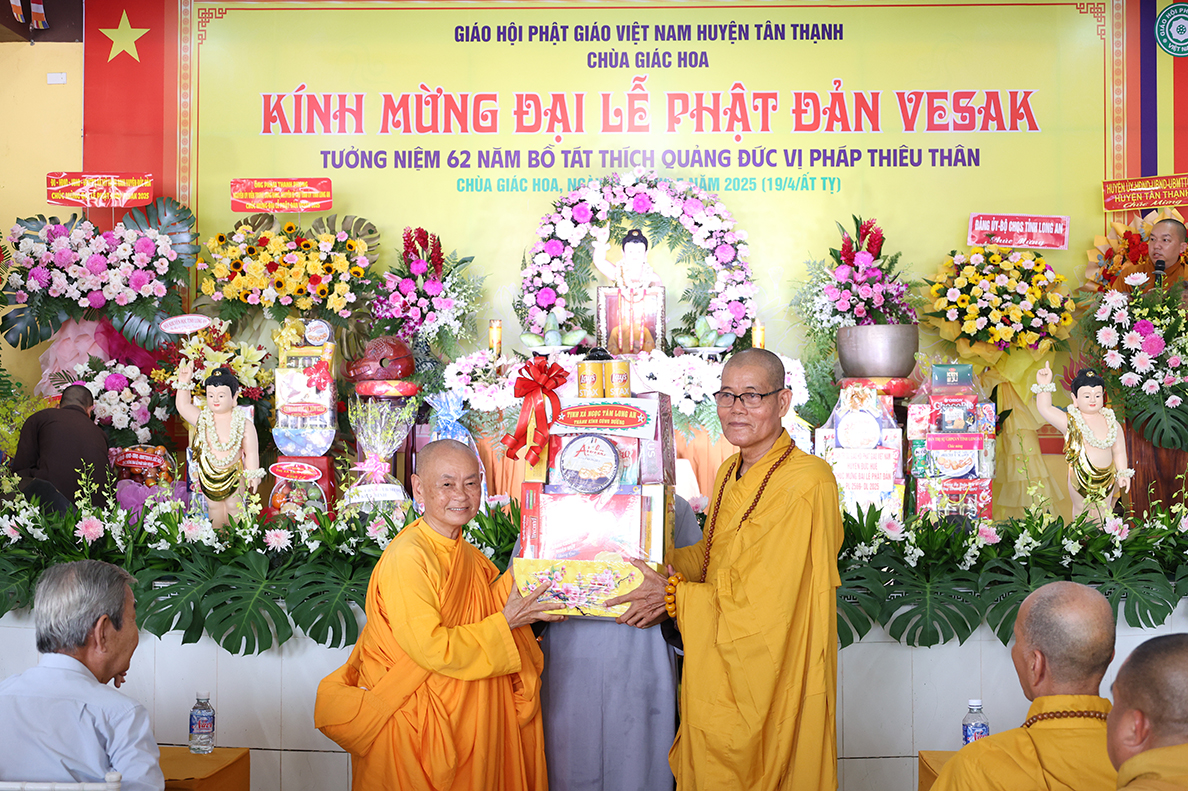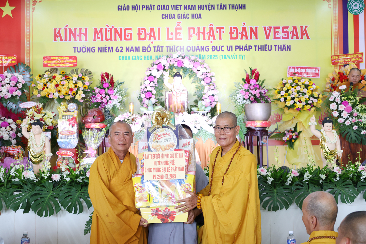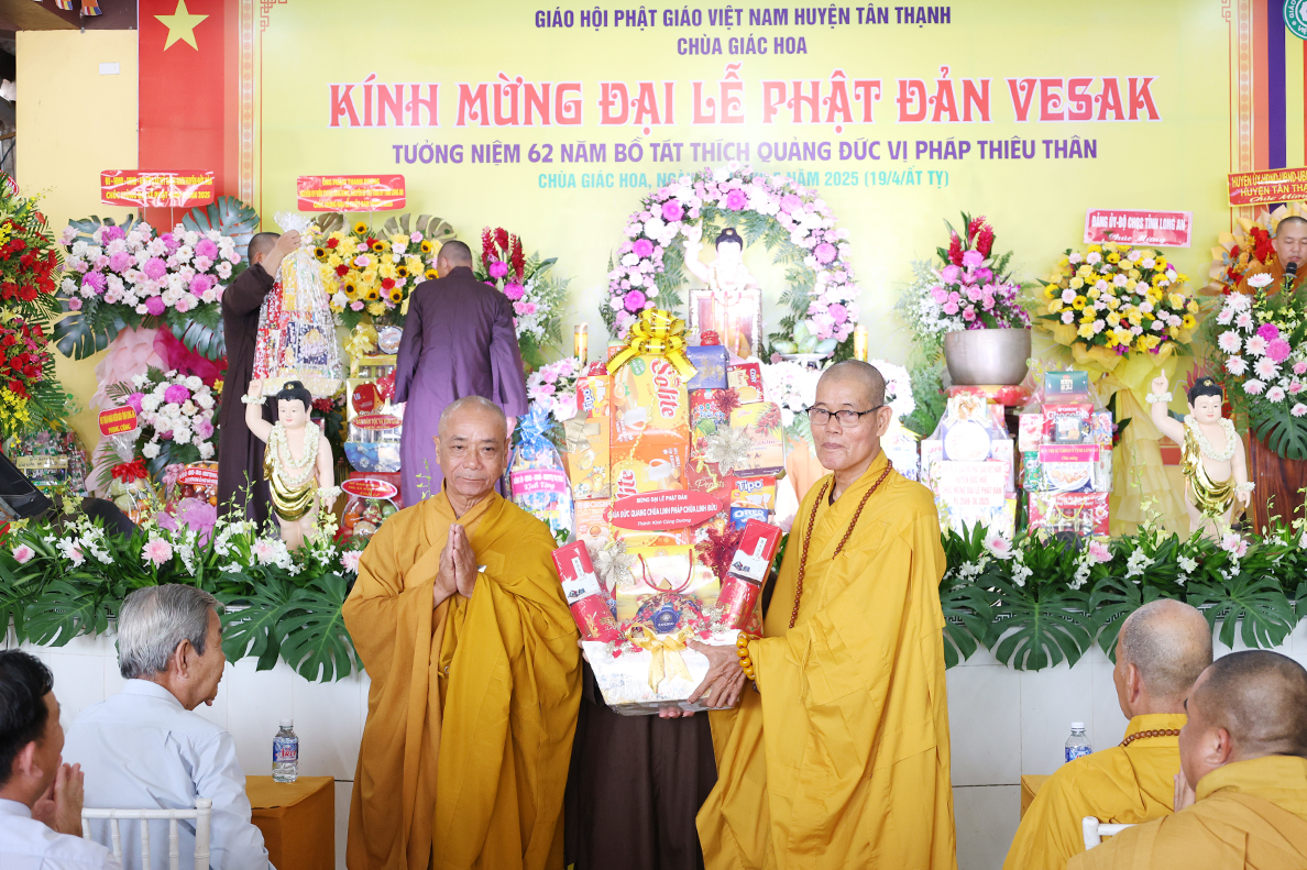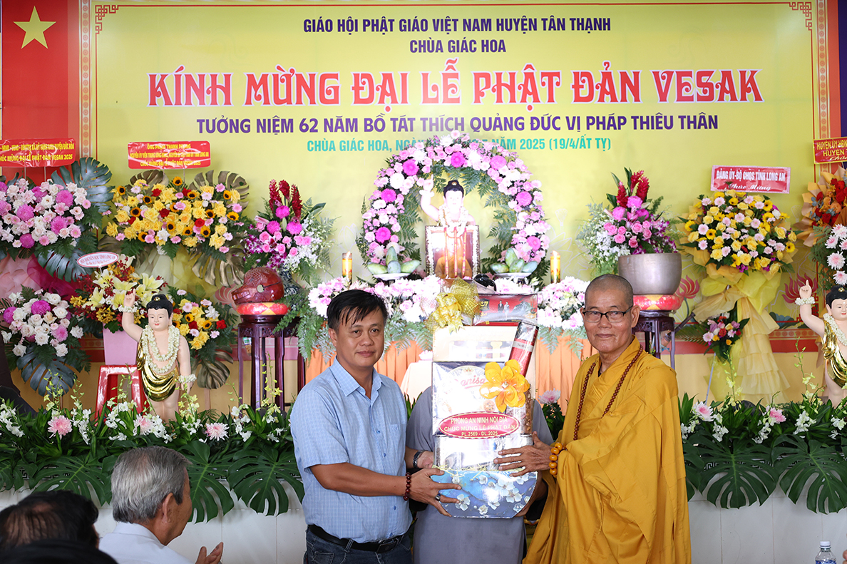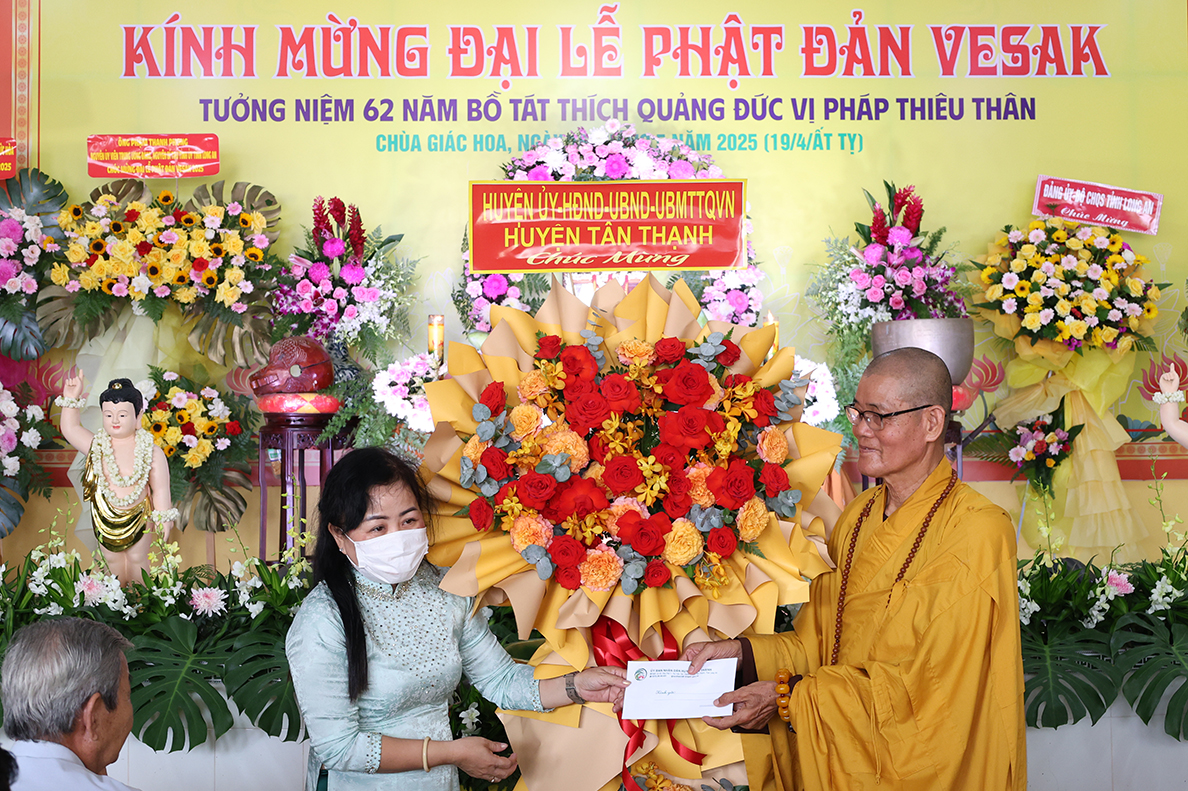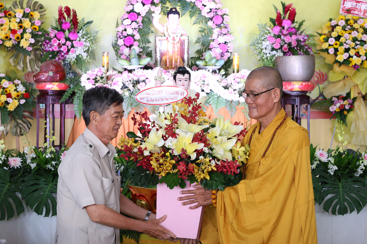 Buổi lễ đón nhận nhiều lẵng hoa phần quà của: Ban Trị sự GHPGVN tỉnh Long An; ông Phạm Thanh Phong – Nguyên UV BCH TƯ Đảng, Nguyên Bí thư tỉnh ủy Long An; Đảng ủy, Bộ Chỉ huy Quân sự tỉnh; Tỉnh ủy, HĐND, UBND, UBMTTQVN tỉnh Long An; Ban Dân tộc – Tôn giáo Sở Nội vụ tỉnh; Phòng An ninh nội địa PA.02 công an tỉnh; BTS GHPGVN huyện Đức Hòa, Đức Huệ; Huyện ủy, HĐND, UBND, UBMTTQVN huyện Tân Thạnh, huyện Đức Hòa, Thị xã Kiến Tường; Đảng ủy, HĐND, UBND, UBMTTQ Thị trấn Tân Thạnh, xã Mỹ Hạnh Nam,…