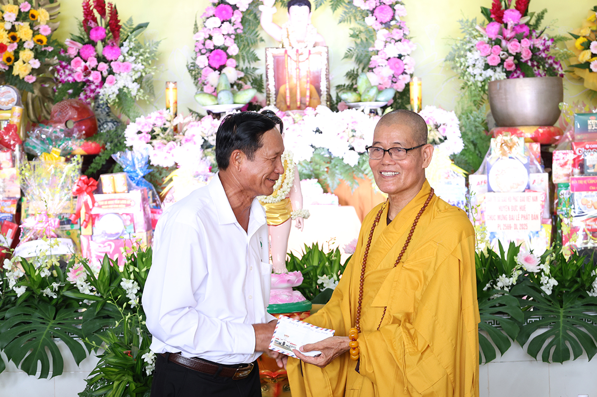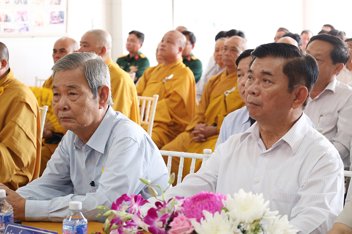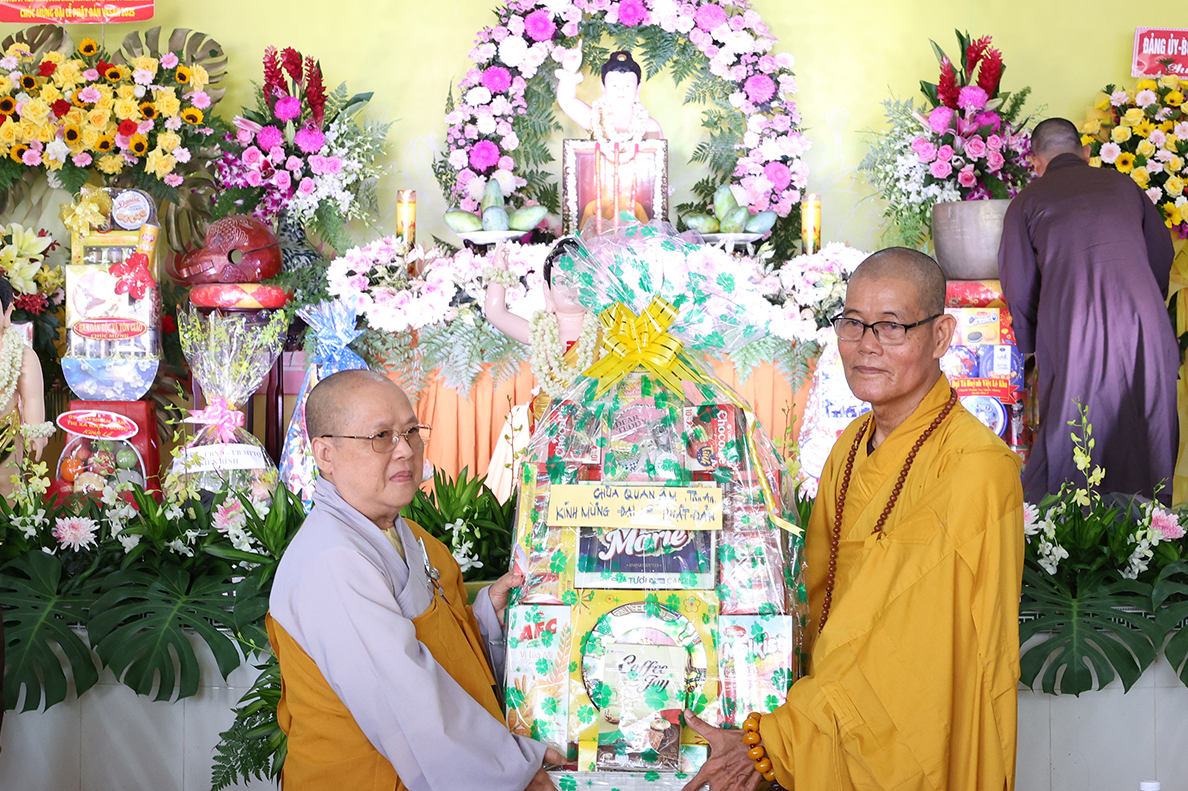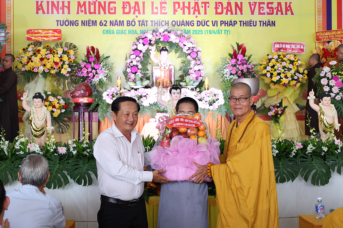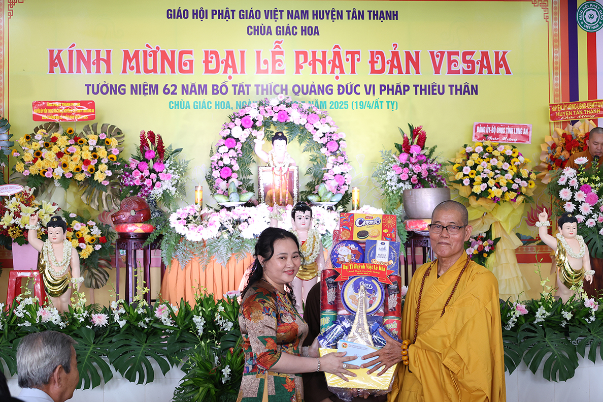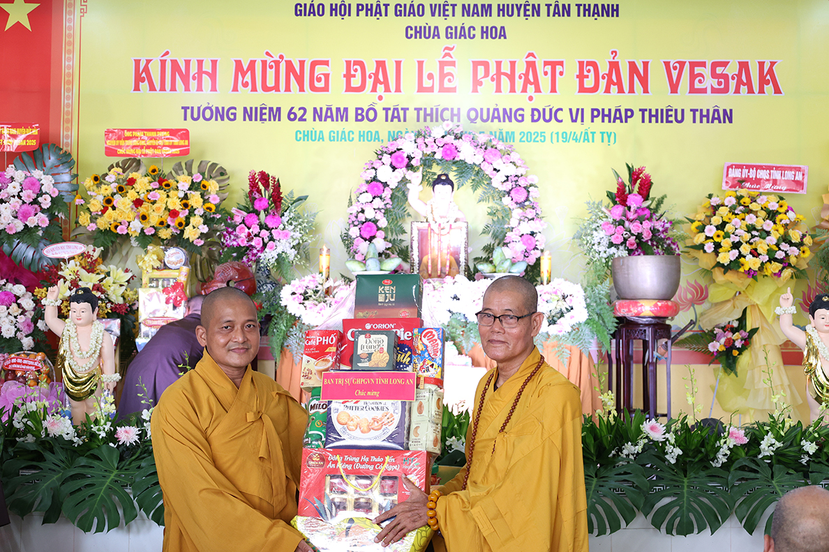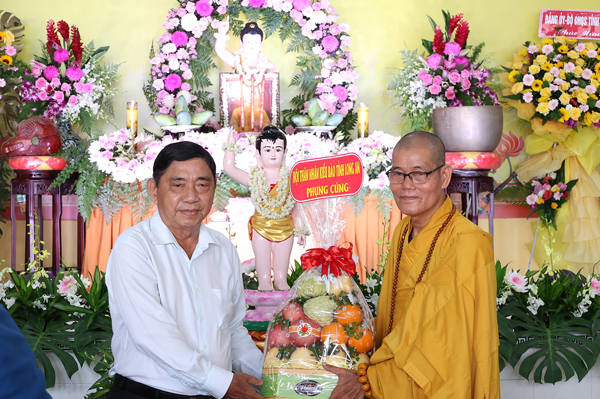 Buổi lễ đón nhận nhiều lẵng hoa phần quà của: Ban Trị sự GHPGVN tỉnh Long An; ông Phạm Thanh Phong – Nguyên UV BCH TƯ Đảng, Nguyên Bí thư tỉnh ủy Long An; Đảng ủy, Bộ Chỉ huy Quân sự tỉnh; Tỉnh ủy, HĐND, UBND, UBMTTQVN tỉnh Long An; Ban Dân tộc – Tôn giáo Sở Nội vụ tỉnh; Phòng An ninh nội địa PA.02 công an tỉnh; BTS GHPGVN huyện Đức Hòa, Đức Huệ; Huyện ủy, HĐND, UBND, UBMTTQVN huyện Tân Thạnh, huyện Đức Hòa, Thị xã Kiến Tường; Đảng ủy, HĐND, UBND, UBMTTQ Thị trấn Tân Thạnh, xã Mỹ Hạnh Nam,…