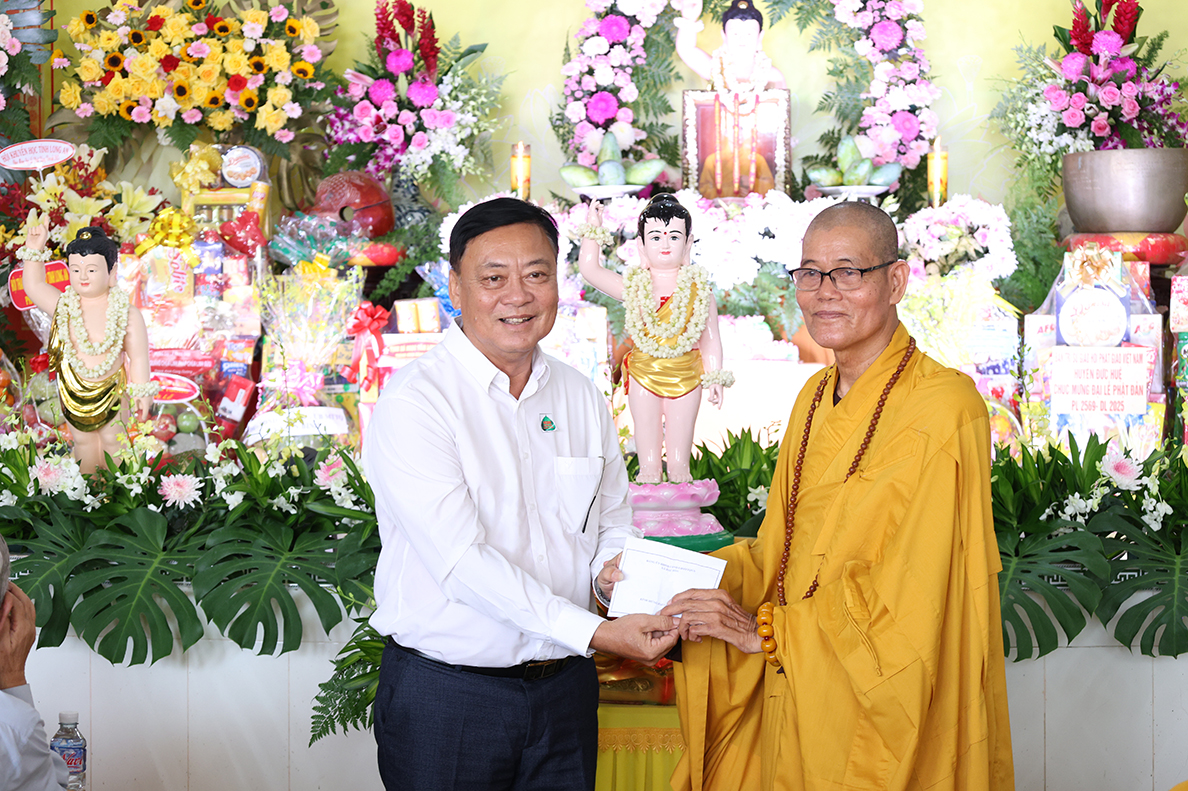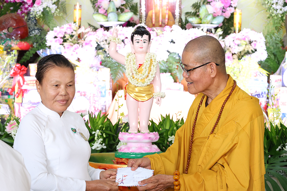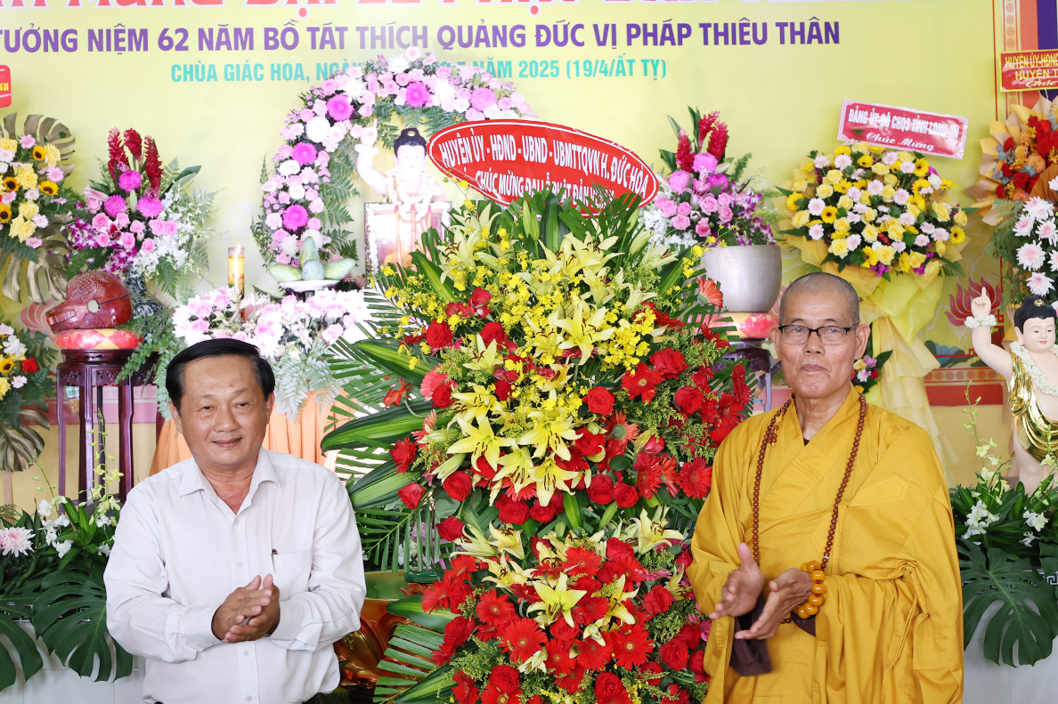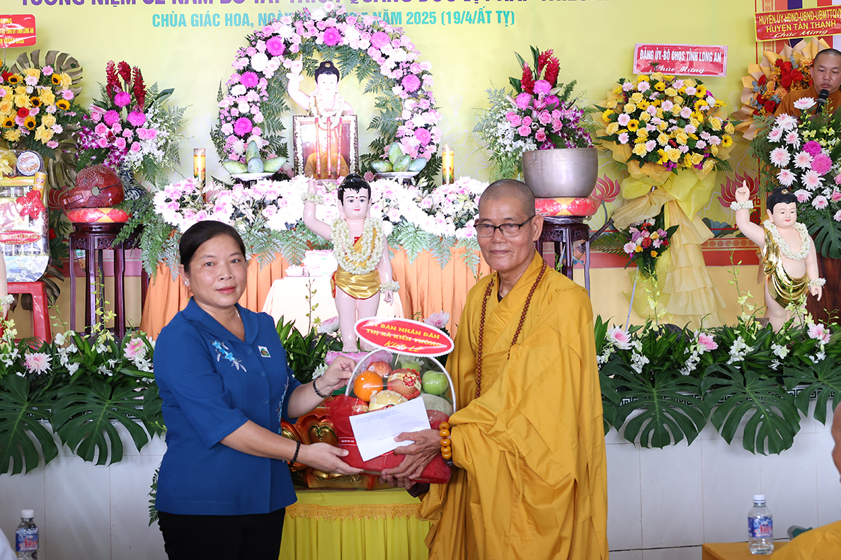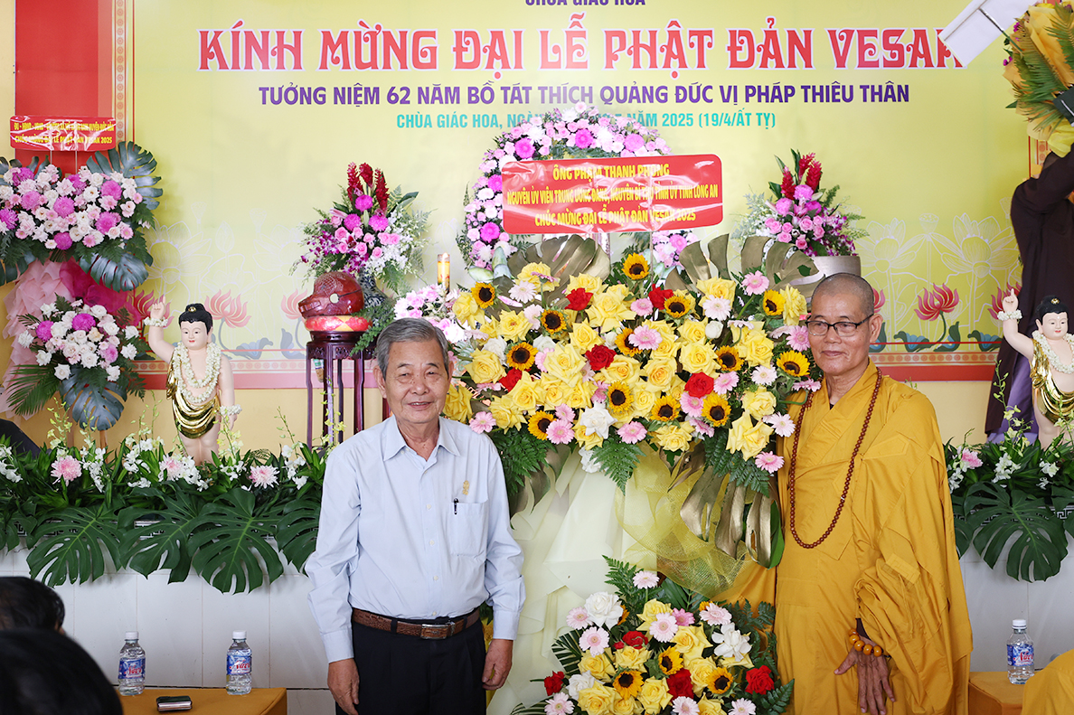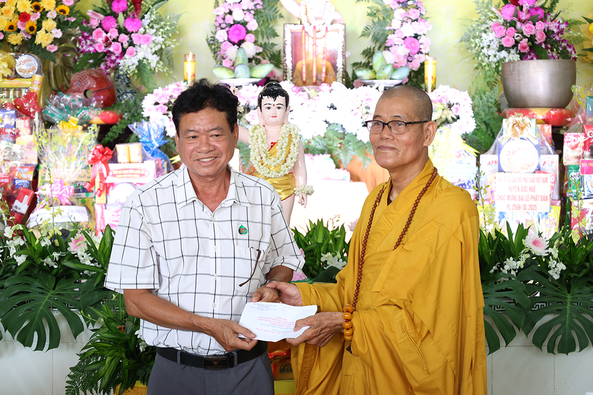 Buổi lễ đón nhận nhiều lẵng hoa phần quà của: Ban Trị sự GHPGVN tỉnh Long An; ông Phạm Thanh Phong – Nguyên UV BCH TƯ Đảng, Nguyên Bí thư tỉnh ủy Long An; Đảng ủy, Bộ Chỉ huy Quân sự tỉnh; Tỉnh ủy, HĐND, UBND, UBMTTQVN tỉnh Long An; Ban Dân tộc – Tôn giáo Sở Nội vụ tỉnh; Phòng An ninh nội địa PA.02 công an tỉnh; BTS GHPGVN huyện Đức Hòa, Đức Huệ; Huyện ủy, HĐND, UBND, UBMTTQVN huyện Tân Thạnh, huyện Đức Hòa, Thị xã Kiến Tường; Đảng ủy, HĐND, UBND, UBMTTQ Thị trấn Tân Thạnh, xã Mỹ Hạnh Nam,…