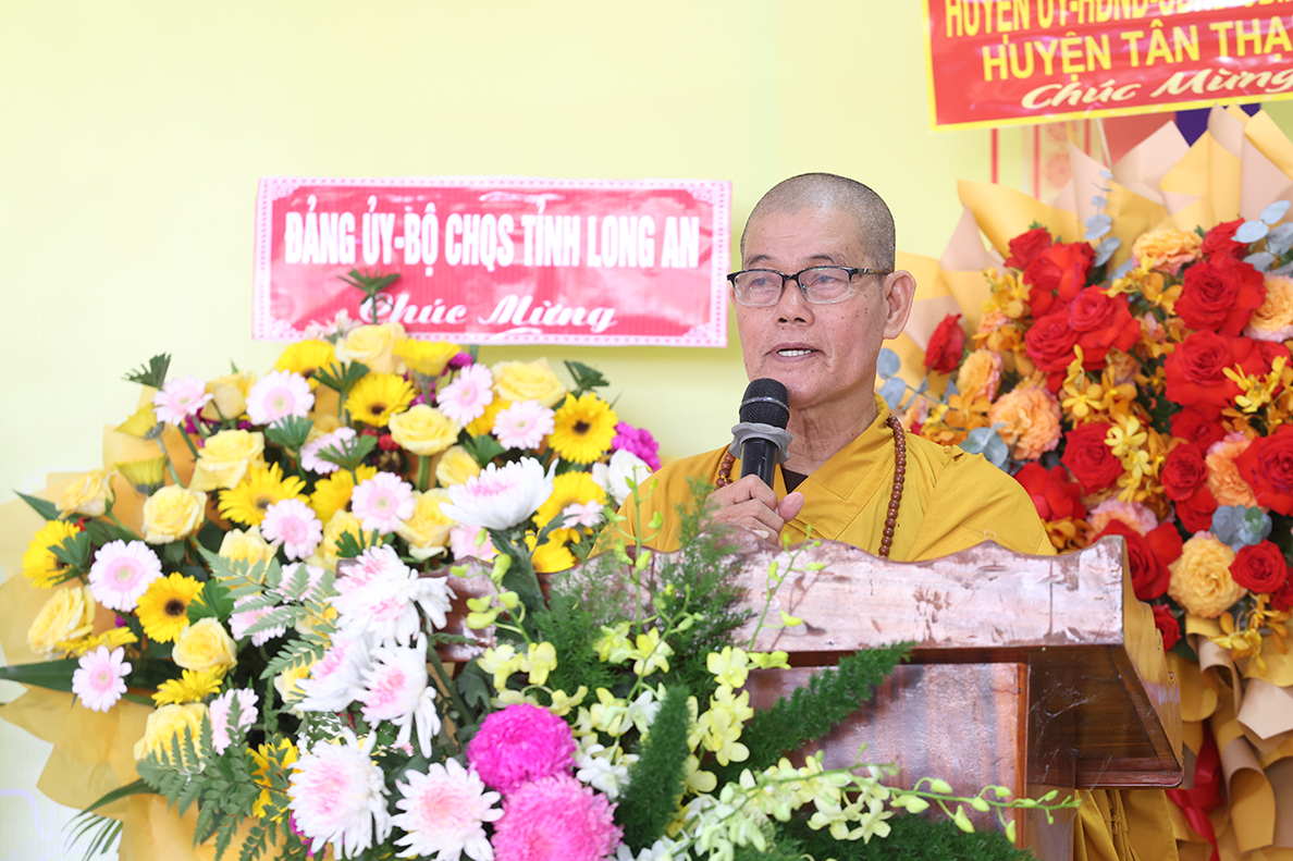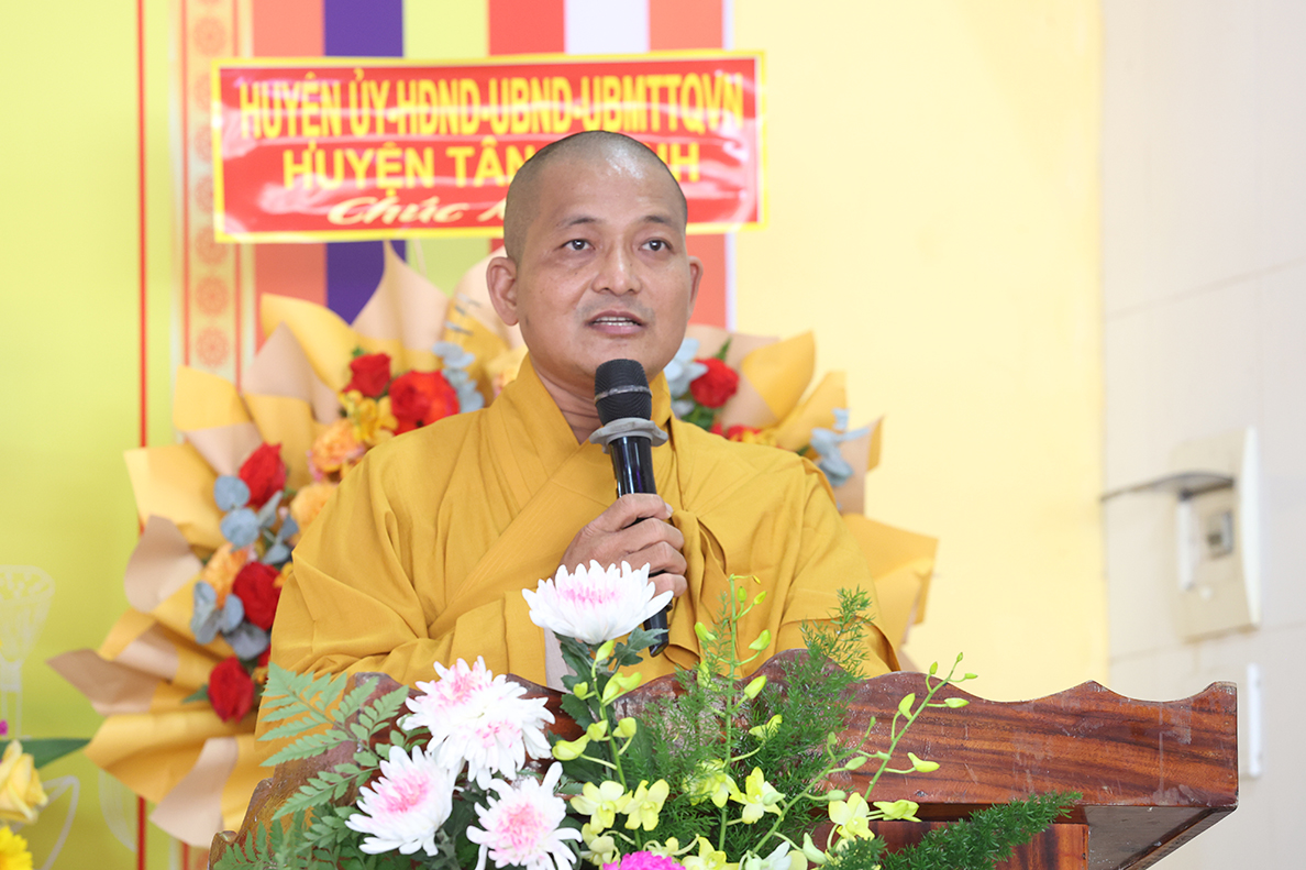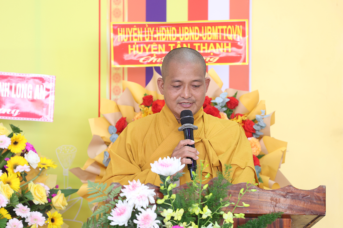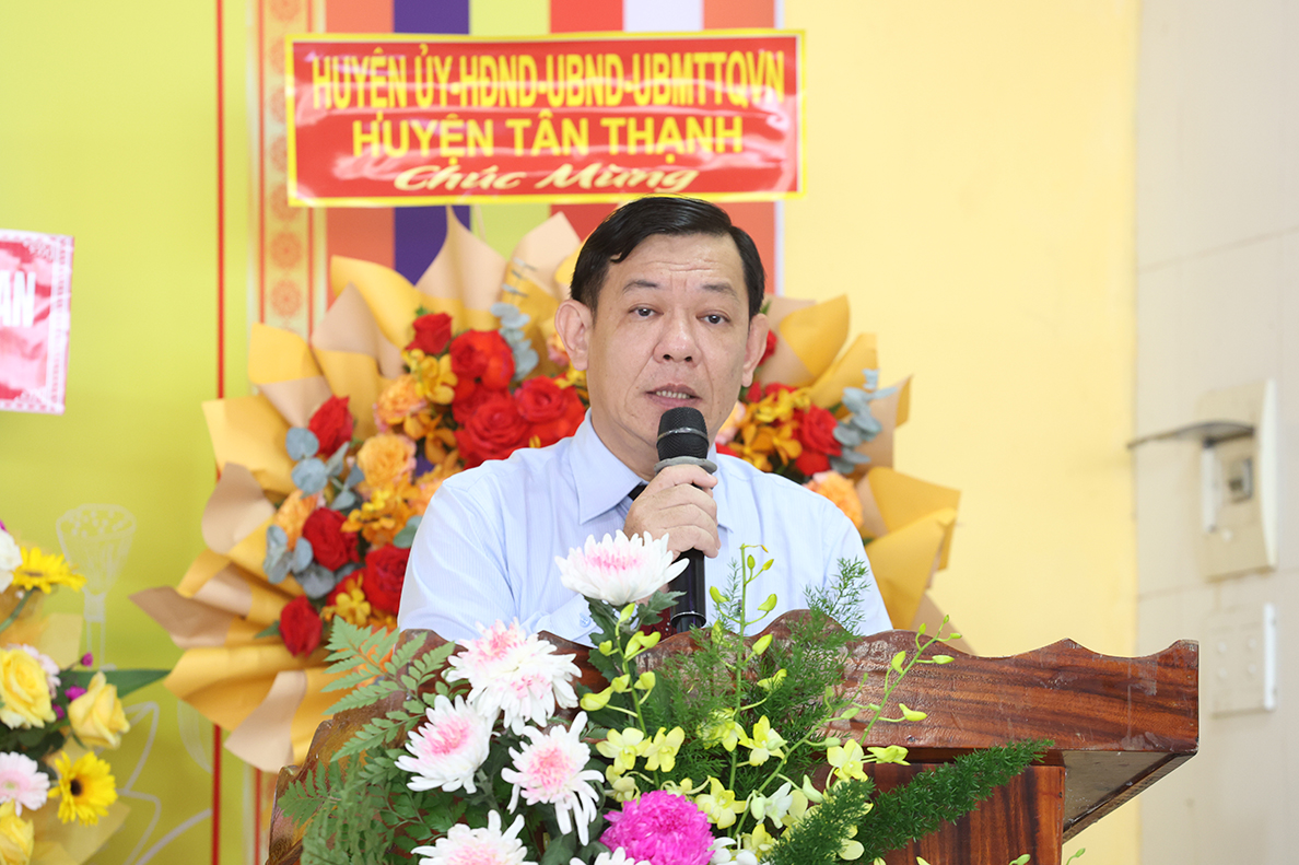 Đại diện chính quyền địa phương, ông Hà Thanh Chì – UV BTV huyện ủy, Phó CT UBND huyện Tân Thạnh có lời phát biểu tại buổi lễ. Ông cho biết sự kiện Đại lễ Phật Đản năm nay hòa cùng ngày đất nước kỷ niệm 50 năm ngày thống nhất đất nước và 80 năm Quốc khánh nước CHXHCN Việt Nam. Qua đó, ông đề cao triết lý của Đạo Phật là kim chỉ nam cho các giải pháp củng cố hòa bình và xây dựng xã hội bền vững cho nhân loại. Ông cũng báo cáo khái quát về tình hình phát triển kinh tế xã hội của huyện Tân Thạnh các tháng đầu năm có chuyển biến tích cực, qua đó ông hy vọng Tăng Ni Phật tử tiếp tục đồng hành cùng chính quyền trong các hoạt động từ thiện, nhân đạo, phát huy giá trị tốt đẹp của Phật giáo trong việc vun đắp khối đại đoàn kết dân tộc và góp phần phát triển địa phương ngày càng vững mạnh.
