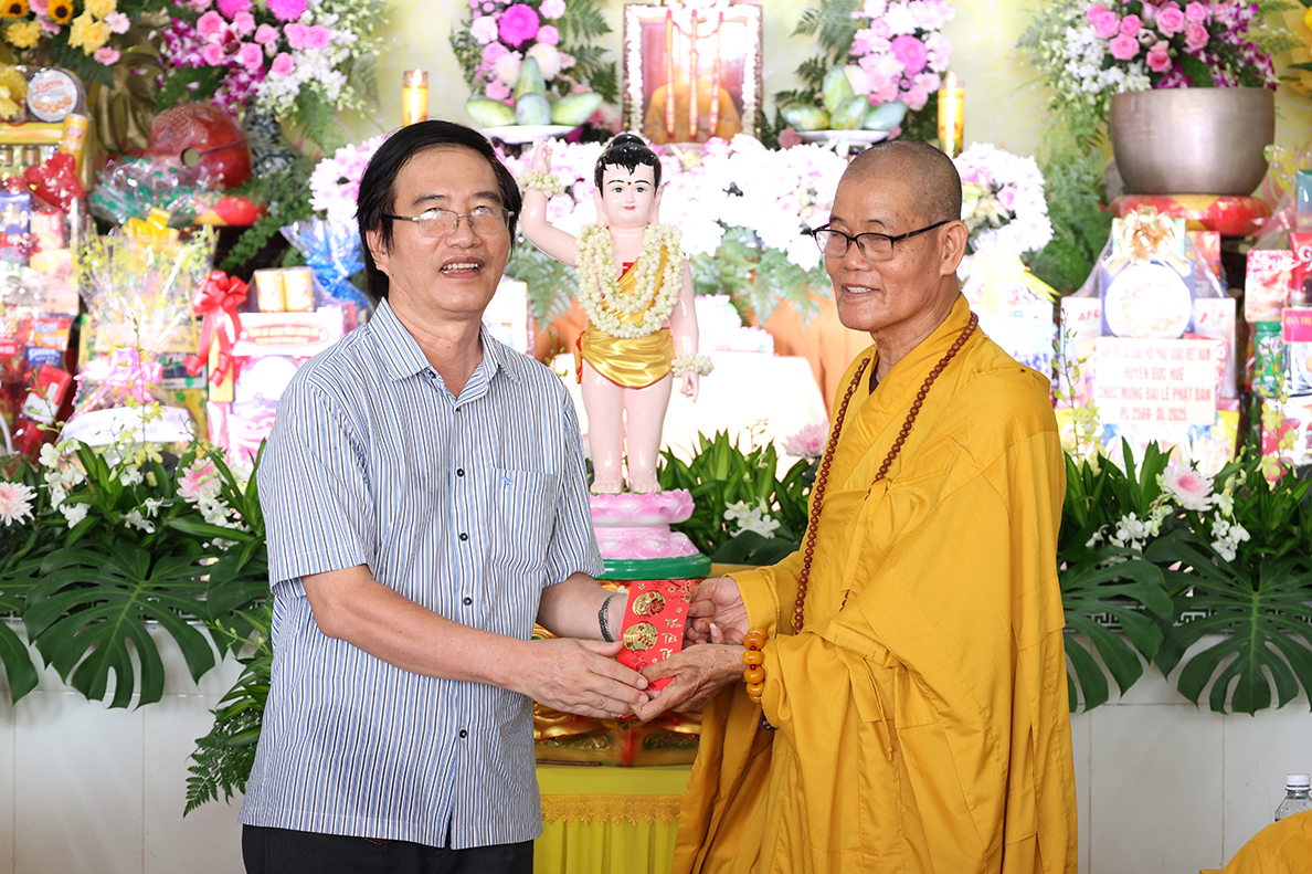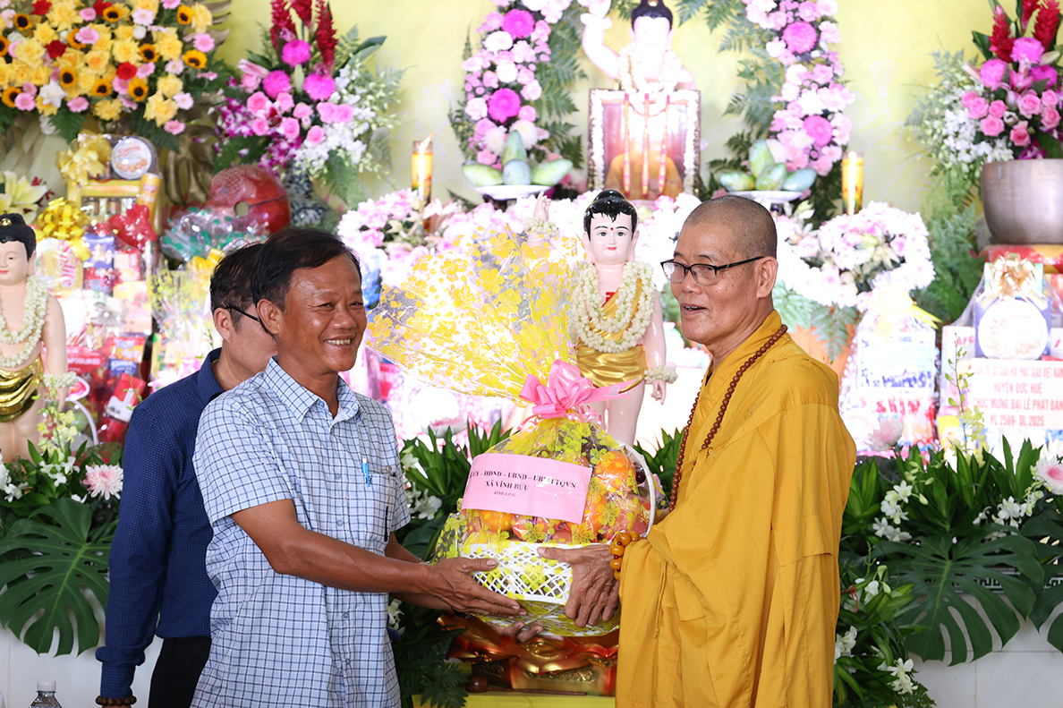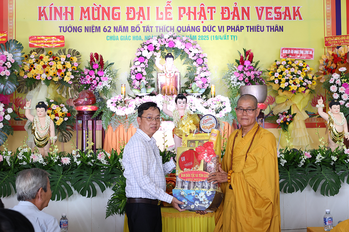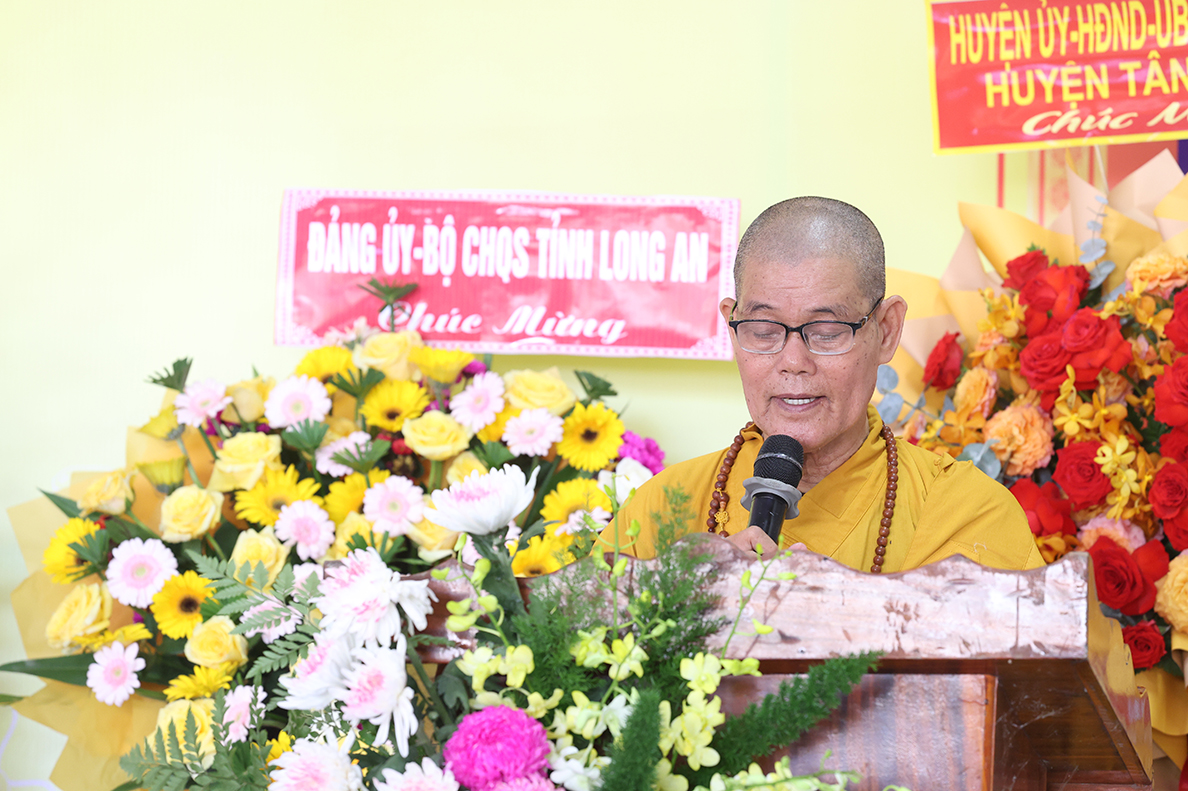 Đại diện chính quyền địa phương, ông Hà Thanh Chì – UV BTV huyện ủy, Phó CT UBND huyện Tân Thạnh có lời phát biểu tại buổi lễ. Ông cho biết sự kiện Đại lễ Phật Đản năm nay hòa cùng ngày đất nước kỷ niệm 50 năm ngày thống nhất đất nước và 80 năm Quốc khánh nước CHXHCN Việt Nam. Qua đó, ông đề cao triết lý của Đạo Phật là kim chỉ nam cho các giải pháp củng cố hòa bình và xây dựng xã hội bền vững cho nhân loại. Ông cũng báo cáo khái quát về tình hình phát triển kinh tế xã hội của huyện Tân Thạnh các tháng đầu năm có chuyển biến tích cực, qua đó ông hy vọng Tăng Ni Phật tử tiếp tục đồng hành cùng chính quyền trong các hoạt động từ thiện, nhân đạo, phát huy giá trị tốt đẹp của Phật giáo trong việc vun đắp khối đại đoàn kết dân tộc và góp phần phát triển địa phương ngày càng vững mạnh.