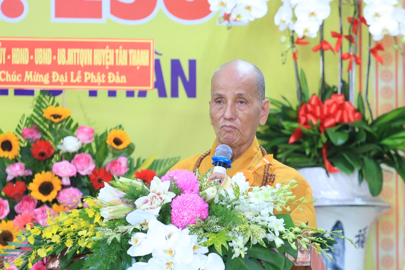 Đãi lao chư tôn đức chứng minh, HT. Thích Minh Thiện có lời đạo từ tại buổi lễ. Trước nhất, Hòa thượng gửi lời vấn an sức khoẻ đến chư Tôn đức Chứng minh, chư Tôn đức hiện tiền, chính quyền các cấp, chư vị khách quý và toàn thể đại chúng. Tiếp đó, Hòa thượng nhắc nhở đại chúng, sau khi đã lắng nghe Thông điệp Phật đản, Diễn văn Phật đản của Nhị vị Hoà thượng lãnh đạo tối cao của Giáo hội cùng lời phát biểu của chính quyền, mỗi người chúng ta hãy phát huy truyền thống đoàn kết của dân tộc, của người Long An. Nhân dịp này, Hòa thượng cũng nhắc lại vị pháp thiêu thân và “Trái tim bất diệt” của Bồ tát Thích Quảng Đức nhân dịp kỷ niệm 60 năm Ngài tự thiêu. Trong giờ phút thiêng liêng của Đại lễ, Hòa thượng đã tuyên đọc lại bức thư của Bồ tát Thích Quảng Đức gửi cho chính quyền bấy giờ. Để bày tỏ niềm xúc cảm trong việc tự thiêu, Hòa thượng đã nhắc lại lời cảm thán của Bác Hồ dành tặng cho Ngài. Sau khi trích lại những lời phát biểu quan trọng, Hòa thượng nhấn mạnh sự tự thiêu ấy là vì đạo pháp, vì dân tộc vì sự tự do, hạnh phúc của mọi người. Hòa thượng mong mỏi sẽ có nhiều khoá tu mùa hè nhằm giáo dục giới trẻ nhận thức về đạo đức, tinh thần yêu nước, hiếu thảo,…
