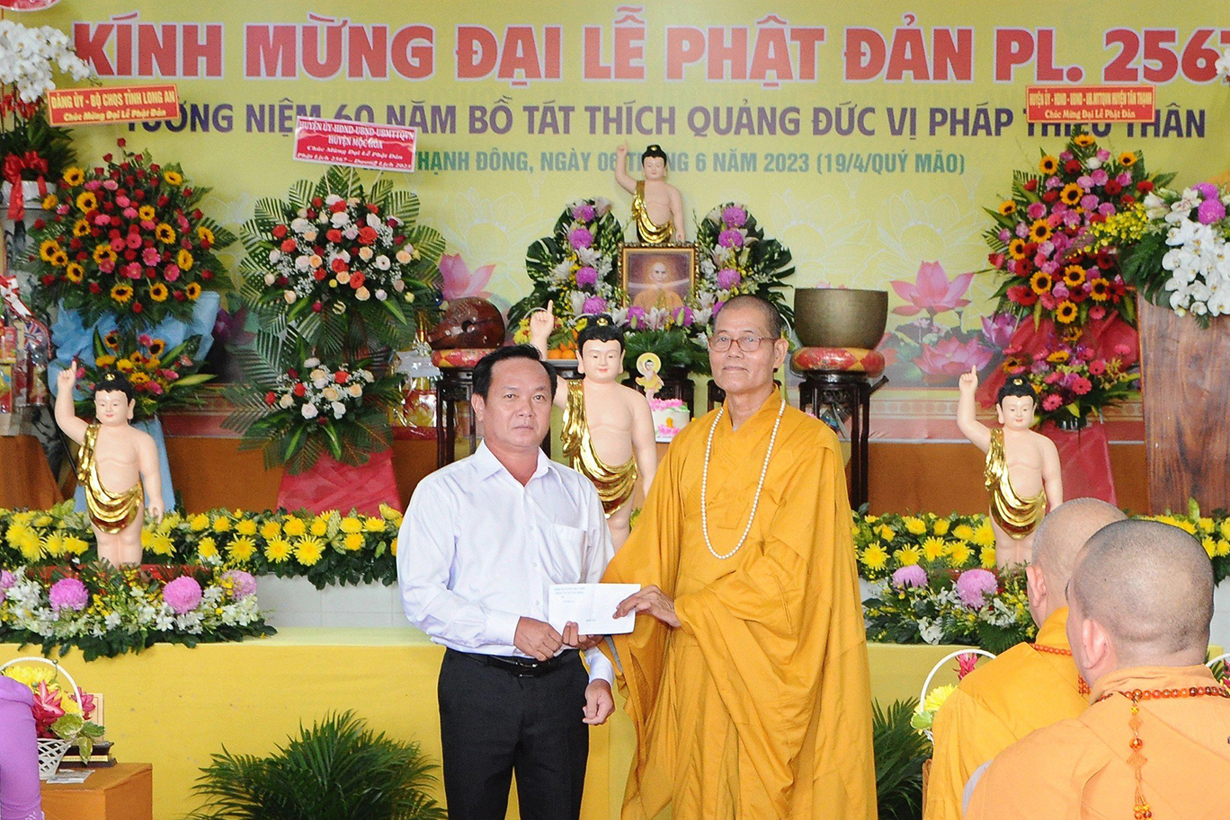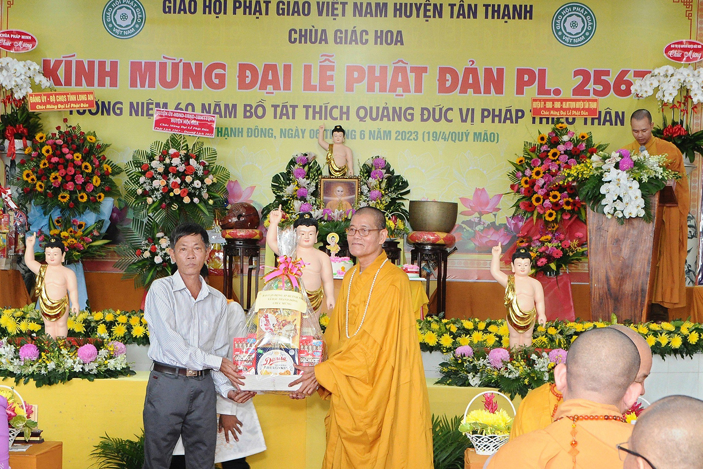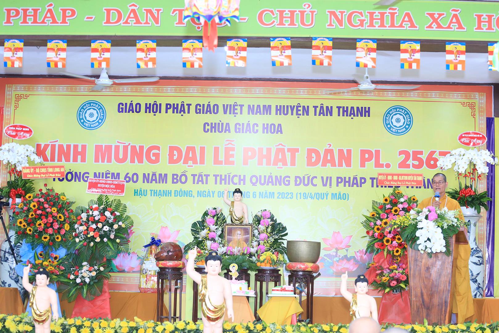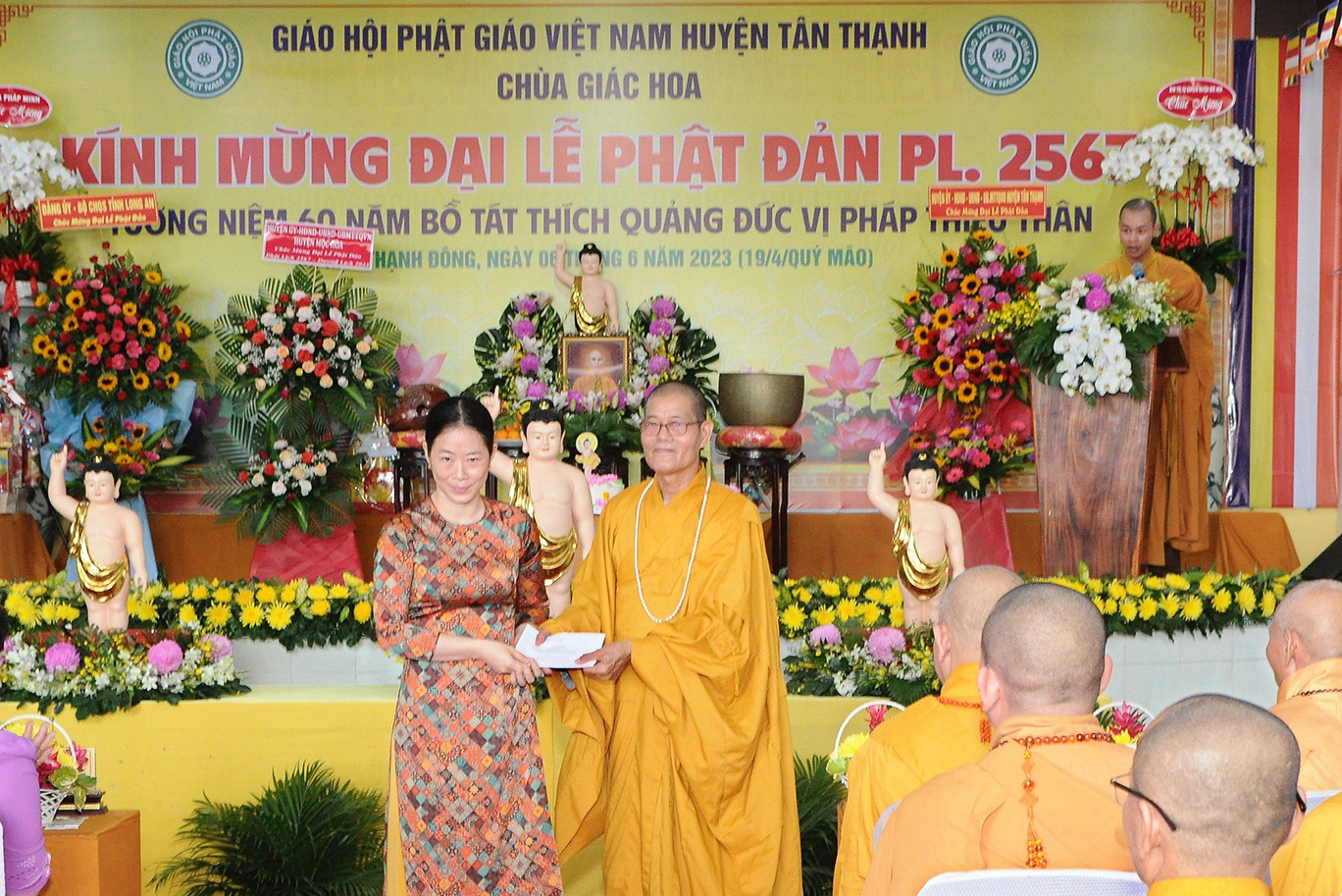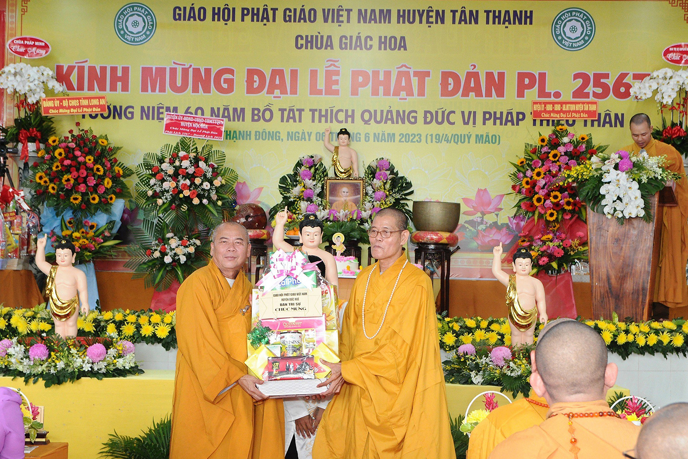 Đãi lao chư tôn đức Ban Chứng minh BTS GHPGVN tỉnh Long An, Hòa thượng Thích Quảng Ý – Chứng minh BTS GHPGVN tỉnh Long An tuyên đọc Thông điệp Phật đản PL.2567 của Đức Pháp chủ GHPGVN. Nội dung trọng tâm được Đức Pháp Chủ nhấn mạnh trong thông điệp: “Mùa Phật đản năm nay, những người Phật tử Việt Nam chúng ta đồng thời thành kính tưởng niệm 60 năm ngày Bồ – tát Thích Quảng Đức vị pháp thiêu thân (1963-2023). Chúng ta tự hào về một giai đoạn lịch sử hào hùng của dân tộc và trong đó có dấu ấn về hạnh nguyện cao cả của Bồ – tát Thích Quảng Đức trên con đường phụng sự Đạo pháp và Dân tộc. Ngọn lửa Từ bi cùng với Trái tim bất diệt của Ngài có năng lực soi sáng và thức tỉnh lương tri của con người, hóa giải tất cả hận thù. Ngọn lửa đó đã chỉ cho mỗi người sống là phải biết vượt lên mọi chủ nghĩa cá nhân ích kỷ hẹp hòi và mọi ý niệm cực đoan. Ngài là biểu tượng sáng ngời của tinh thần Bi, Trí, Dũng của bậc Bồ – tát hiện thế và tinh thần nhập thế của Phật giáo Việt Nam”.