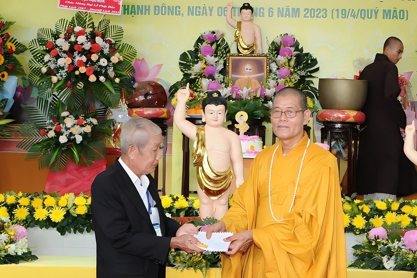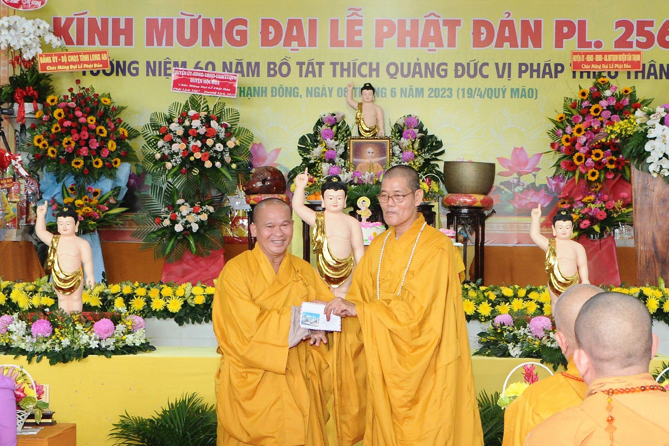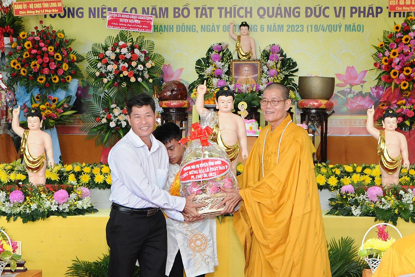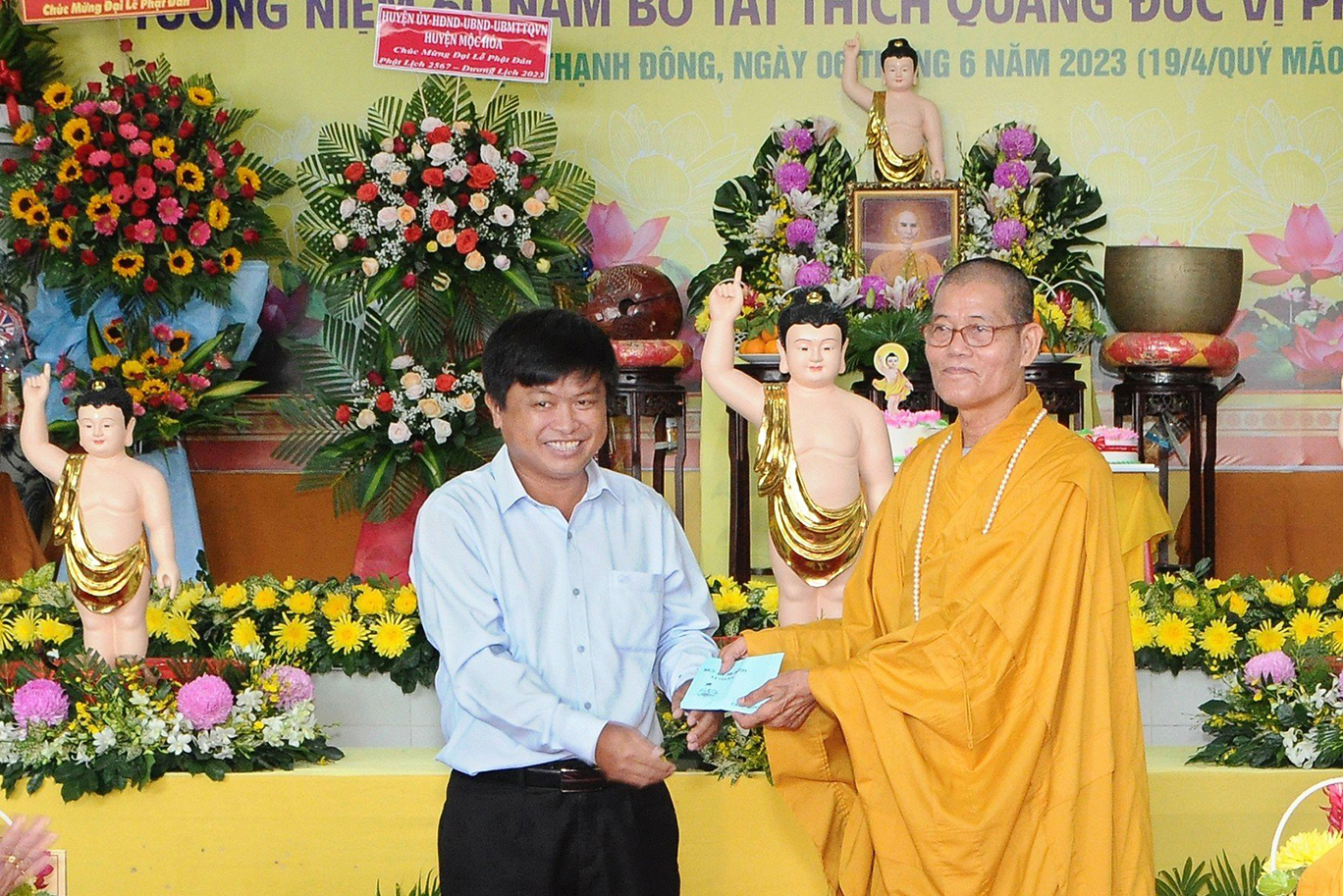 Đãi lao chư tôn đức Ban Chứng minh BTS GHPGVN tỉnh Long An, Hòa thượng Thích Quảng Ý – Chứng minh BTS GHPGVN tỉnh Long An tuyên đọc Thông điệp Phật đản PL.2567 của Đức Pháp chủ GHPGVN. Nội dung trọng tâm được Đức Pháp Chủ nhấn mạnh trong thông điệp: “Mùa Phật đản năm nay, những người Phật tử Việt Nam chúng ta đồng thời thành kính tưởng niệm 60 năm ngày Bồ – tát Thích Quảng Đức vị pháp thiêu thân (1963-2023). Chúng ta tự hào về một giai đoạn lịch sử hào hùng của dân tộc và trong đó có dấu ấn về hạnh nguyện cao cả của Bồ – tát Thích Quảng Đức trên con đường phụng sự Đạo pháp và Dân tộc. Ngọn lửa Từ bi cùng với Trái tim bất diệt của Ngài có năng lực soi sáng và thức tỉnh lương tri của con người, hóa giải tất cả hận thù. Ngọn lửa đó đã chỉ cho mỗi người sống là phải biết vượt lên mọi chủ nghĩa cá nhân ích kỷ hẹp hòi và mọi ý niệm cực đoan. Ngài là biểu tượng sáng ngời của tinh thần Bi, Trí, Dũng của bậc Bồ – tát hiện thế và tinh thần nhập thế của Phật giáo Việt Nam”.