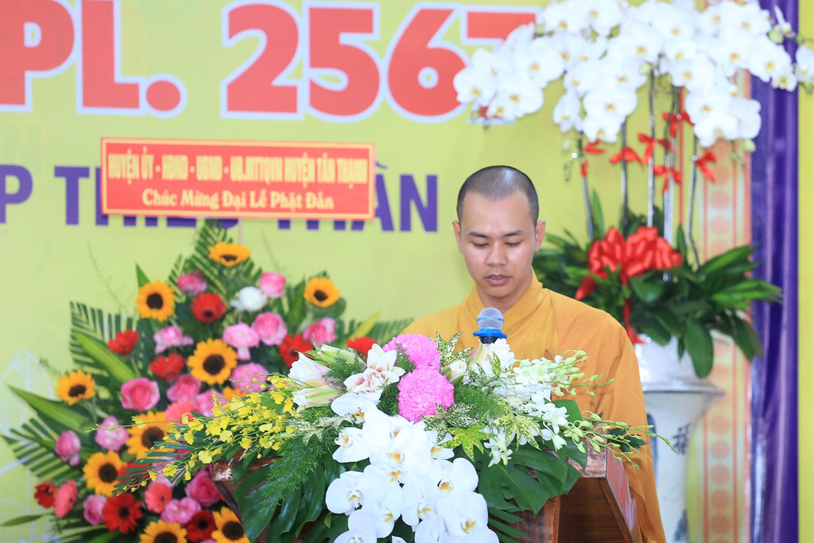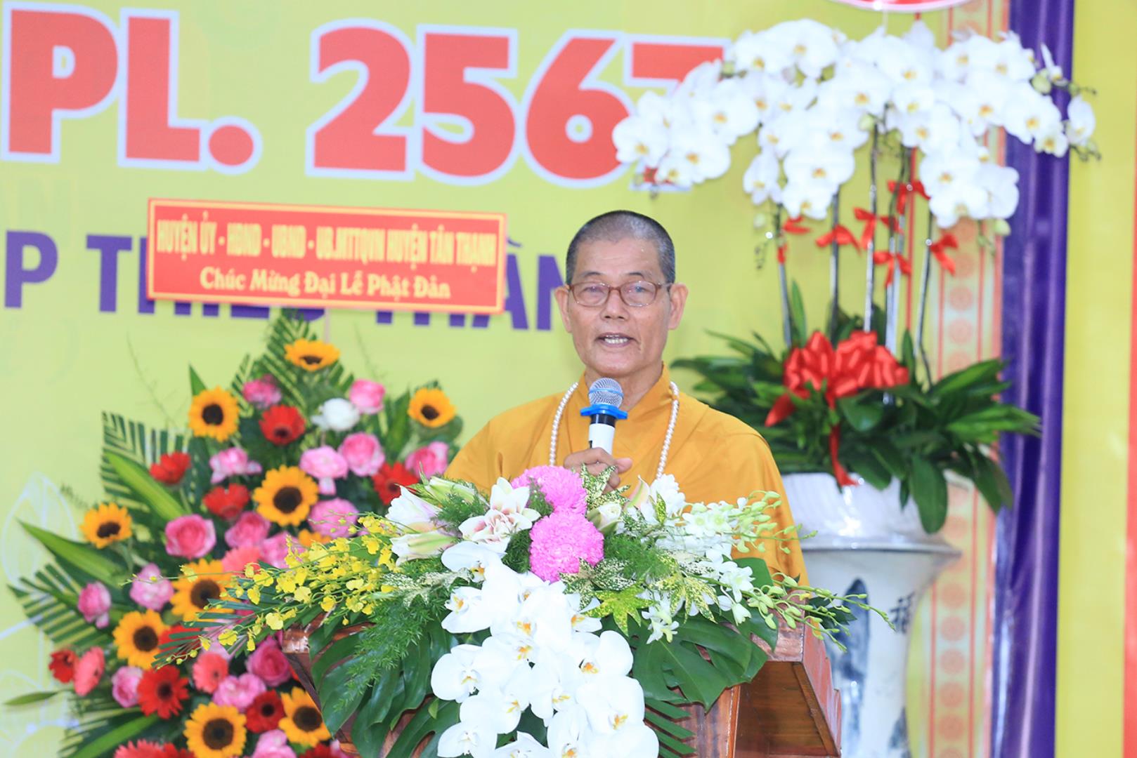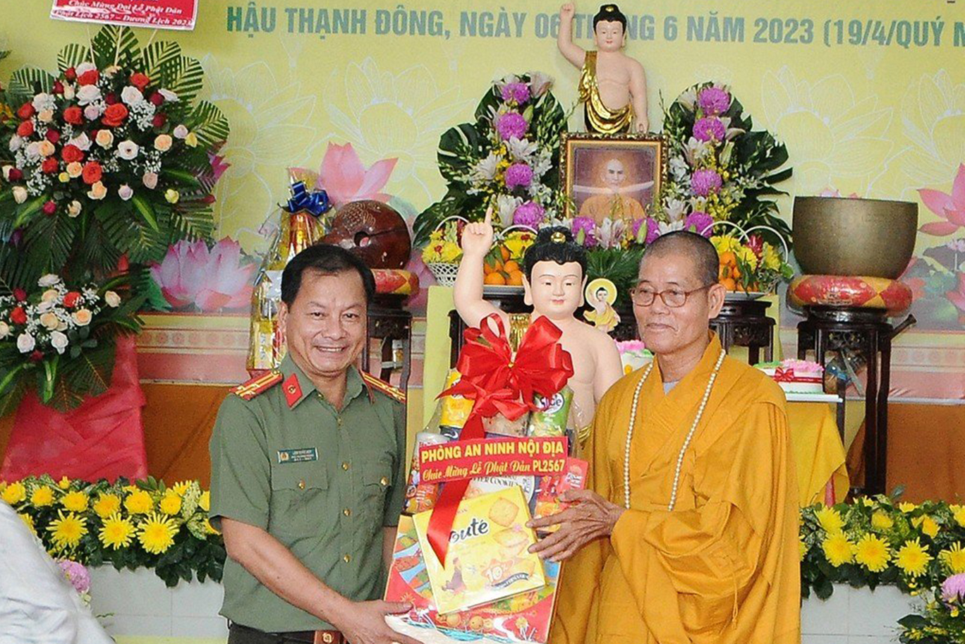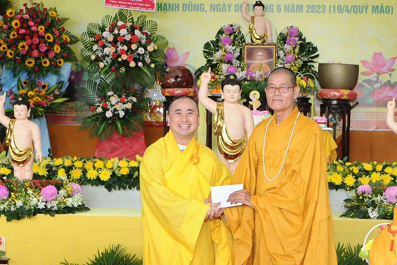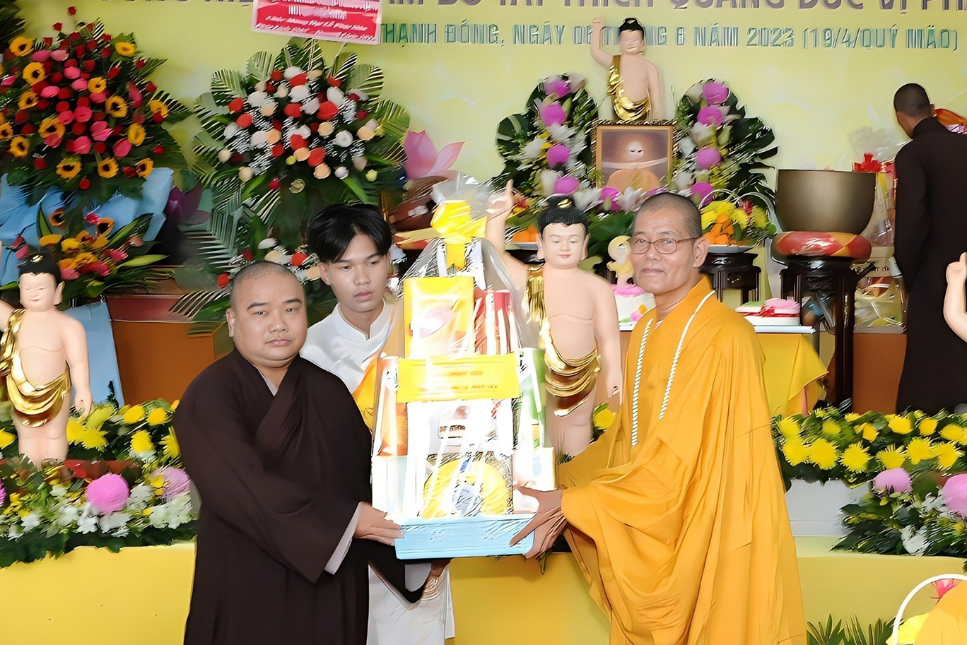 Đãi lao chư tôn đức Ban Chứng minh BTS GHPGVN tỉnh Long An, Hòa thượng Thích Quảng Ý – Chứng minh BTS GHPGVN tỉnh Long An tuyên đọc Thông điệp Phật đản PL.2567 của Đức Pháp chủ GHPGVN. Nội dung trọng tâm được Đức Pháp Chủ nhấn mạnh trong thông điệp: “Mùa Phật đản năm nay, những người Phật tử Việt Nam chúng ta đồng thời thành kính tưởng niệm 60 năm ngày Bồ – tát Thích Quảng Đức vị pháp thiêu thân (1963-2023). Chúng ta tự hào về một giai đoạn lịch sử hào hùng của dân tộc và trong đó có dấu ấn về hạnh nguyện cao cả của Bồ – tát Thích Quảng Đức trên con đường phụng sự Đạo pháp và Dân tộc. Ngọn lửa Từ bi cùng với Trái tim bất diệt của Ngài có năng lực soi sáng và thức tỉnh lương tri của con người, hóa giải tất cả hận thù. Ngọn lửa đó đã chỉ cho mỗi người sống là phải biết vượt lên mọi chủ nghĩa cá nhân ích kỷ hẹp hòi và mọi ý niệm cực đoan. Ngài là biểu tượng sáng ngời của tinh thần Bi, Trí, Dũng của bậc Bồ – tát hiện thế và tinh thần nhập thế của Phật giáo Việt Nam”.