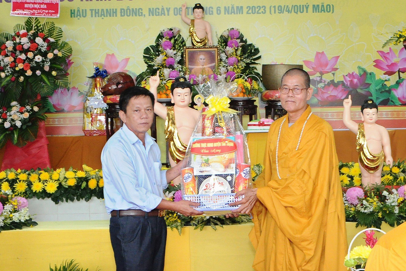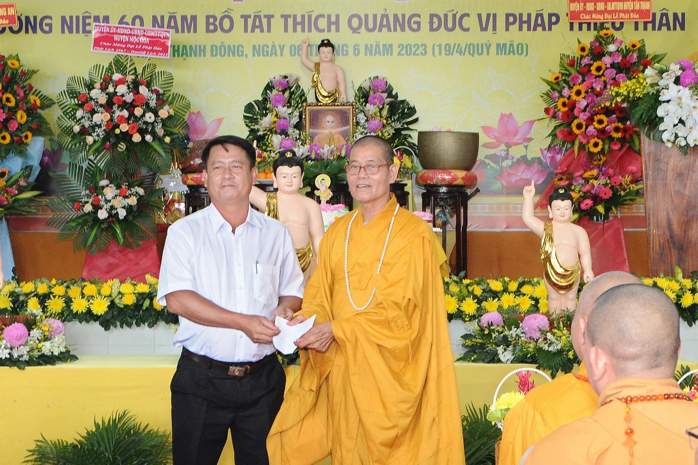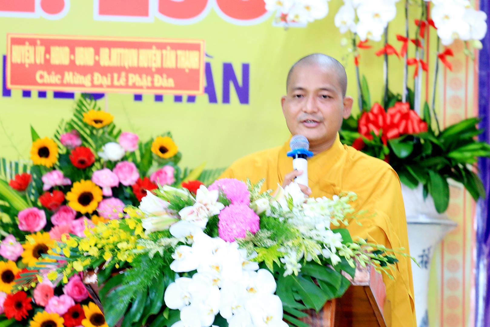 Đại diện các cấp lãnh đạo chính quyền, ông Hà Thanh Chì đọc thư chúc mừng của Chủ tịch UBND tỉnh Long An gửi đến Tăng Ni, Phật tử tỉnh nhân dịp mùa Phật đản năm nay. Sau đó ông có lời phát biểu tại buổi lễ với những cảm xúc khi được dự buổi lễ kính mừng Phật đản và lễ tưởng niệm Bồ tát Thích Quảng Đức. Ông đã nói về sự vĩ đại của đức Phật cũng như lời dạy của Ngài. Bên cạnh đó, ông cũng bày tỏ niềm xúc cảm về việc vị pháp thiêu thân cao quý của Bồ tát Thích Quảng Đức, đã để lại Trái tim bất diệt minh chứng cao quý cho sự thành công trong công cuộc chống lại chính sách của chính quyền bấy giờ. Ông tin tưởng với sự lãnh đạo của Hòa thượng Trưởng BTS PG tỉnh Long An, Phật giáo sẽ tiếp tục đồng hành cùng dân tộc, ngày càng phát triển vững mạnh, đem lại nhiều lợi ích cho đồng bào, nhân dân theo đúng những gì đức Phật dạy và theo đúng quy định của Giáo hội.