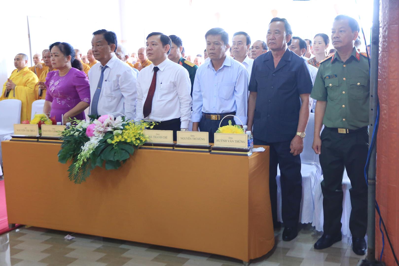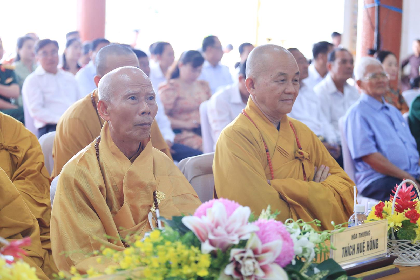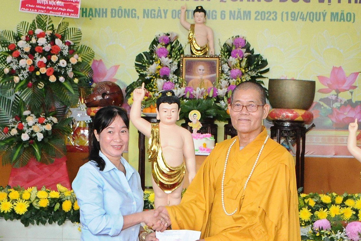 Quang lâm chứng minh và tham dự buổi lễ có: HT. Thích Huệ Hồng, HT. Thích Quảng Ý – đồng Chứng minh BTS GHPGVN tỉnh Long An; HT. Thích Minh Thiện – UV HĐTS, Phó ban Hoằng pháp TW, Trưởng BTS GHPVN tỉnh Long An, Chứng minh BTS GHPGVN huyện Đức Hòa; TT. Thích Quảng Tâm – UV HĐTS, Phó ban Từ thiện Xã hội TW, Phó Trưởng ban Thường trực BTS GHPGVN tỉnh; ĐĐ. Thích Lệ Duyên – Phó ban kiêm Chánh Thư ký BTS GHPGVN tỉnh, Trưởng BTS GHPGVN huyện, Trưởng ban Tổ chức; TT. Thích Nhuận Thành – Trưởng ban Kinh tế Tài chính GHPGVN tỉnh; TT. Thích Phước Cường – Trưởng ban Nghi lễ GHPGVN tỉnh; ĐĐ. Thích Thiện An – Trưởng BTS GHPGVN huyện Đức Huệ; NT. TN. Như Hương – Chứng minh Phân ban Ni giới GHPGVN huyện Thạnh Hóa; Chư tôn đức Ban Thường trực BTS GHPGVN tỉnh Long An, huyện Tân Thạnh, chư tôn đức Tăng Ni đồng về tham dự.
