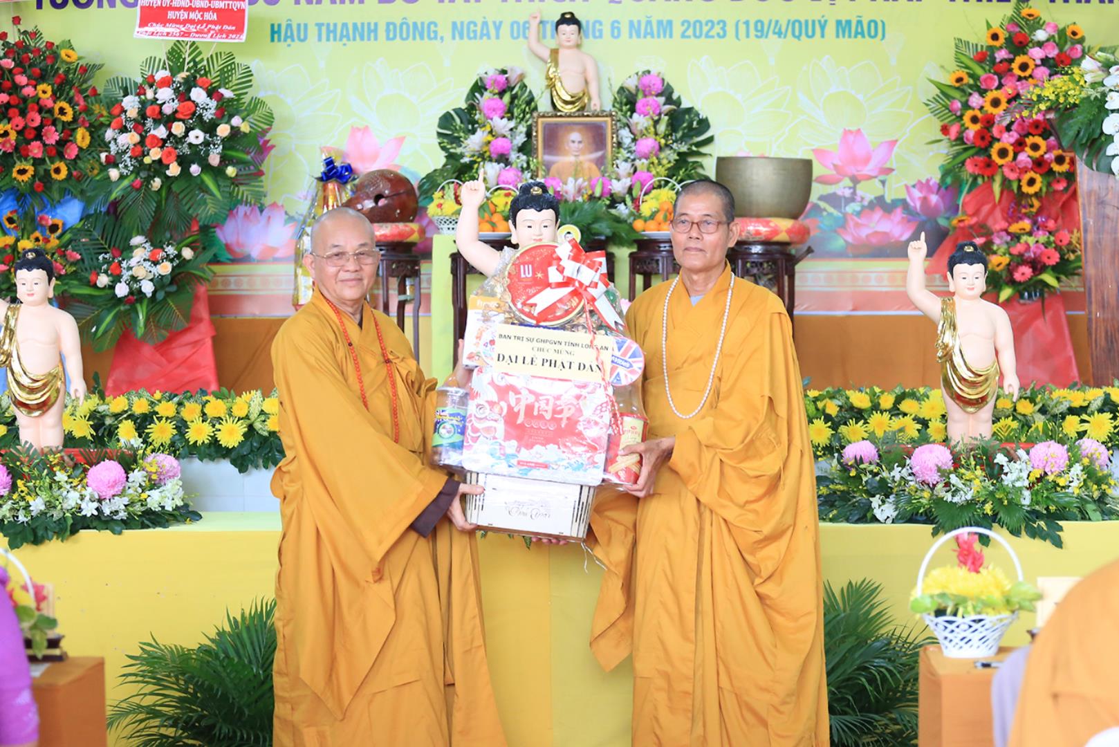 Tại buổi lễ Ban tổ chức đã được đón nhận nhiều lẵng hoa, phần quà quý báu từ Chư tôn đức Ban Trị sự các huyện thị trực thuộc tỉnh, Chư tôn đức Tăng Ni trụ trì các Tự viện, quý chức sắc đại diện Tôn giáo bạn, quý lãnh đạo chính quyền khách quý, ban ngành đoàn thể, hội đồng bào cộng đồng doanh nghiệp, Phật tử chúc mừng.