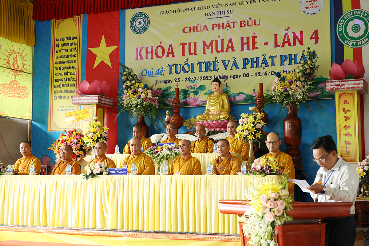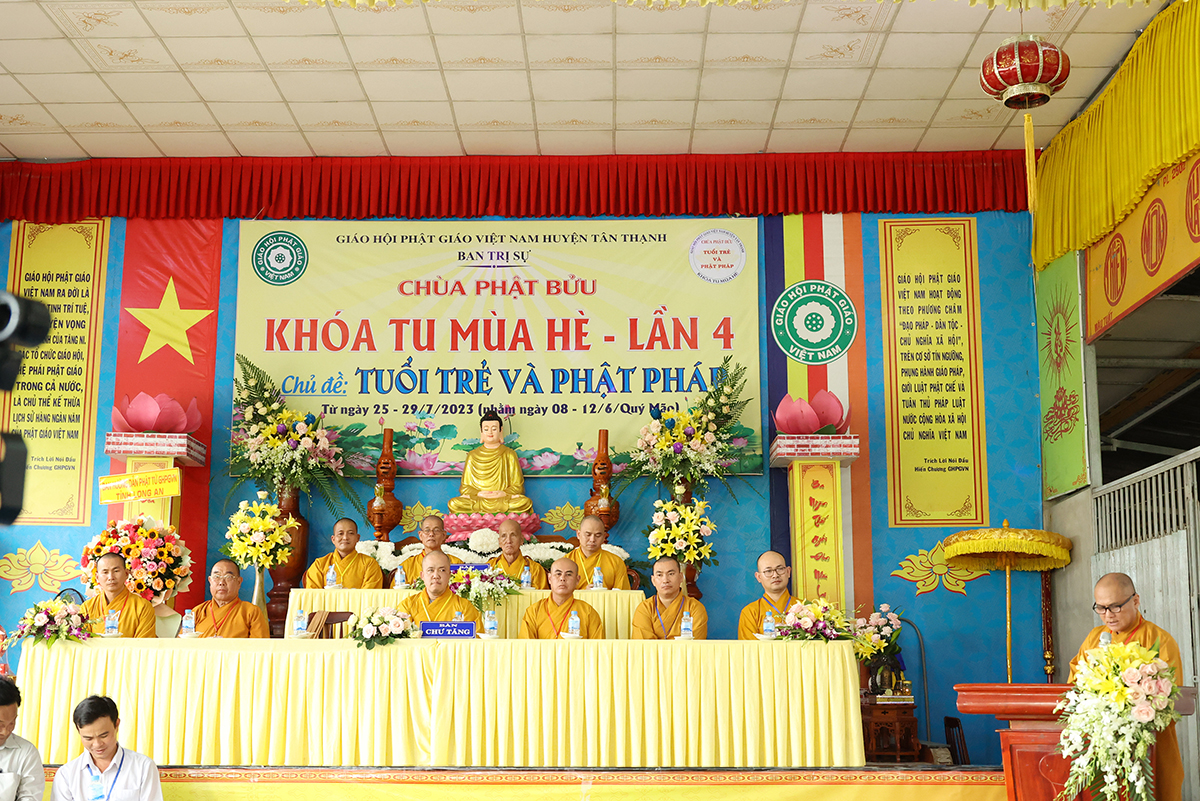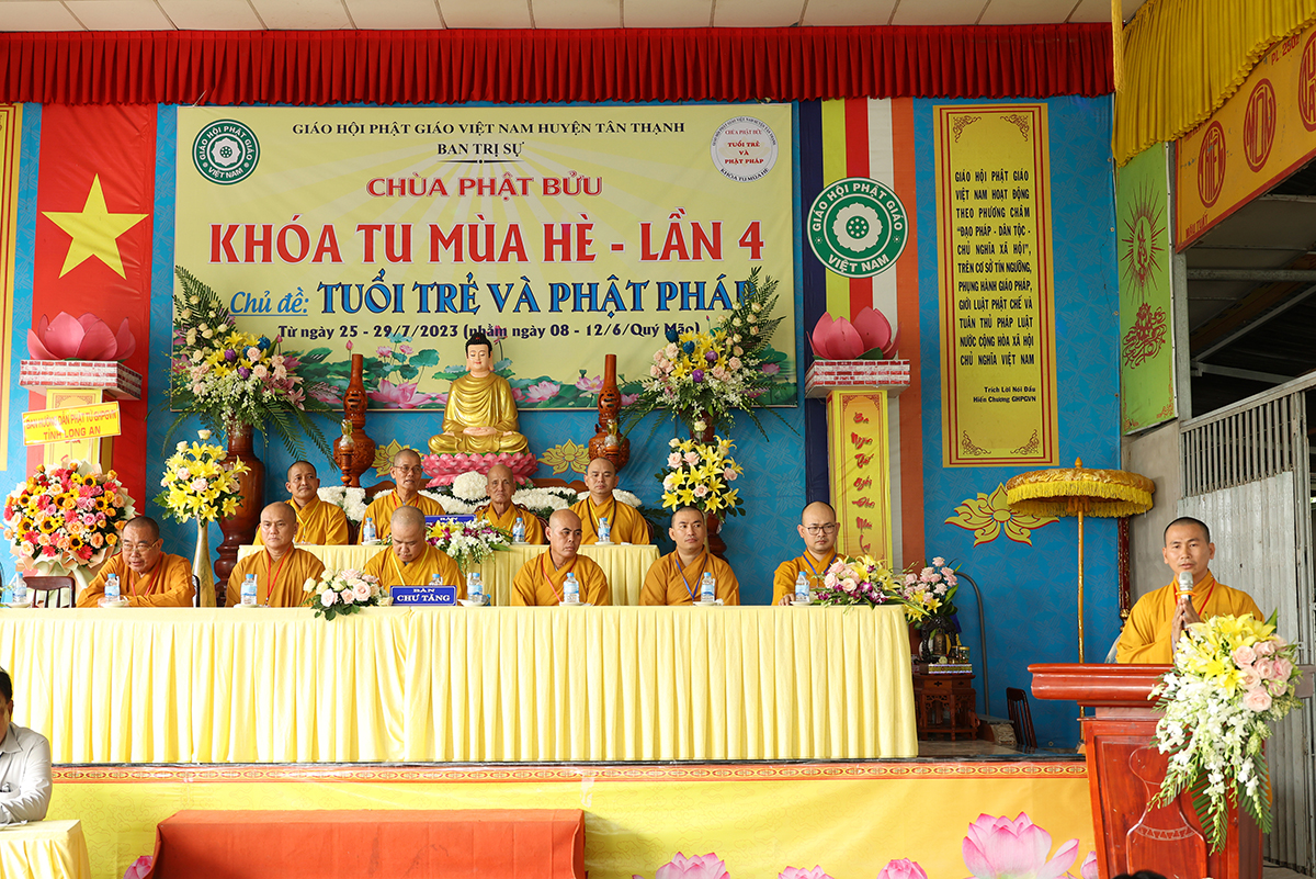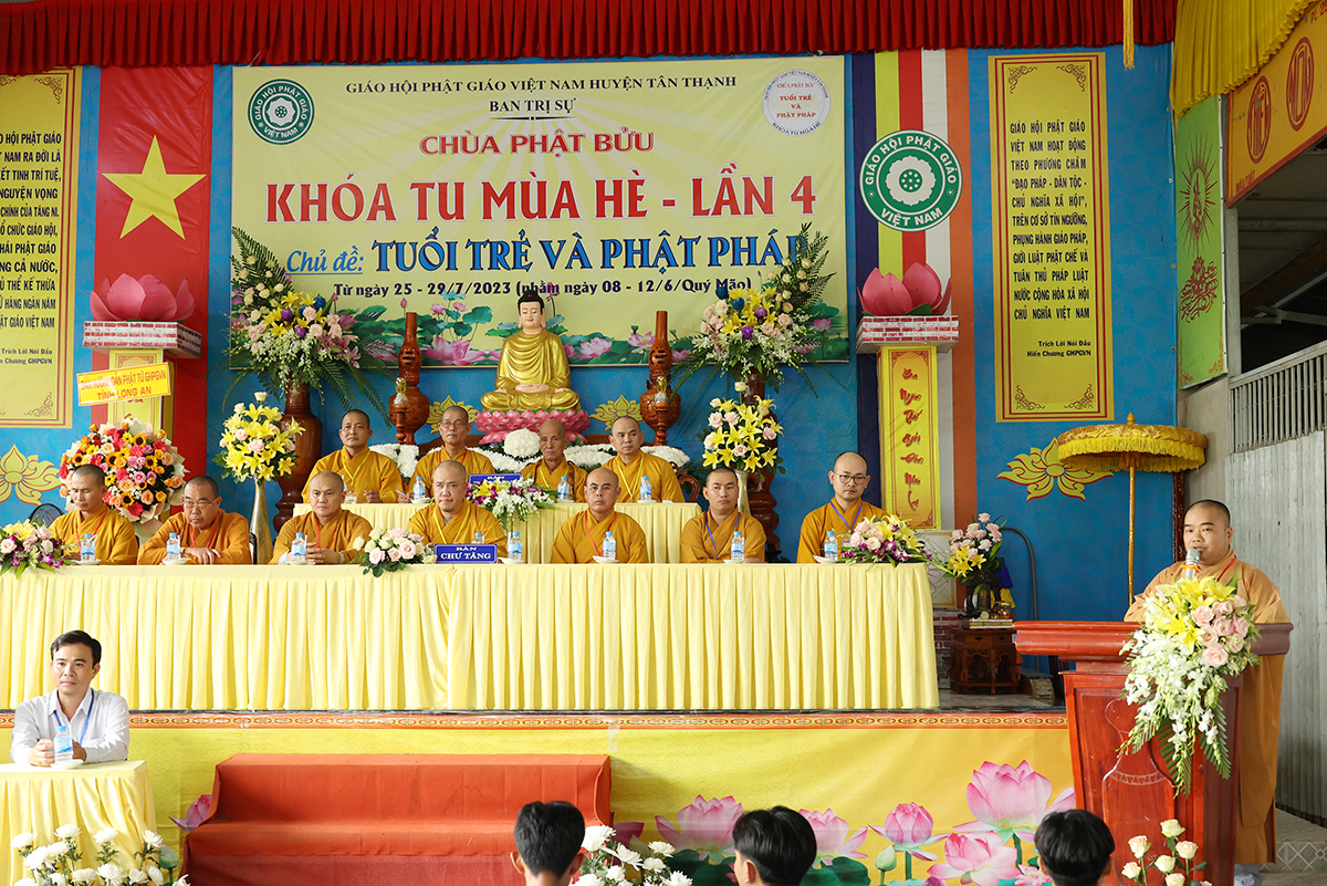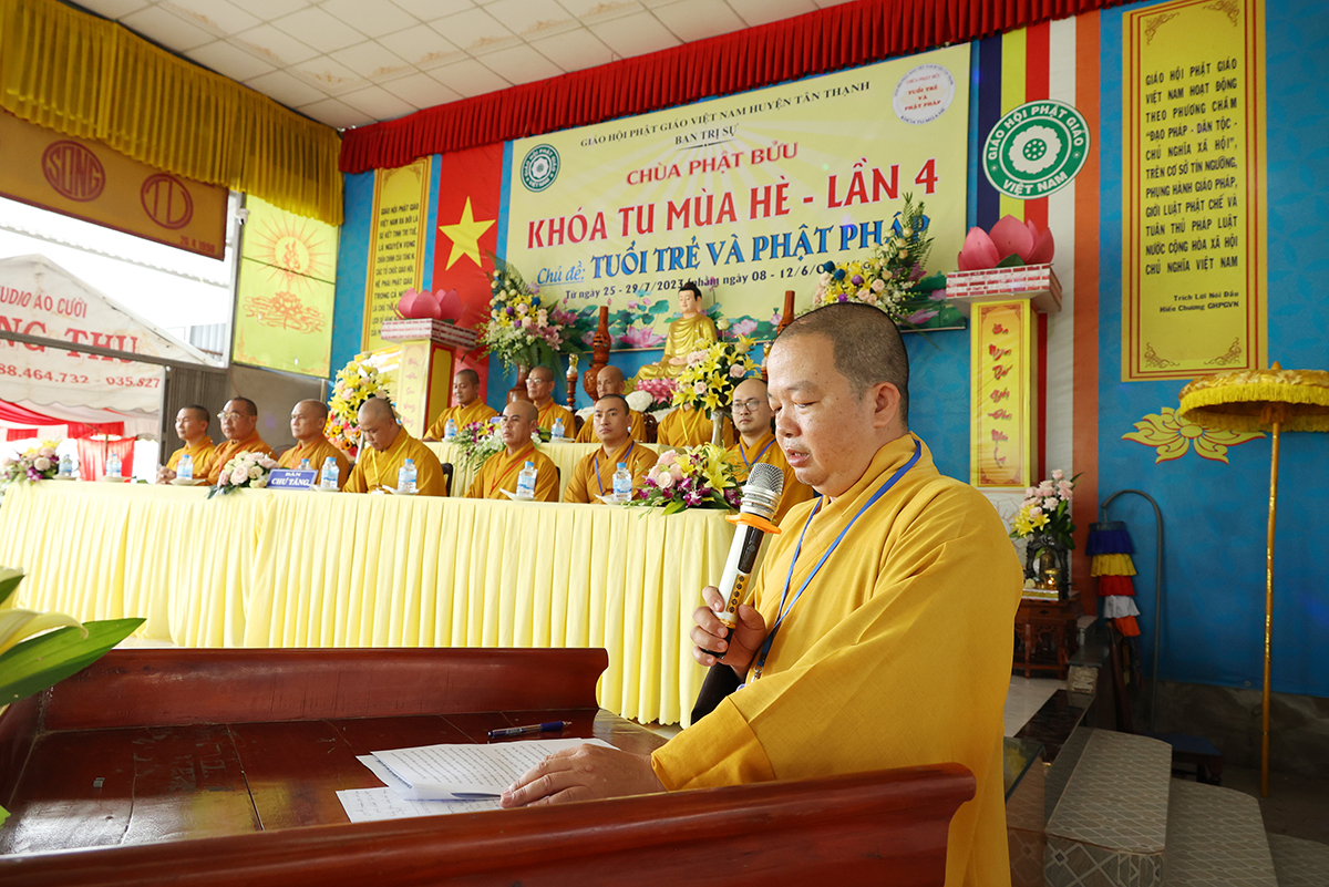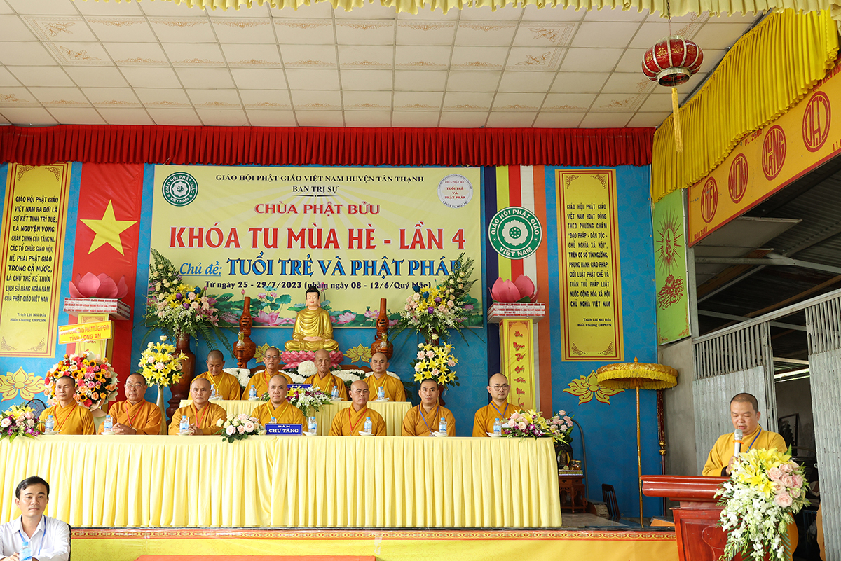 Sau phần Tuyên bố lý do, TT. Thích Lệ Tấn đã thay mặt BTC phát biểu khai mạc, với những lời tri ân chư Tôn đức cùng các cấp chính quyền đã tạo điều kiện thuận lợi cho khoa tu được diễn ra TT đã long trọng tuyên bố chính thức Khai mạc khoá tu mùa hè lần thứ 4.