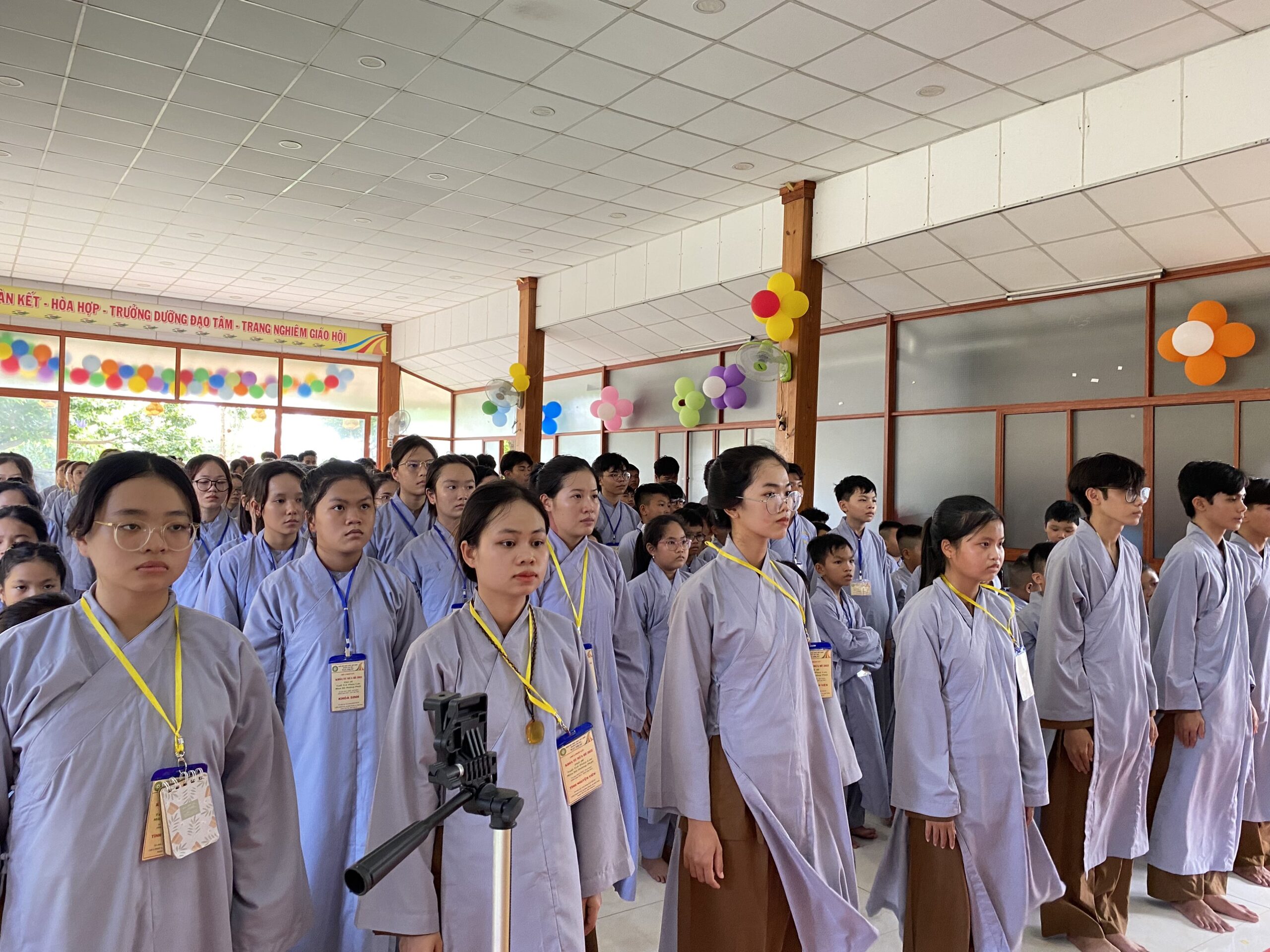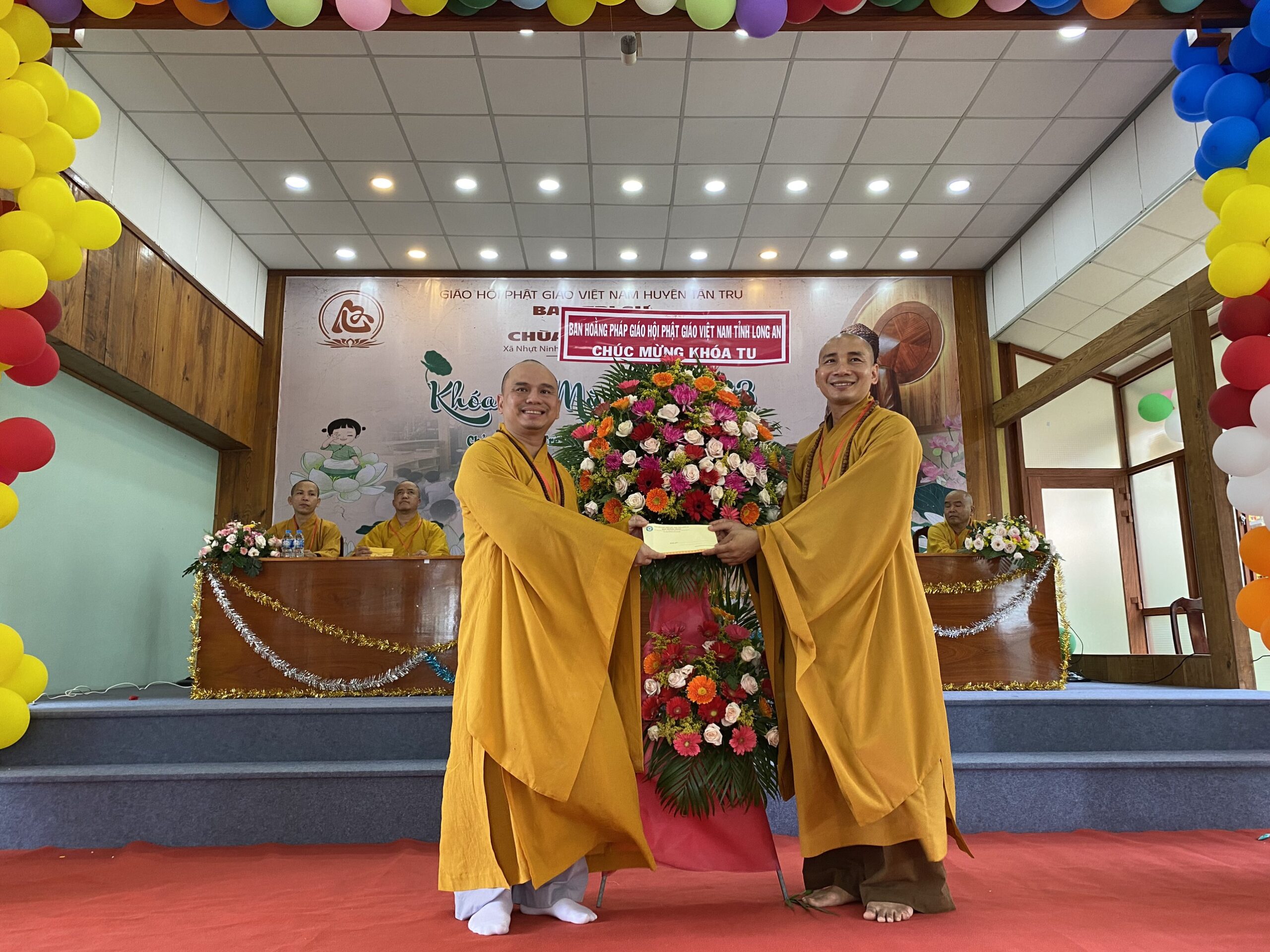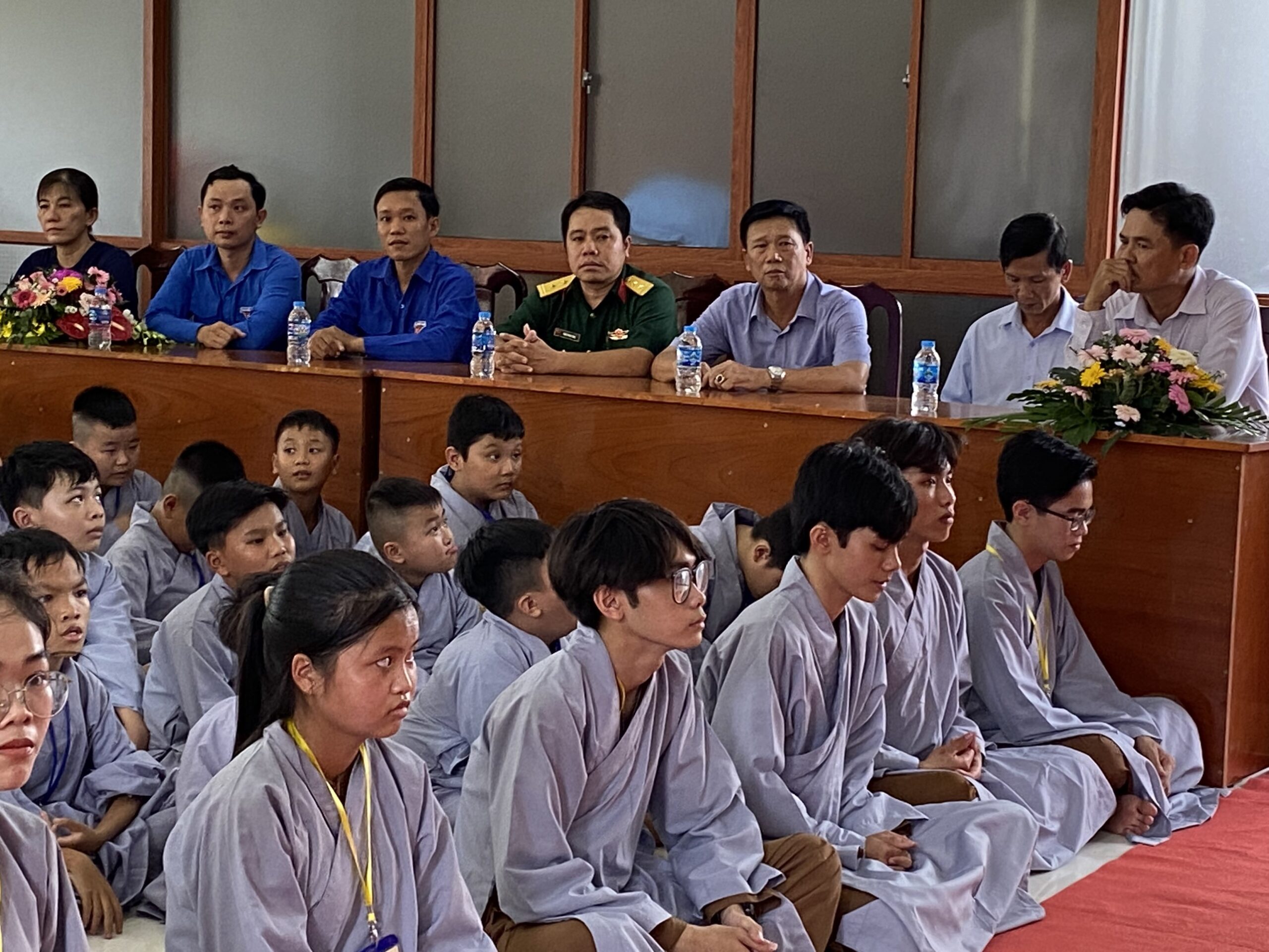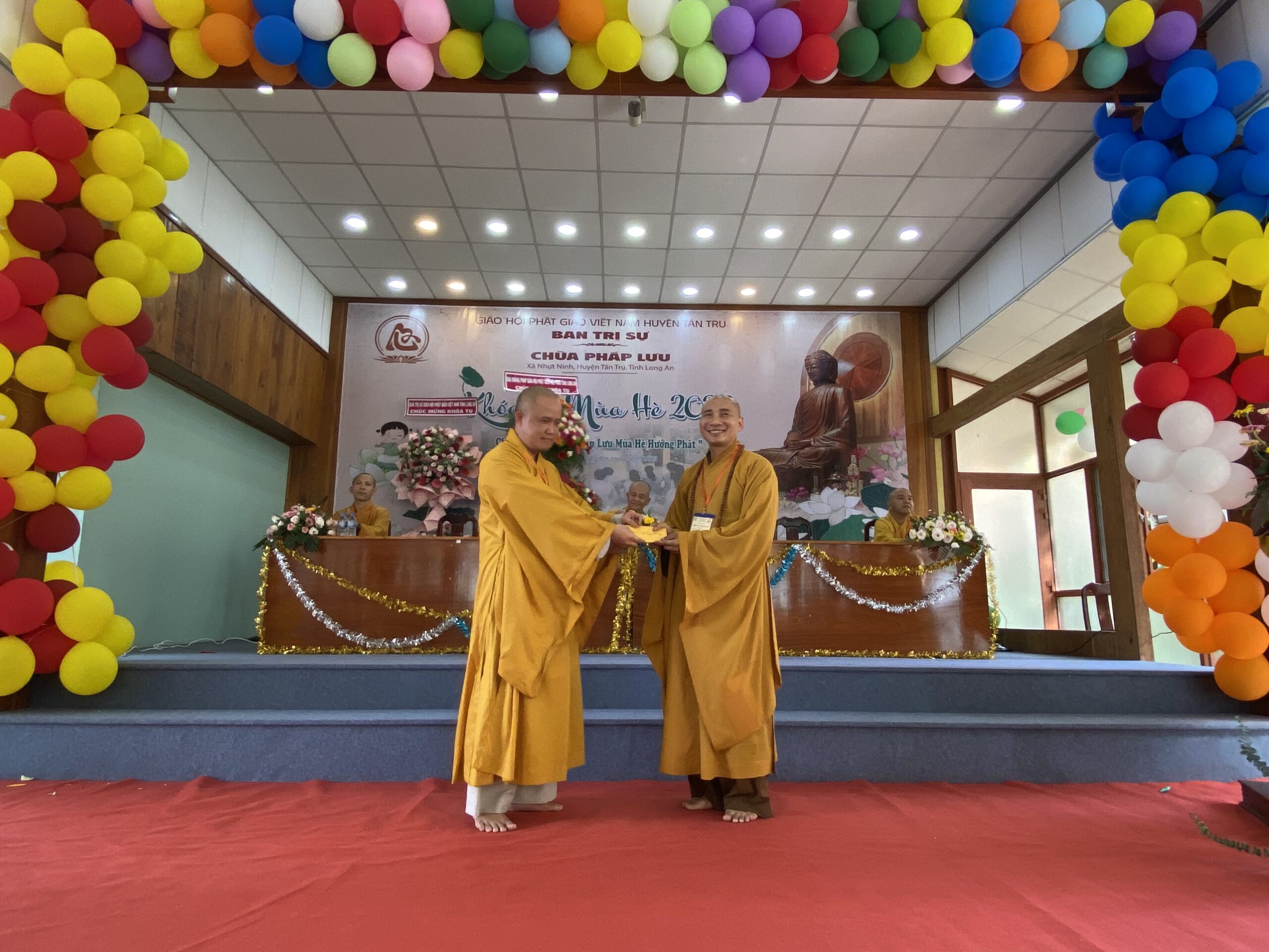 Chứng minh tham dự buổi lễ có Hòa thượng Thích Minh Thiện – UV HĐTS, Phó Trưởng Ban Hoằng pháp TƯ, Trưởng BTS GHPGVN tỉnh Long An; Đại đức Thích Lệ Ngôn- Phó Ban Trị sự kiêm trưởng Ban Hoằng Pháp GHPGVN tỉnh Long An; Đại đức Thích An Nhựt- Trưởng Ban Hướng dẫn Phật tử tỉnh Long An; Thượng toạ Thích Thiện Phước- CM BTS GHPGVN huyện Tân Trụ, Đại đức Thích Huệ Chơn Uỷ viên Ban Trị sự GHPGVN tỉnh Long An, Phó Trưởng ban Thường trực Ban Trị sự GHPGVN huyện Tân Trụ; cùng quý Chư tôn đức trong Ban Trị sự tỉnh, Chư tôn đức trong Ban Trị sự huyện và hơn 600 em khoá sinh đồng tham dự.