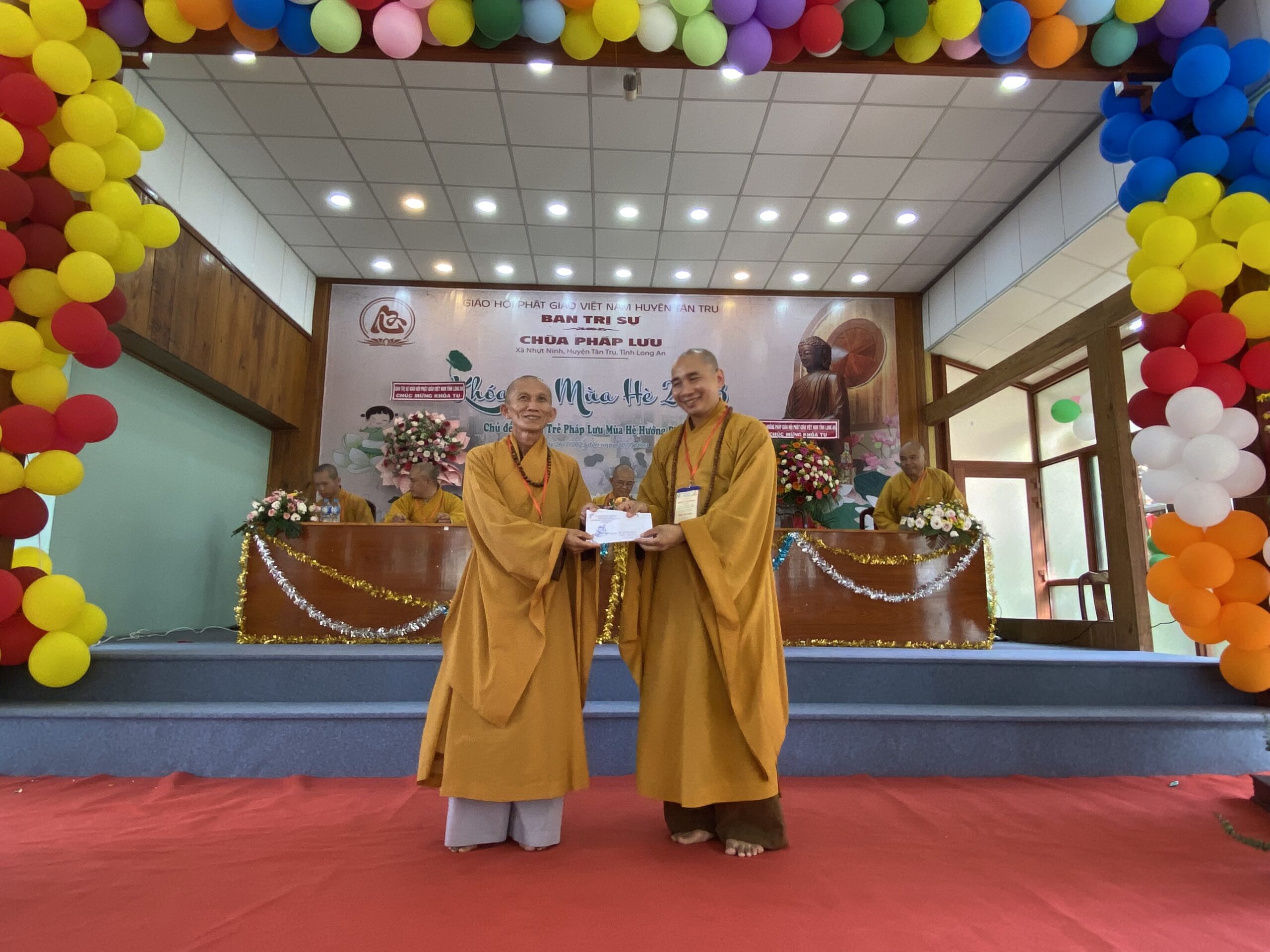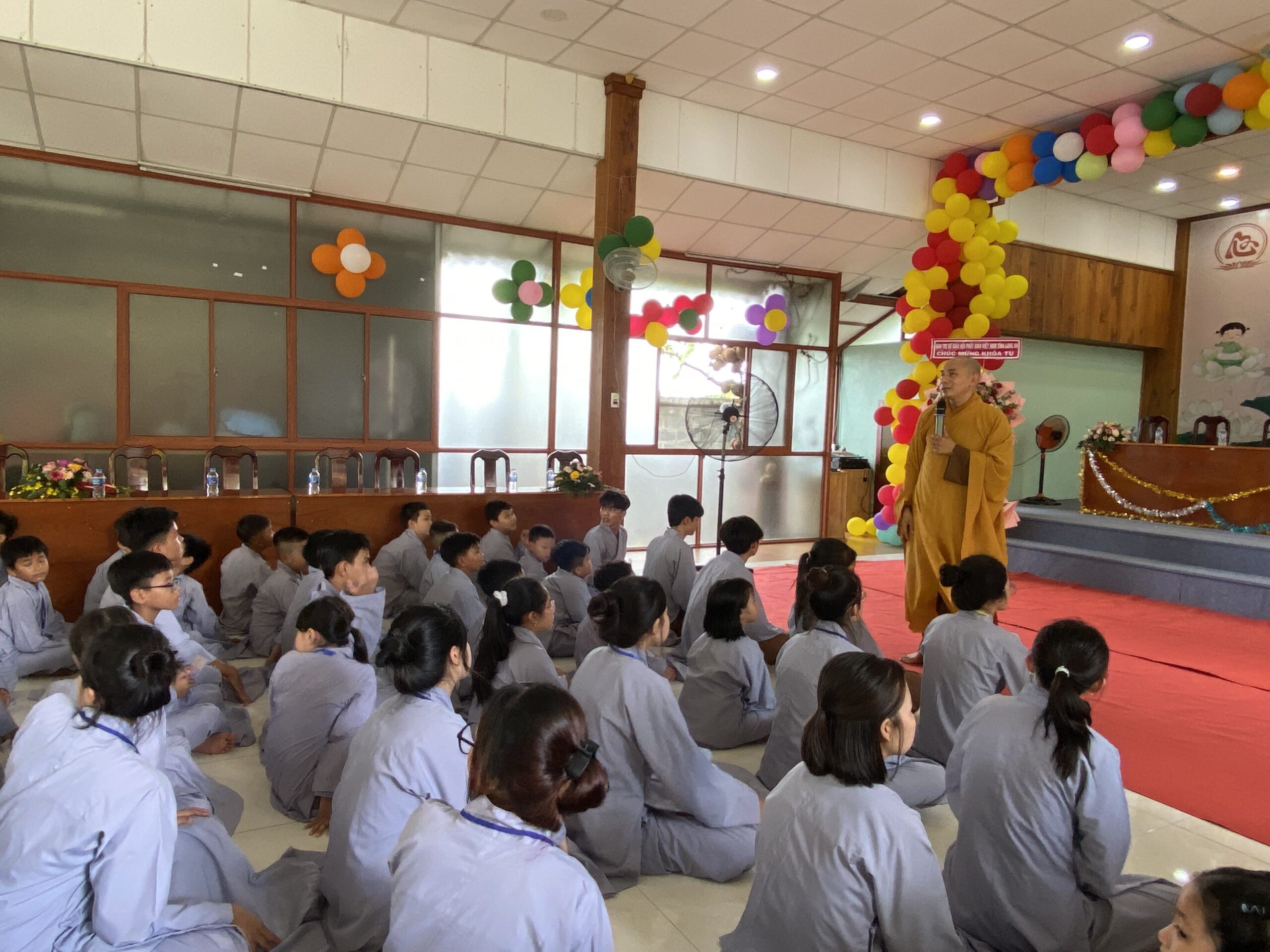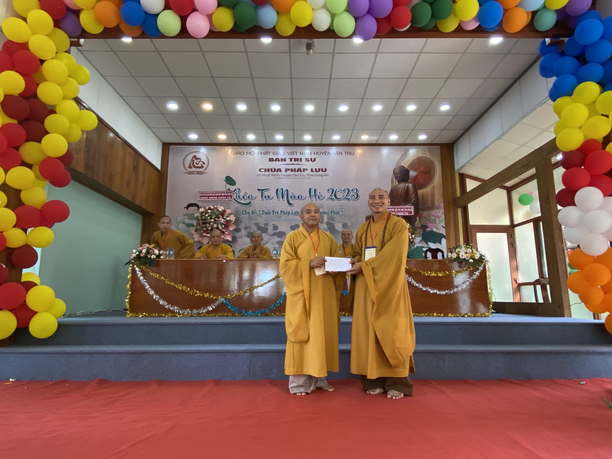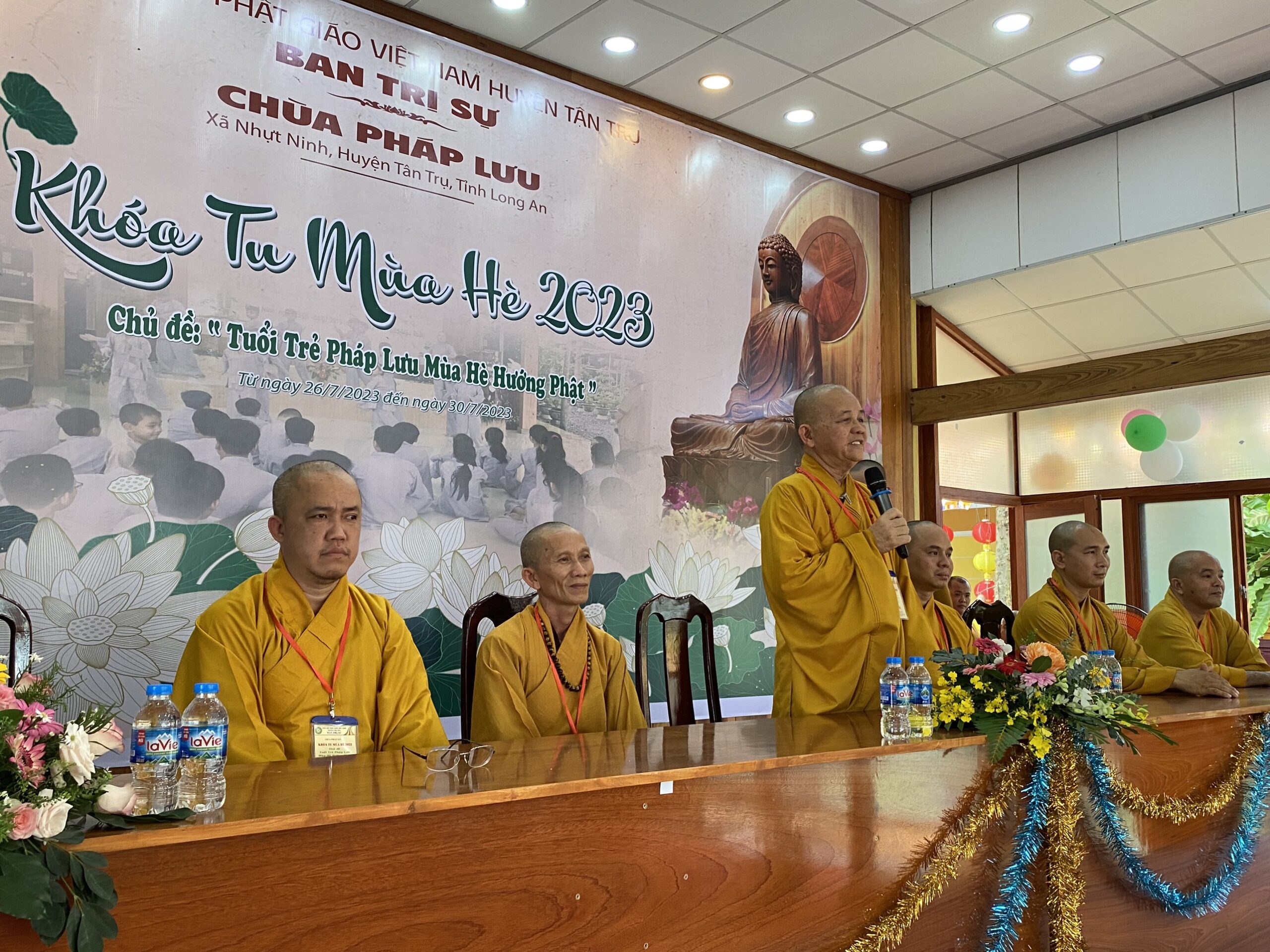 Buổi lễ được lắng nghe lời đạo từ cao quý của HT. Thích Minh Thiện – Uỷ viên HĐTS, Phó Trưởng Ban Hoằng pháp TƯ, Trưởng BTS GHPGVN tỉnh Long An có lời sách tấn tại buổi lễ. Lời đầu tiên, Hòa thượng có lời vấn an trân trọng, tri ân và lời chúc tốt đẹp nhất đến toàn thể hội trường. Khóa tu mùa hè tại huyện Tân Trụ diễn ra với mục đích nêu cao tinh thần từ bi, trí tuệ của đạo Phật, hướng các em trở thành một công dân có ích, có lòng yêu nước, biết ơn và đền ơn theo truyền thống của dân tộc Việt Nam. Đồng thời hướng các em hiểu rõ giá trị hy sinh của ông cha qua thời kỳ giữ nước dựng nước, tri ân các anh hùng chiến sĩ đã hy sinh cho tự do độc lập nước nhà. Hòa thượng đã nêu rõ tám gương hy sinh các bậc tiền bối hữu công, trong đó có tấm gương của Chư tôn Hòa thượng lãnh đạo giáo hội tỉnh nhà trong thời kỳ đấu tranh giải phóng dân tộc, đó là sự hòa mình cống hiến giữ đạo và đời, góp phần xây dựng khối đại đoàn kết toàn dân tộc.Ngoài ra còn bồi dưỡng cho các em một số kỹ năng có ích trong cuộc sống đời thường. Hòa thượng mong muốn sau khóa tu, các em sống với tinh thần: “Không làm các việc ác, siêng làm các việc lành, giữ tâm ý thanh tịnh, hiếu hòa, hiếu kính với tổ tiên ông bà cha mẹ”.