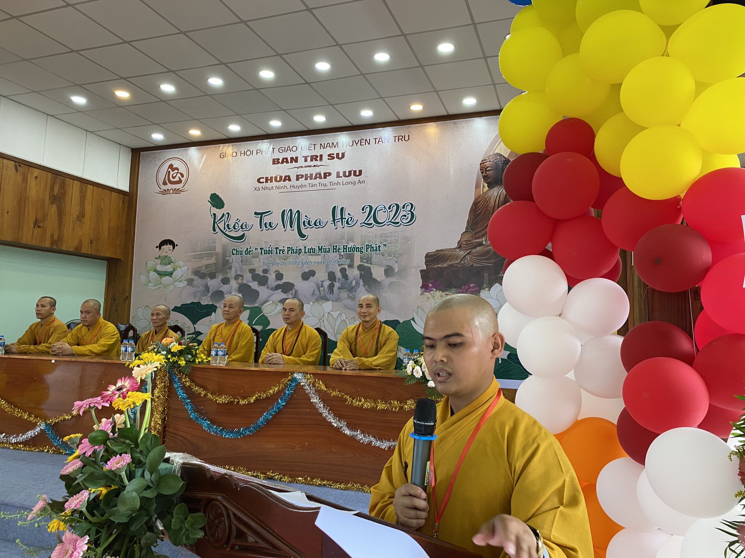 Sau phần Tuyên bố lý do, Đại đức Thích Huệ Chơn – Ủỷ viên BTS GHPGVN tỉnh Long An – Phó Trưởng ban Thường trực BTS GHPGVN huyện Tân Trụ, Trưởng Ban tổ chức khóa tu đã thay mặt BTC phát biểu khai mạc, với những lời tri ân chư Tôn đức cùng các cấp chính quyền đã tạo điều kiện thuận lợi cho khóa tu đồng thời long trọng tuyên bố chính thức Khai mạc khoá tu mùa hè lần thứ 3 với chủ đề “ Mùa hè hướng Phật”.