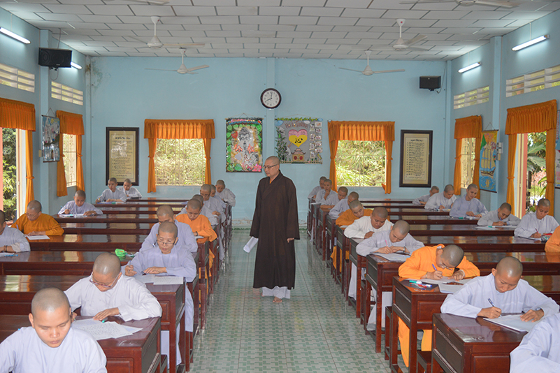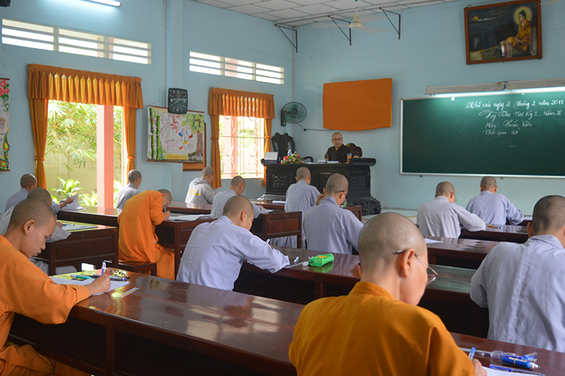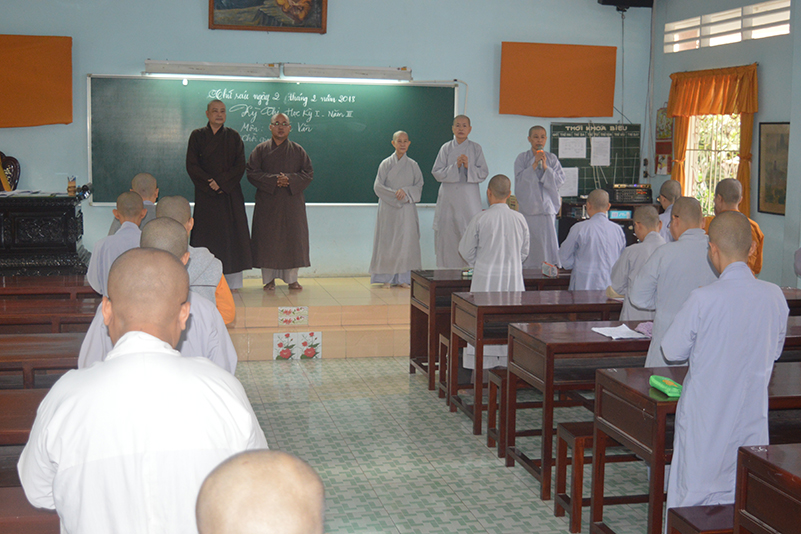 Nhằm kiểm tra kiến thức, cũng như tạo điều kiện cho các Tăng Ni sinh ôn tập và cô đọng lại bài học một cách logic hơn, sau thời gian tiếp thu ở giảng đường, sáng nay, ngày 02/2/2018 (17/12/Đinh Dậu), Ban giám hiệu Trường Trung Cấp Phật Học Long An đã tổ chức kỳ thi học kỳ I, năm thứ III cho Tăng Ni sinh khóa VI  thuộc 2 cơ sở, lớp Tăng tại Chùa Thiên Khánh và lớp Ni tại Chùa Thiên Phước.