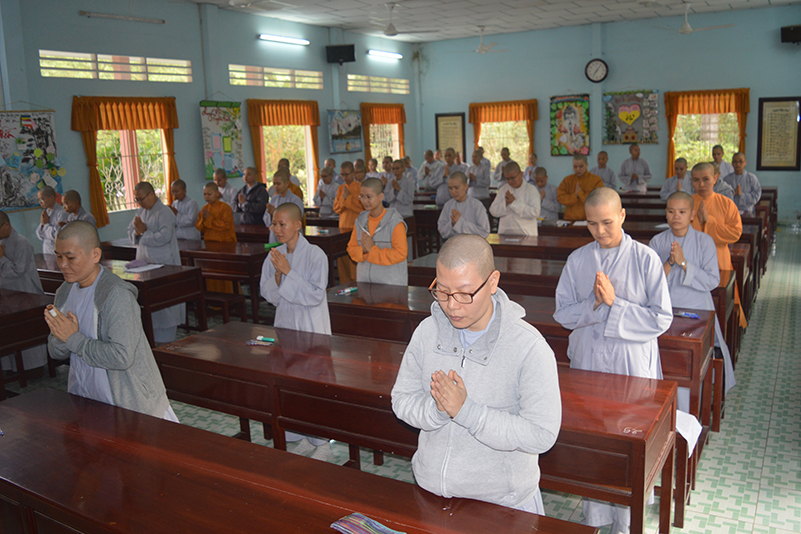 Toàn thể Tăng Ni sinh khoá VI trường Trung Cấp Phật học Long An bước vào ngày thi đầu tiên của học kỳ I, năm thứ 3 với môn thi Hán văn của Đạo hữu Minh Thông. Được sự chỉ dạy của HT Thích Minh Thiện- Hiệu trưởng Trường Trung cấp Phật học Long An- Đại đức Thích Lệ Trí – Hiệu phó trường Trung cấp Phật học Long An và Ni sư Thích Nữ Tuệ Đăng- Hiệu phó Trường Trung cấp Phật học Long An, cơ sở 2, lớp Ni có vài lời sách tấn Ni sinh trước khi đặt bút làm bài thi đầu tiên.  Ban Giám hiệu đã khích lệ và ân cần dặn dò các Tăng Ni sinh làm bài tốt. Tăng Ni sinh viết ra những suy nghĩ của mình sau khi tiếp thu và chắc lọc những điều đã học và đọc được từ sách vở.