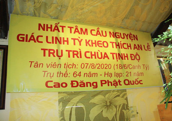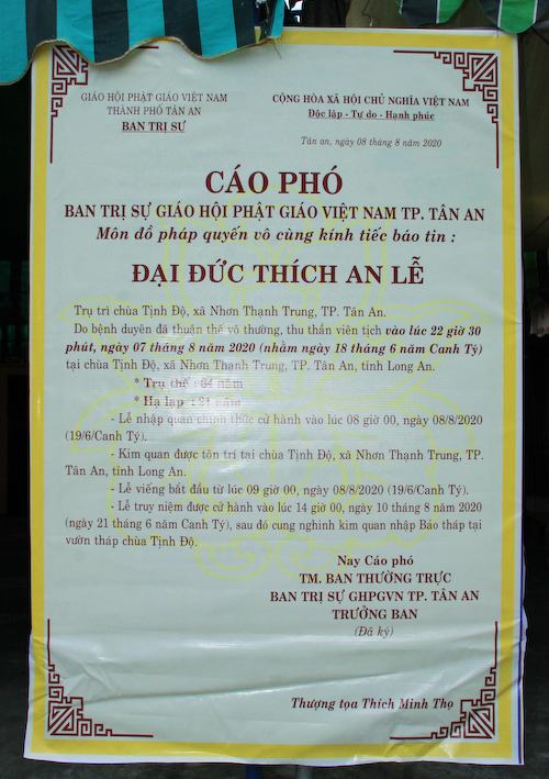 Sáng 8g ngày 19/6/ Canh Tý (ngày 8/8/ 2020), Pháp quyến Tông Thiên Thai Giáo Quán tiến hành lễ nhập quan Cố Đại đức Thích An Lễ, nguyên trụ trì chùa Tịnh Độ, xã Nhơn Thạnh Trung, Tp.Tân An, tỉnh Long An.