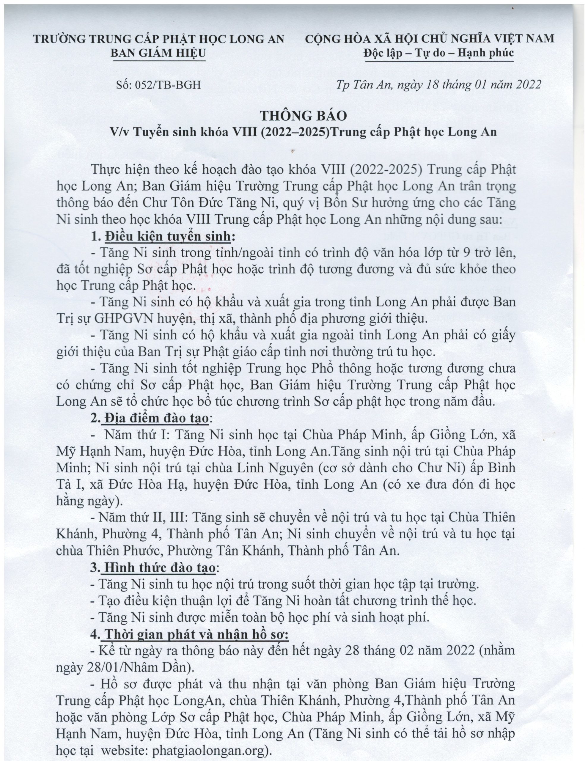 Ban Giám hiệu Trường Trung cấp Phật học Long An thông báo tuyển sinh khóa VIII (2022-2025) Trung cấp Phật học Long An như sau:(toàn bộ tập tin hồ sơ khóa học sẽ được để bên dưới để tải về)