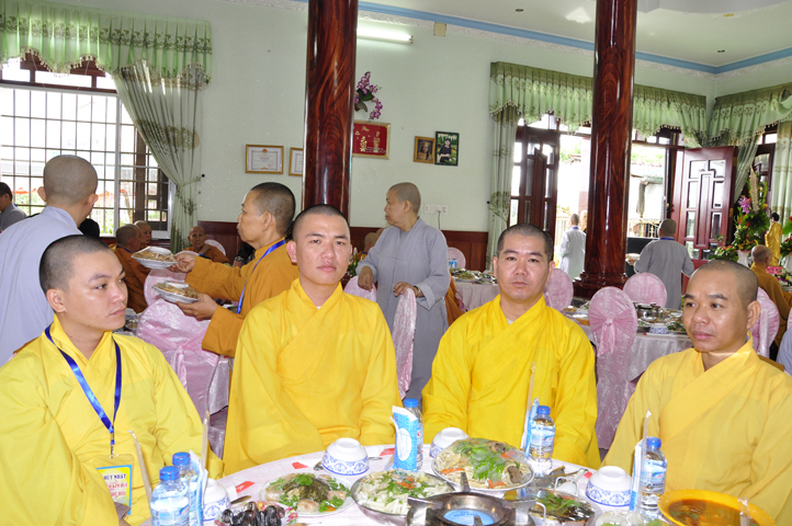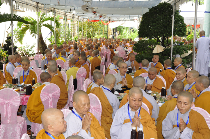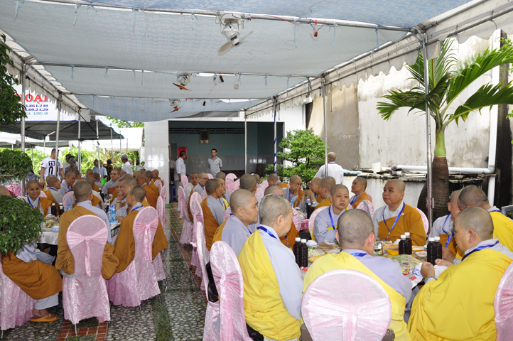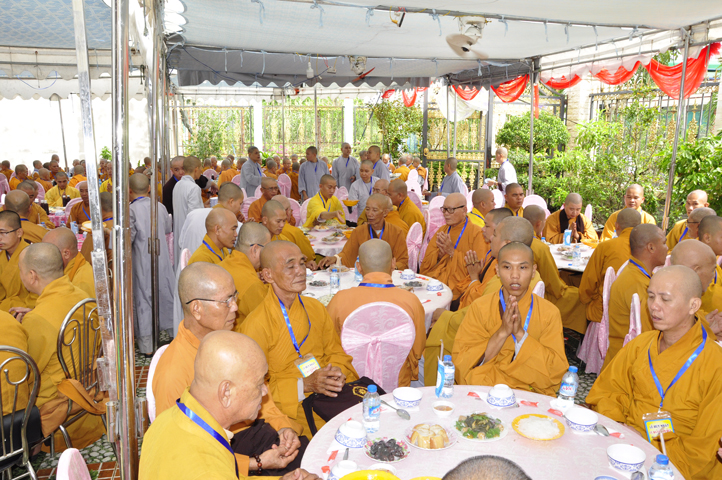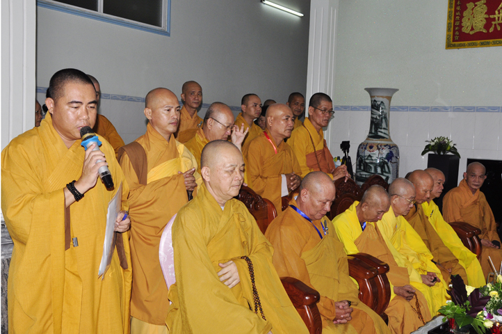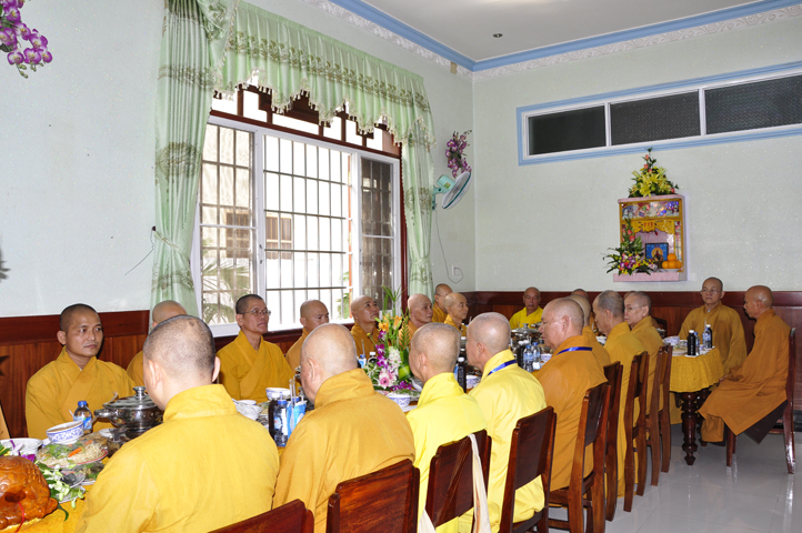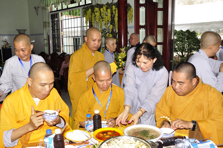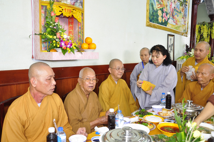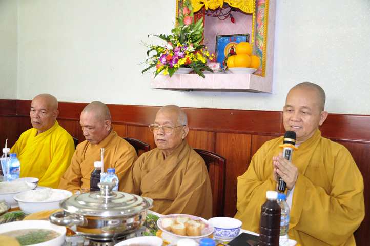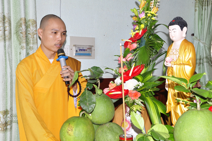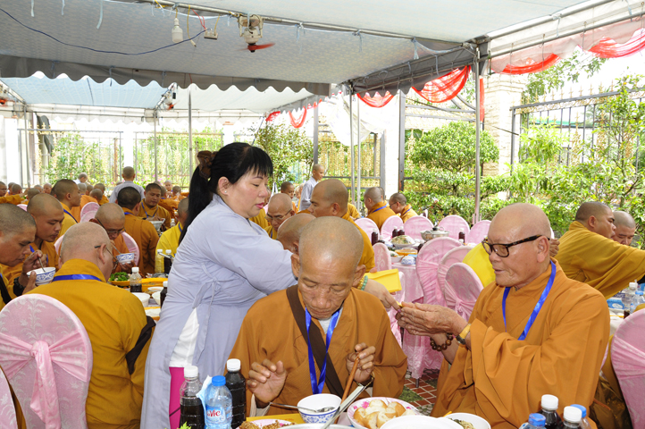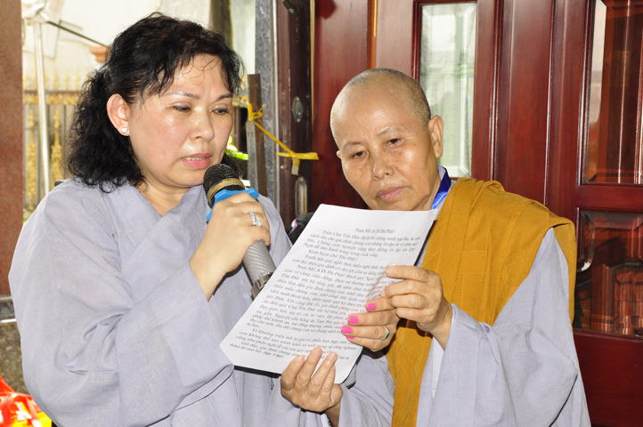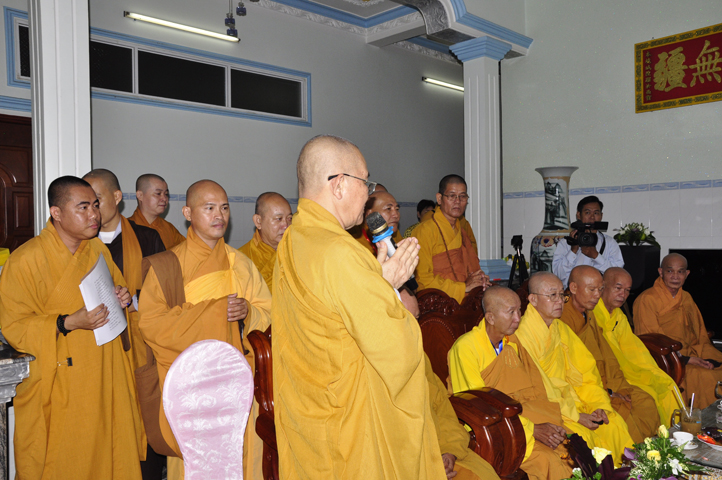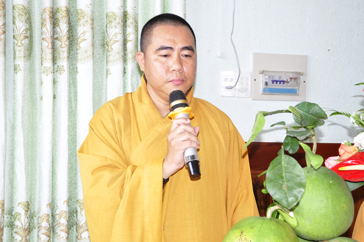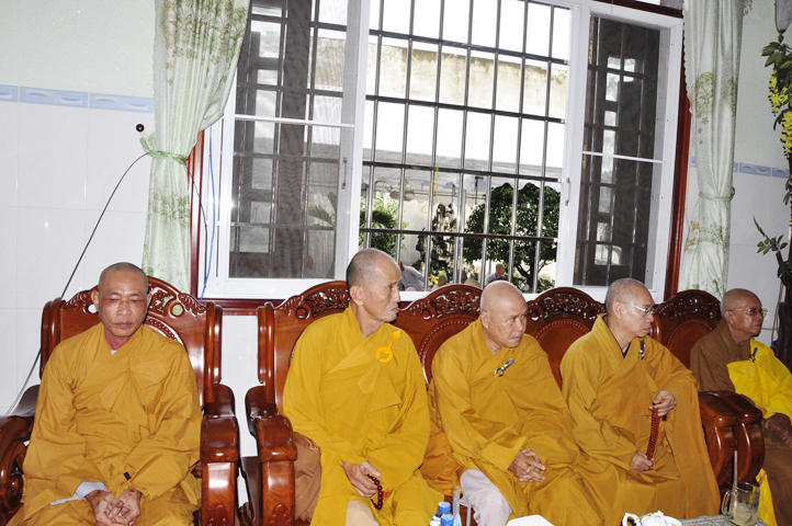 Sau các phần nghi thức truyền thống; tụng kinh, cúng ngọ, tác bạch cúng dường Trai Tăng; HT. Thích Minh Thiện – Ủy viên Hội Đồng Trị Sự trung ương, Trưởng Ban Trị sự GHPGVN tỉnh Long An từ mẫn ban bố đạo từ đến Phật tử Ngọc Tuyết cùng toàn thể thân bằng quyến thuộc nhân đại lễ của gia đình. Trong phần đạo từ, Hòa thượng tán dương hiếu tâm, hiếu hạnh và thiện pháp của Phật tử Ngọc Tuyết cũng như thành viên gia đình đã tu tạo trong thời gian qua. Đối với xã hội: Ngọc Tuyết đã làm được nhiều phúc lợi cộng đồng tại địa phương cũng như các tỉnh miền Tây; đối với Đạo, phật tử Ngọc Tuyết đã chí tâm, chí thành hùng phước tái thiết nhiều cơ sở và thỉnh rất nhiều tượng Phật, Bồ Tát cung tiến các chùa. Đặc biệt, nhân lễ khánh thành chùa Thiên Châu – Văn phòng BTS GHPGVN tỉnh Long An, Phật tử Ngọc Tuyết đã “ Nhất bộ nhất bái” từ tư gia về chùa Thiên Châu. Trước đó, Phật tử đã cúng tôn tượng Bổn Sư thờ tại chánh điện và tượng Quan Âm lộ thiên tại chùa Thiên Châu. Và rất nhiều thiện pháp mà Phật tử Ngọc Tuyết với gia đình đã làm được, Ngài đã điểm lại để Phật tử tiếp tục giữ vững tâm đạo, thiện sự; tất cả phước báo đó đã được thể hiện qua buổi lễ hôm nay; đó là một nơi tư gia nhưng được giáo hội hướng dẫn, được 500 vị Tăng thân lâm dự lễ, được chính quyền đồng thuận tạo điều kiện là một điều thật hiếm có ai làm được.