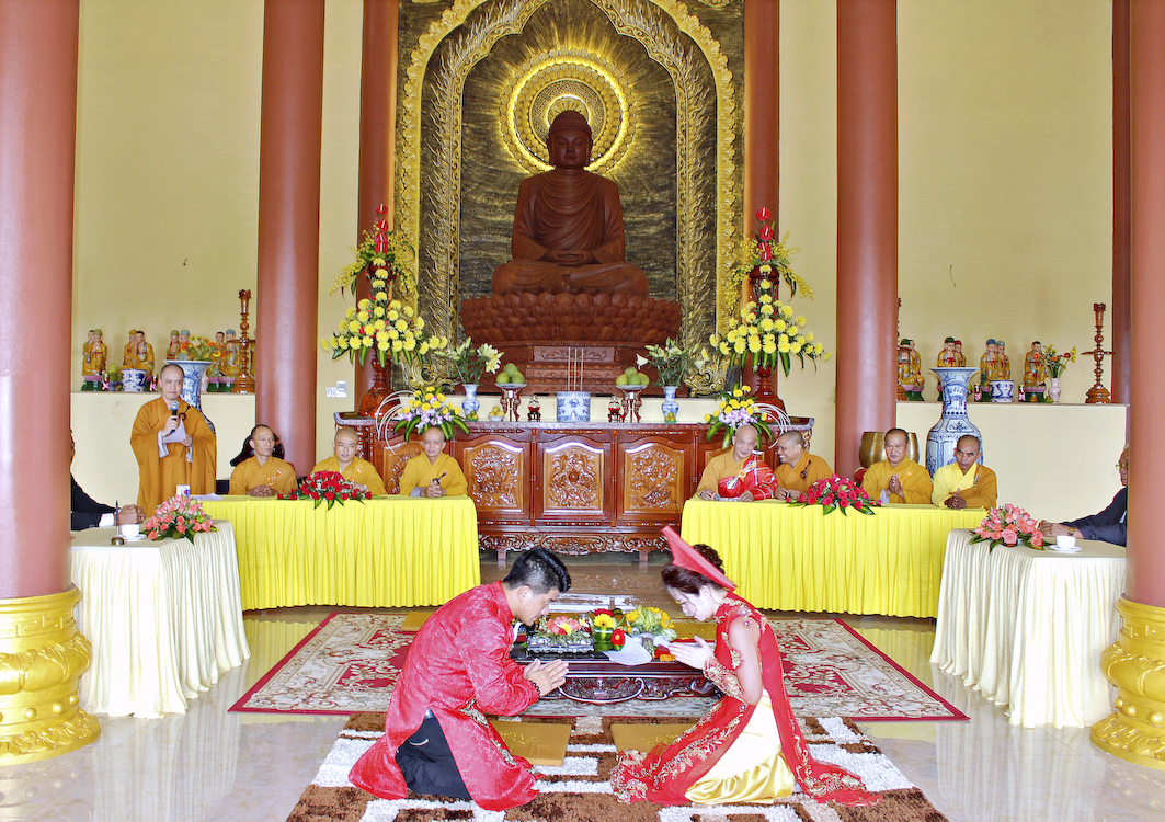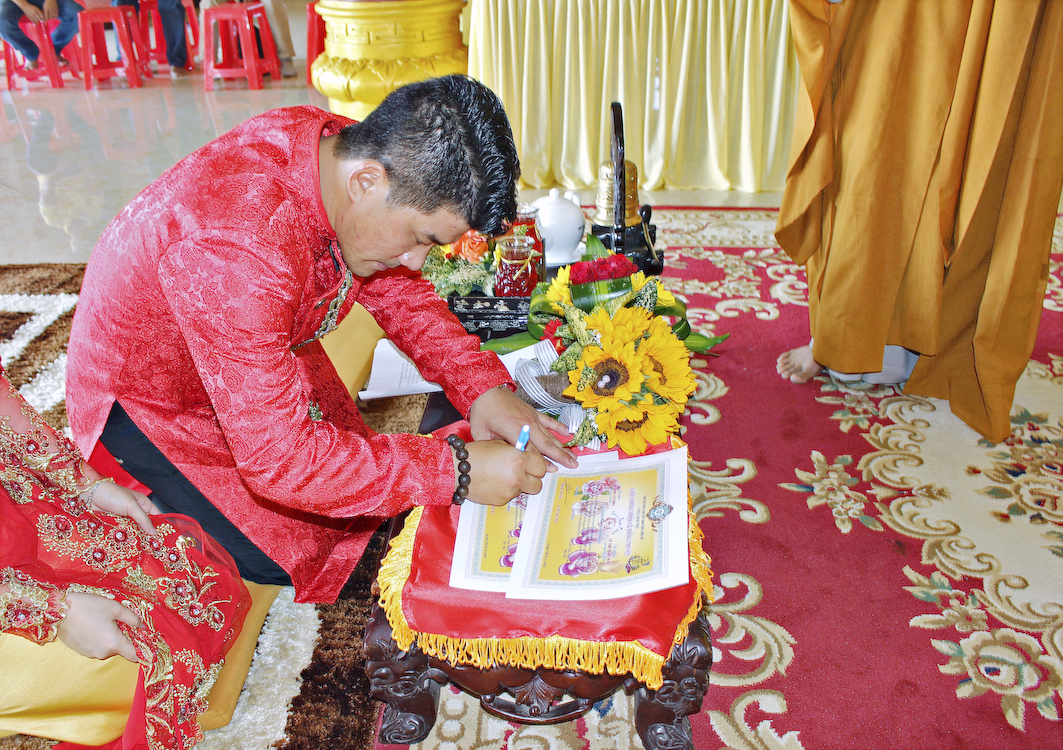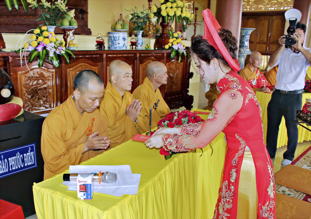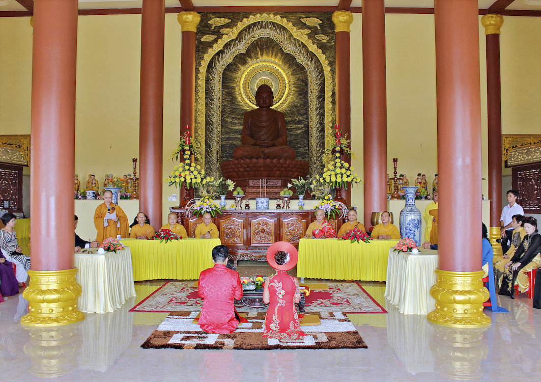 Nghi lễ Hằng thuận được tiến hành trang nghiêm ấm áp nơi đại hùng bảo điện chùa Kim Thọ, ngôi bảo điện còn thơm mùi sơn mới của ngày Lễ Lạc Thành. Trong sự chứng minh của chư Tôn đức và cha mẹ đôi bên, Tân lang và Tân nương đều trân trọng tự tay viết tên mình lên Giấy chứng nhận thay cho lời hẹn ước trăm năm.