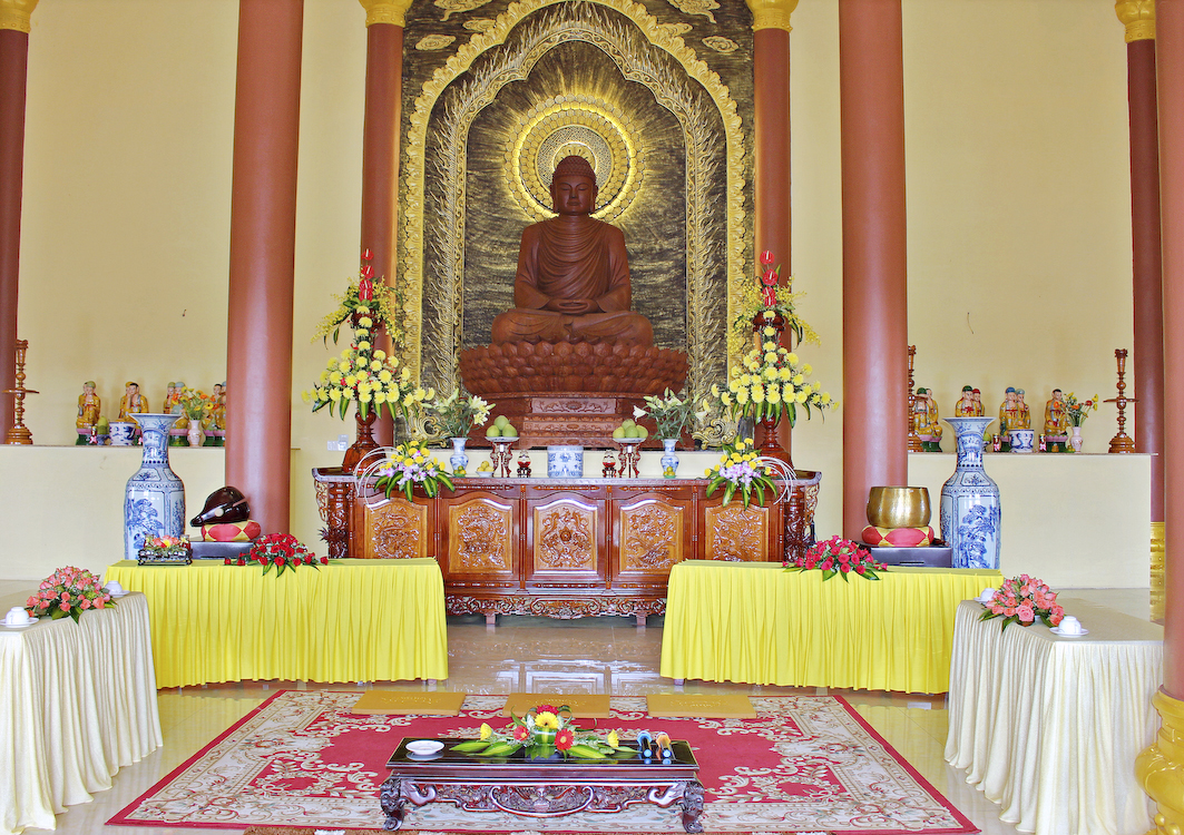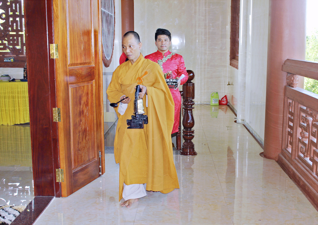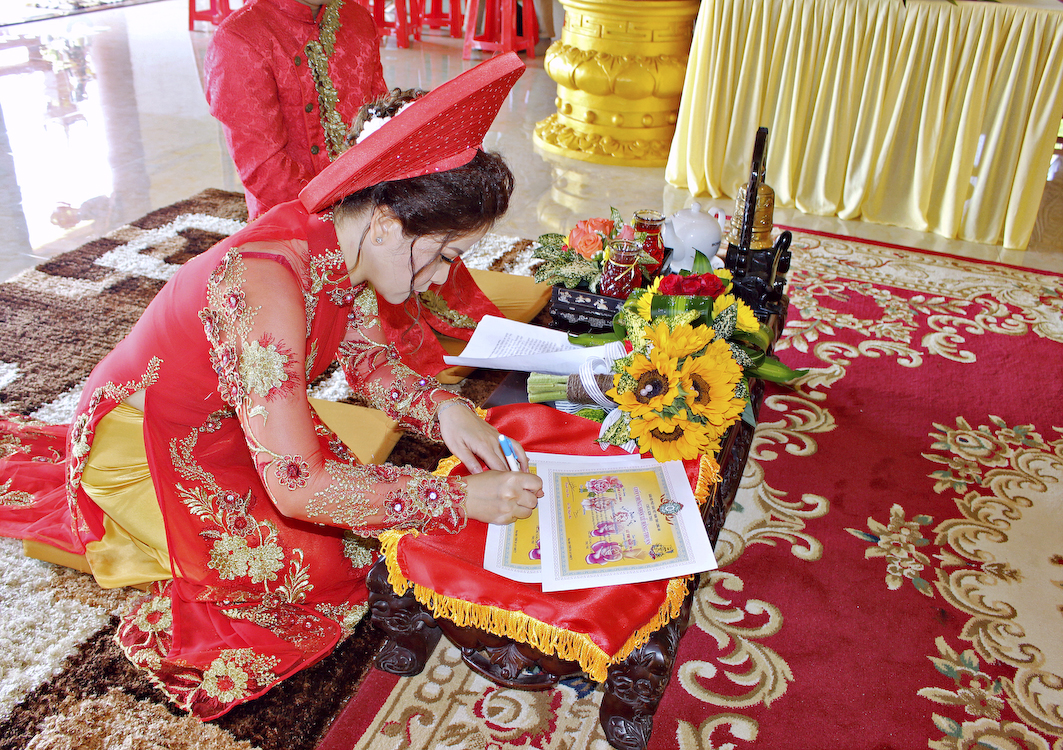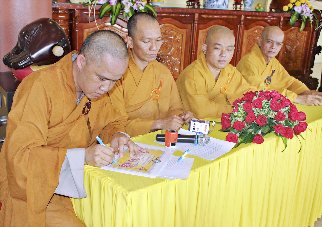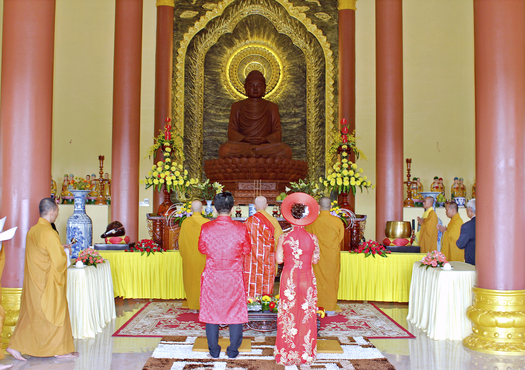 Nghi lễ Hằng thuận được tiến hành trang nghiêm ấm áp nơi đại hùng bảo điện chùa Kim Thọ, ngôi bảo điện còn thơm mùi sơn mới của ngày Lễ Lạc Thành. Trong sự chứng minh của chư Tôn đức và cha mẹ đôi bên, Tân lang và Tân nương đều trân trọng tự tay viết tên mình lên Giấy chứng nhận thay cho lời hẹn ước trăm năm.