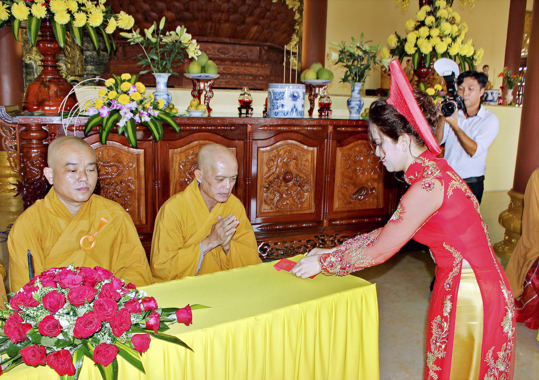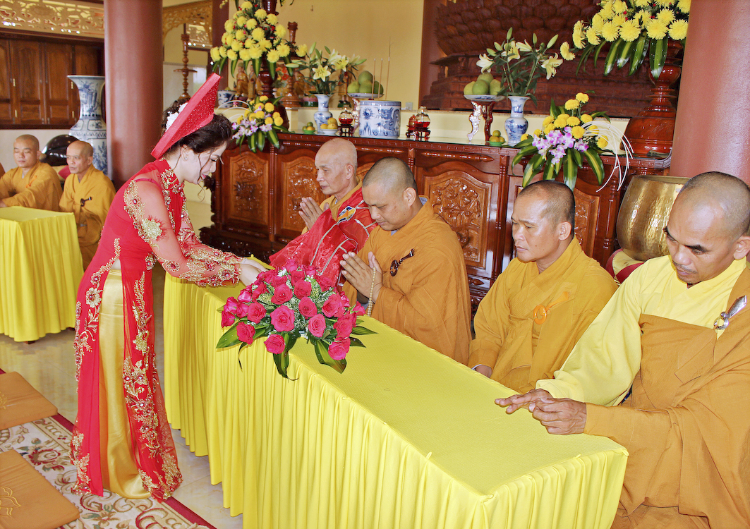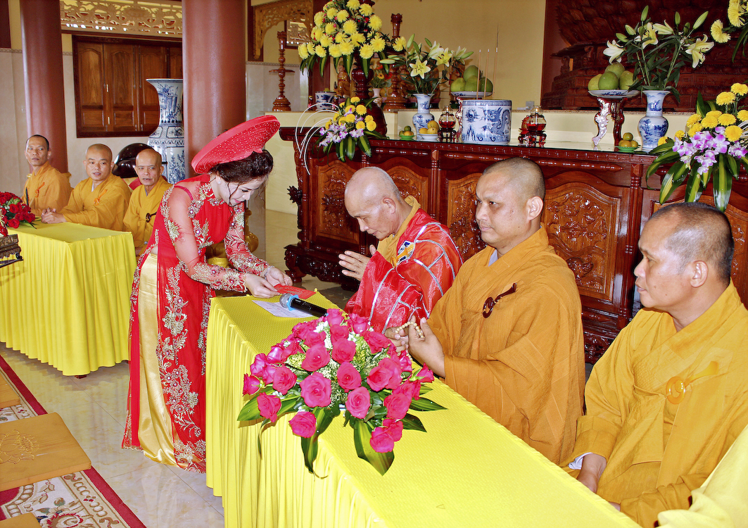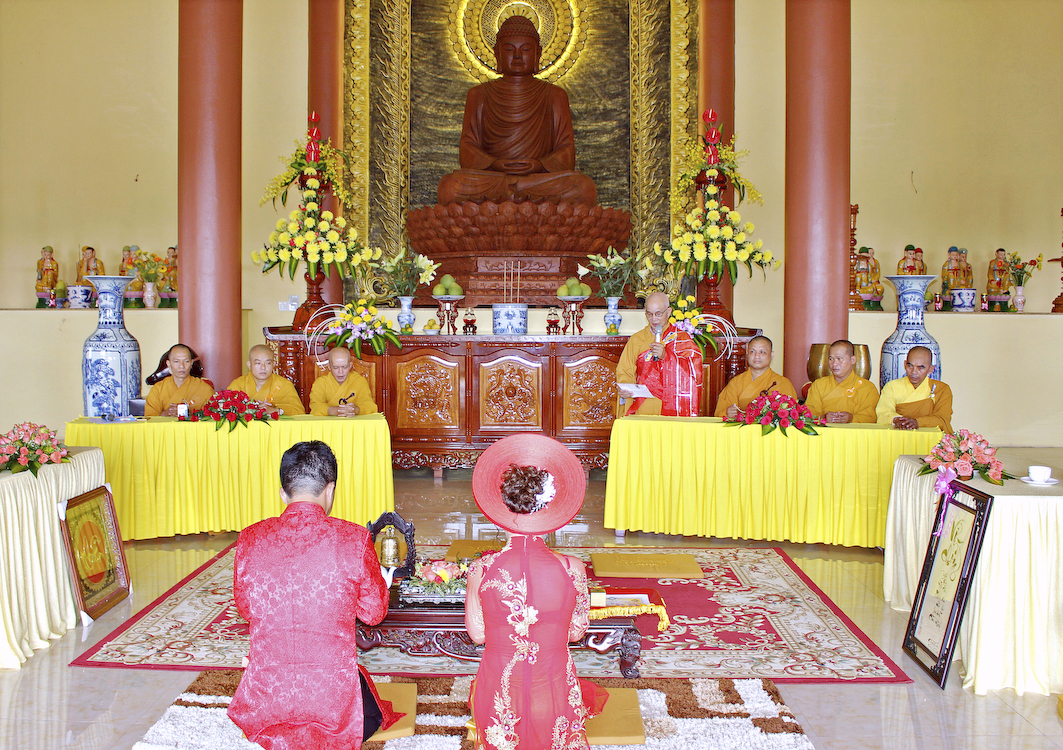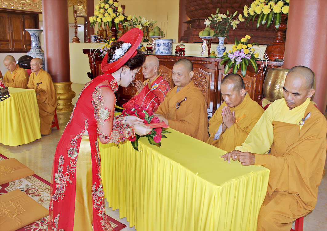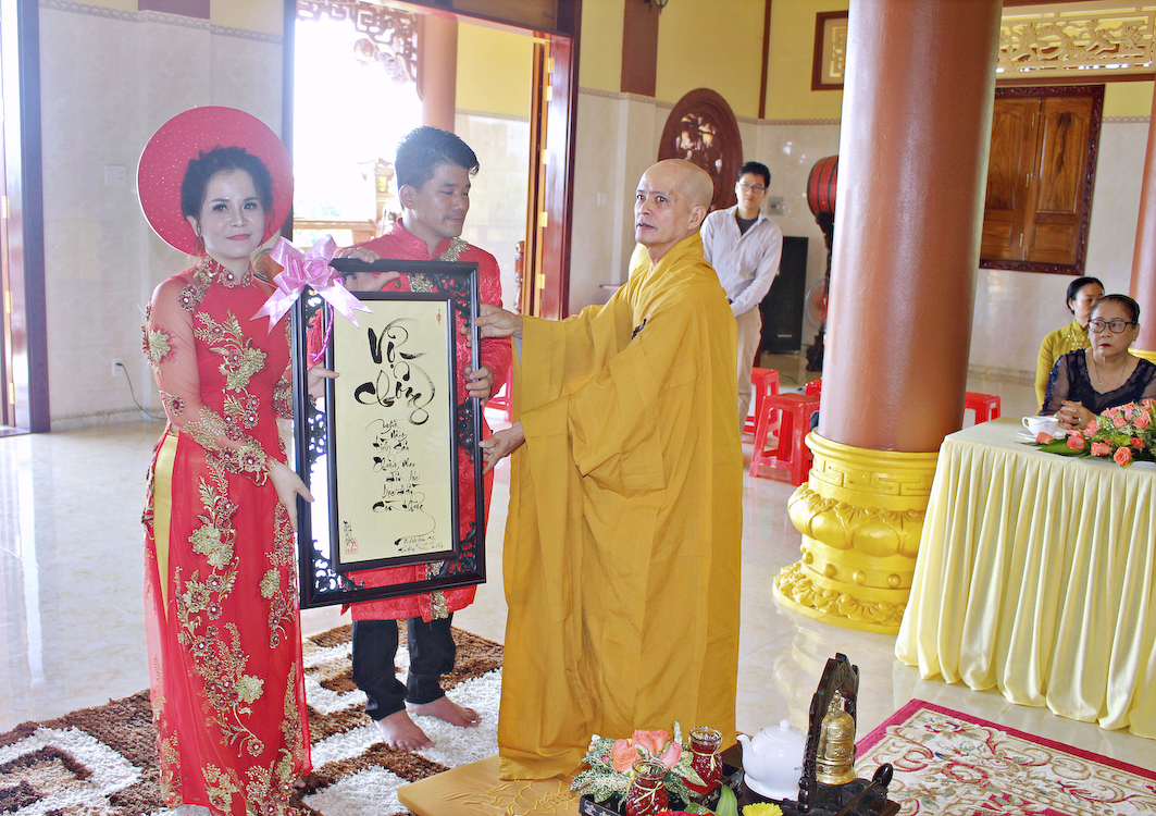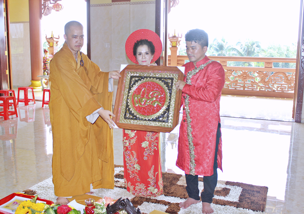 Đôi uyên ương Huỳnh Văn Hòa và Lê Thị Ngọc Mai đã nhận được rất nhiều lời chúc phúc và quà tặng của chư Tôn đức chứng minh, chư Tôn đức Tại tổ đình, cùng các Phật tử xa gần đạo bạn. Đồng thời cả hai đều hứa hẹn sẽ yêu thương, bảo vệ nhau đến ngày ‘răng long đầu bạc’. Đối trước chư Tôn đức, hai Phật tử đã đảnh lễ tạ ơn Cha Mẹ, đấng sanh thành đã dày công nuôi dưỡng người bạn đời của mình’ và tiếp đó cả hai vị đồng đảnh lễ tri ân chư Tôn đức.