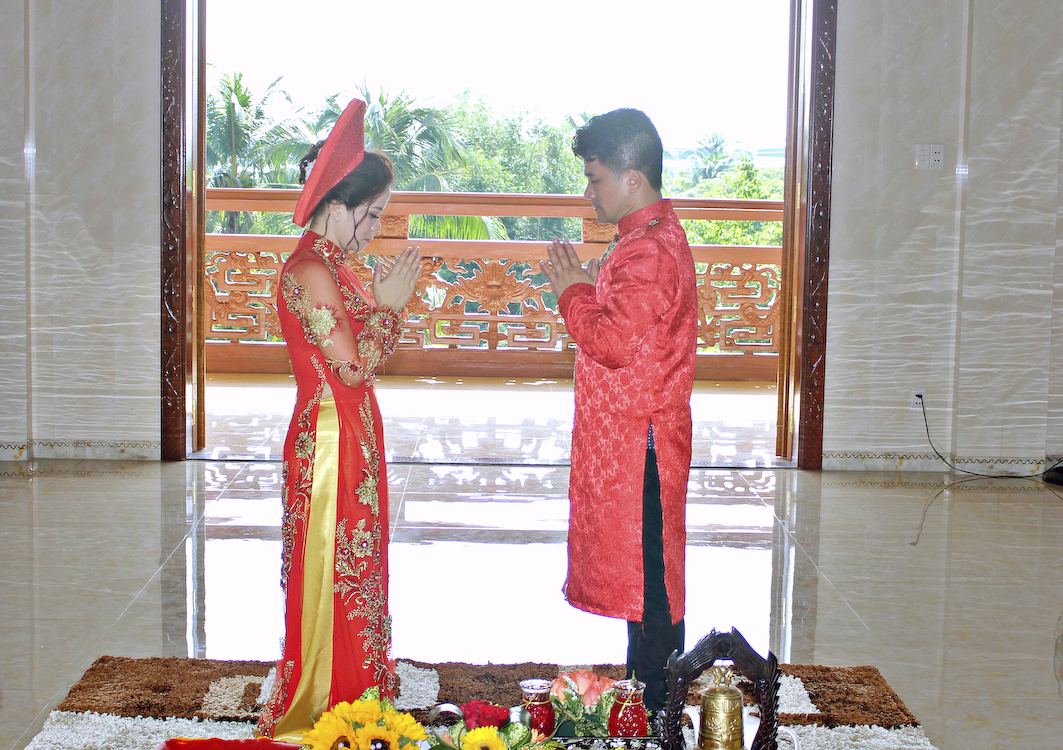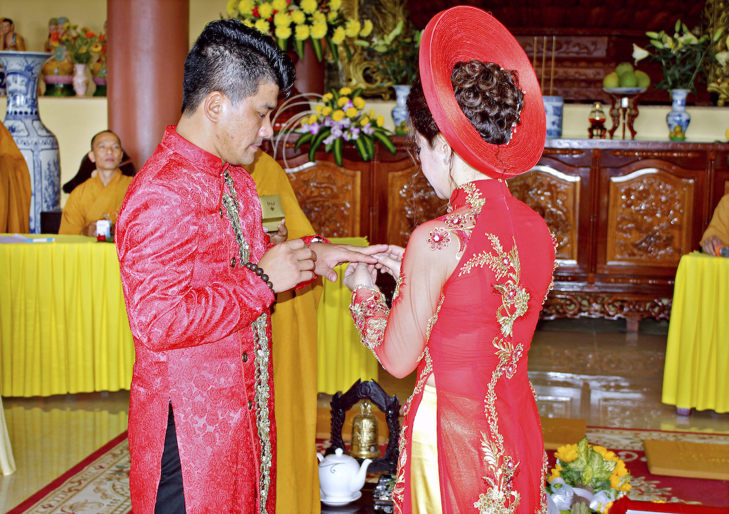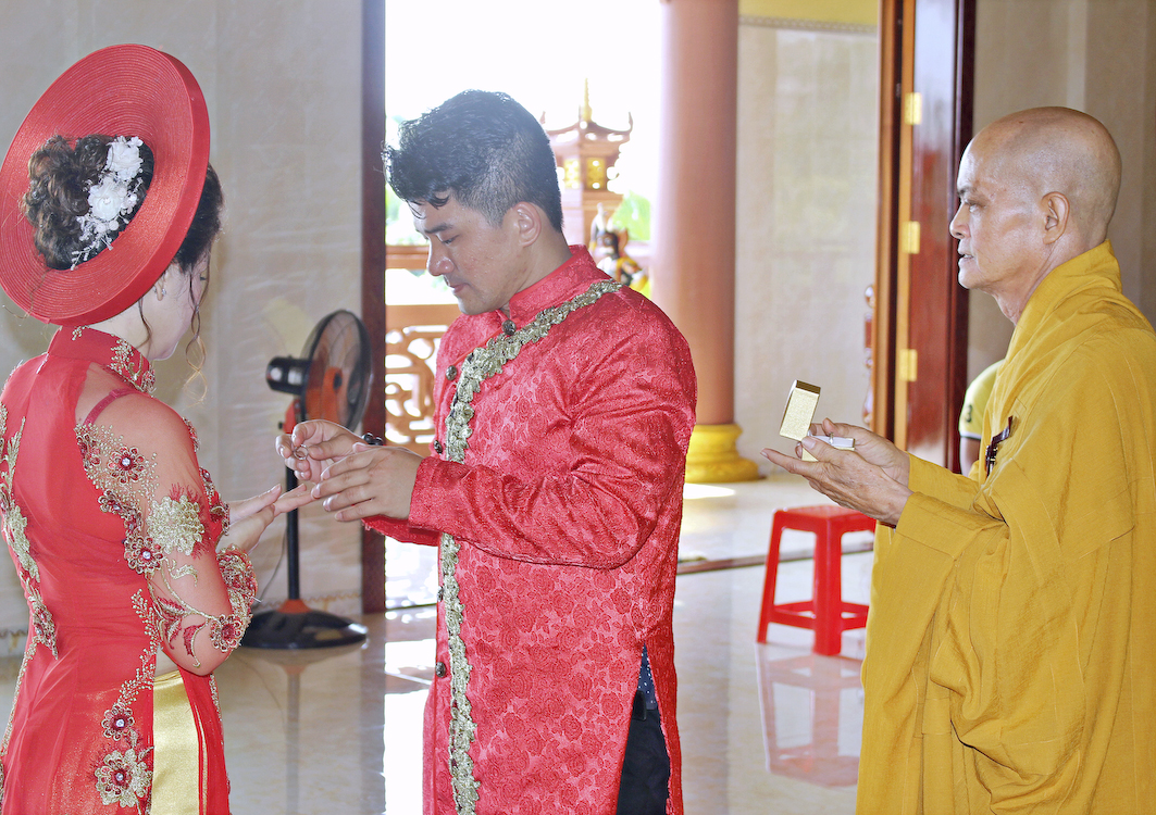 Tiếp đó, theo lời dẫn của Đại đức Thích An Nhựt, Tân lang và Tân nương trao cho nhau chiếc nhẫn vàng, biểu trưng tình yêu nồng thắm đầy đủ sự bao dung, chung thủy hòa hợp, bền chí bên nhau đi đến trọn cuộc đời.