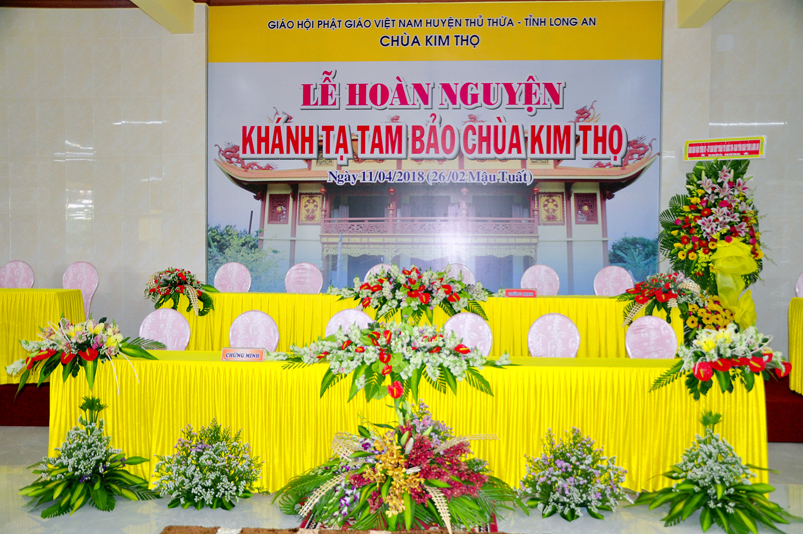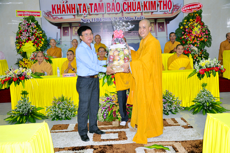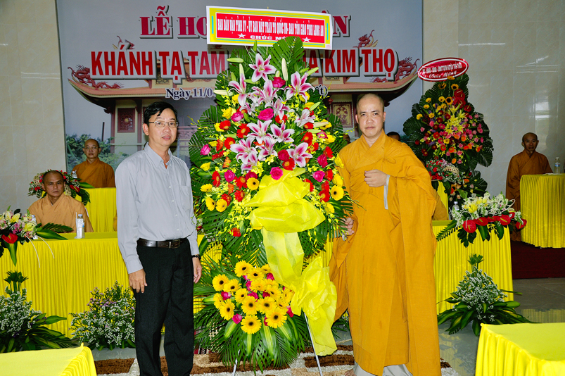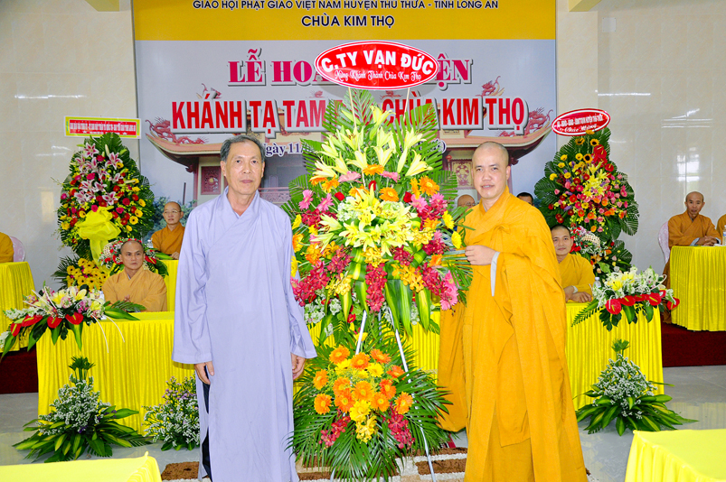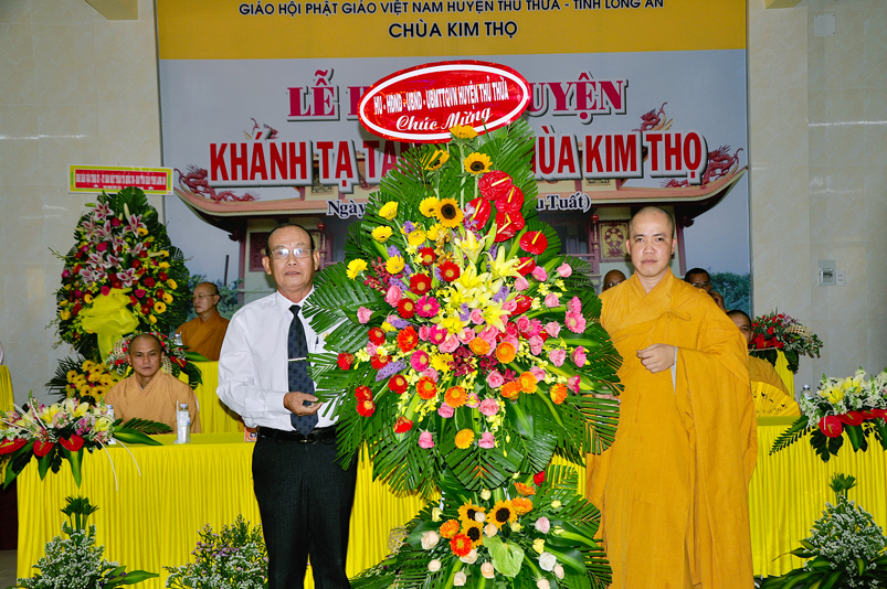 Hòa trong niềm vui buổi lễ, lãnh đạo chính quyền địa phương huyện sở tại, ông Nguyễn Văn Thắm đã có những lời chân tình chúc mừng. Ông nhấn mạnh các thời điểm lịch sử trọng đại của đất nước, toàn dân và Phật giáo luôn theo phương châm đoàn kết hòa hợp trong công cuộc xây dựng và bảo vệ quê hương đất nước. Ông hy vọng công trình này của chùa Kim Thọ tại huyện nhà sẽ góp thêm phần khởi sắc cho văn hóa Phật giáo Việt Nam tỉnh Long An, phát huy tinh thần đoàn kết Đạo pháp và Dân Tộc trong và ngoài tỉnh. Ông mong rằng Đại đức trụ trì sẽ đồng hành cùng chính quyền địa phương thực hiện tốt các công tác an sinh xã hội, đúng theo tiêu chí văn minh-nghĩa tình. Tiếp đó, Ông Nguyễn Văn Thắm cùng quý vị khách quý chính quyền ban ngành tỉnh Long An trân trọng trao tặng lẵng hoa chúc mừng Đại đức Thích An Nhựt.
