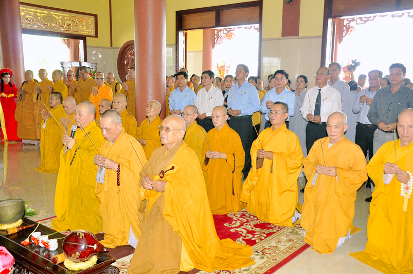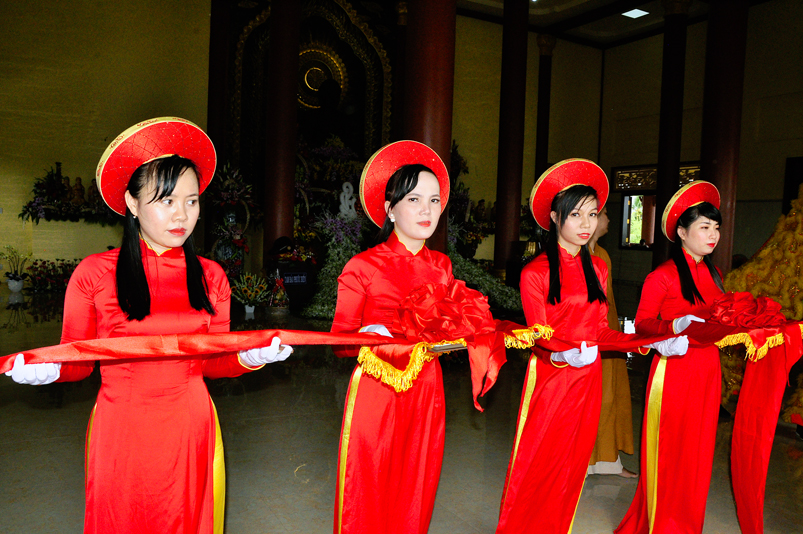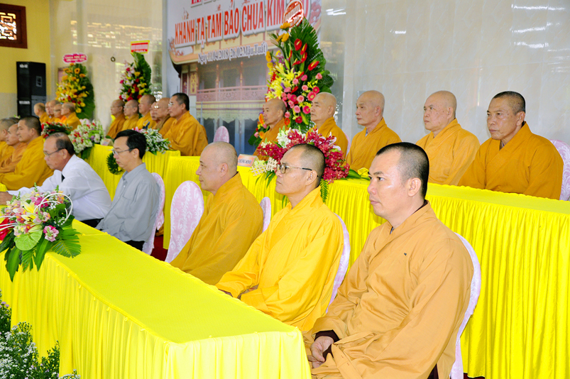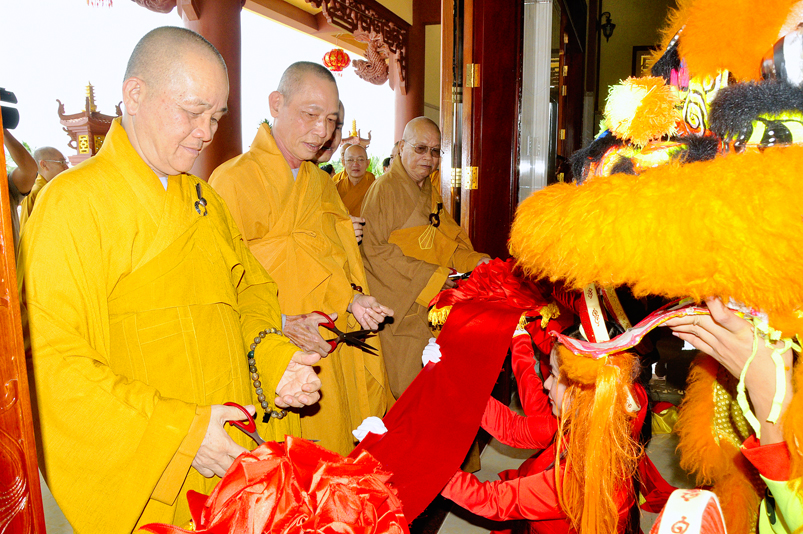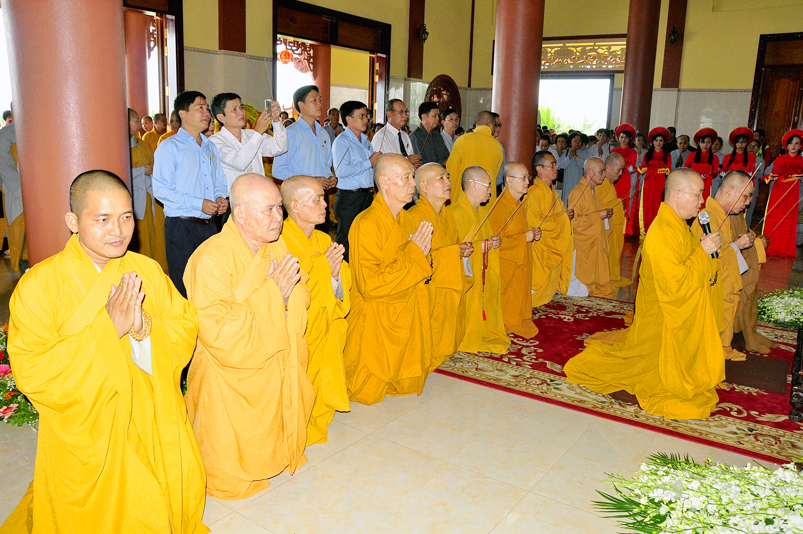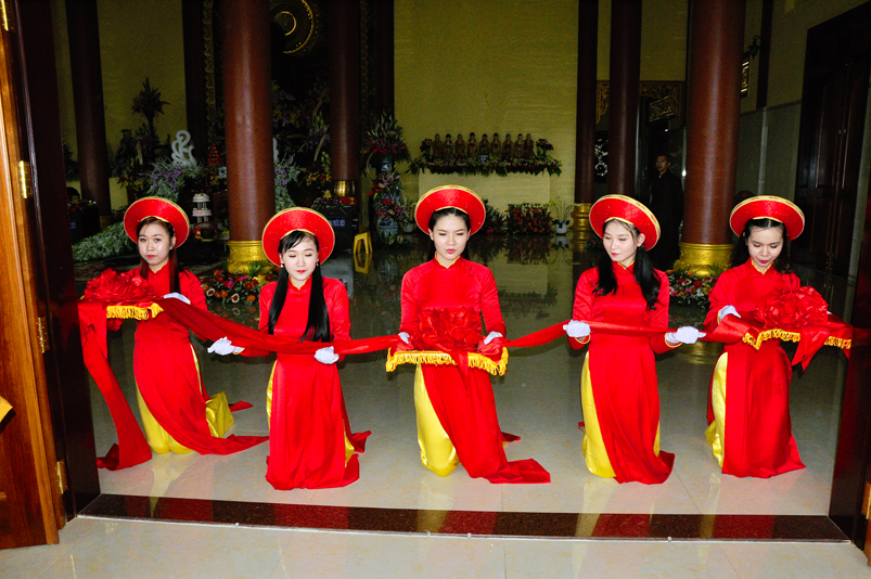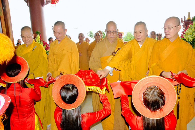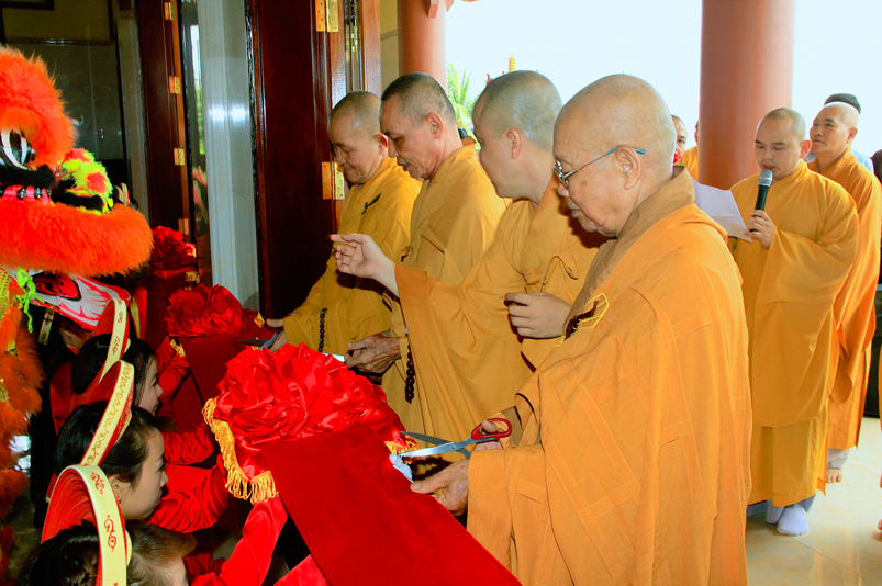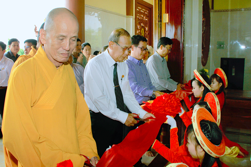 Tiếp theo, Ban Tổ chức cung thỉnh Chư Tôn đức Giáo phẩm tỉnh nhà, trân trọng kính mới quý vị khách quý thân lâm đại hùng bửu điện niêm hương, cầu nguyện, chứng minh Cắt băng mừng Lễ Lạc thành, an vị Thánh tượng Bổn Sư.