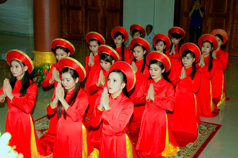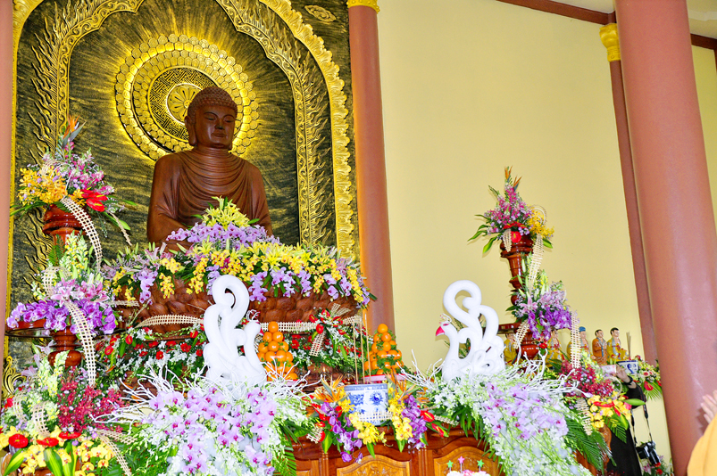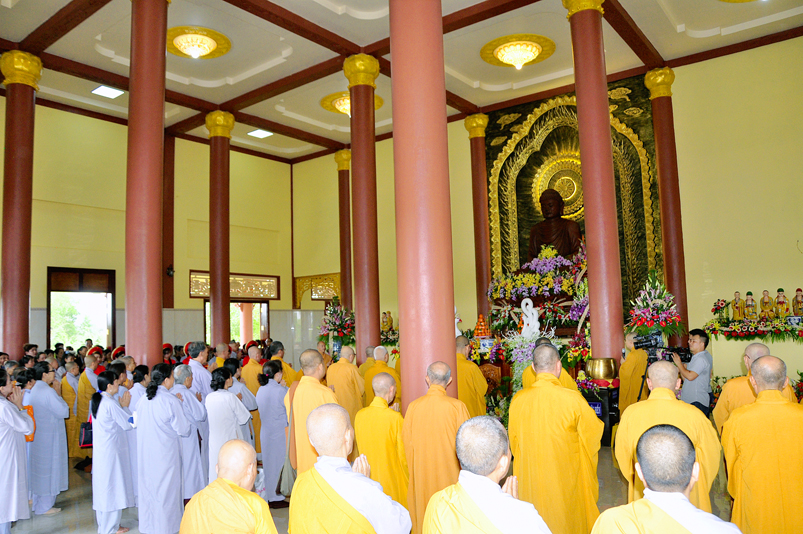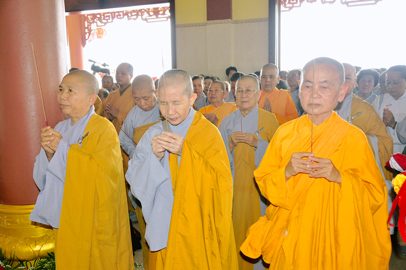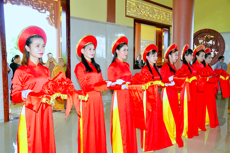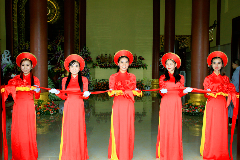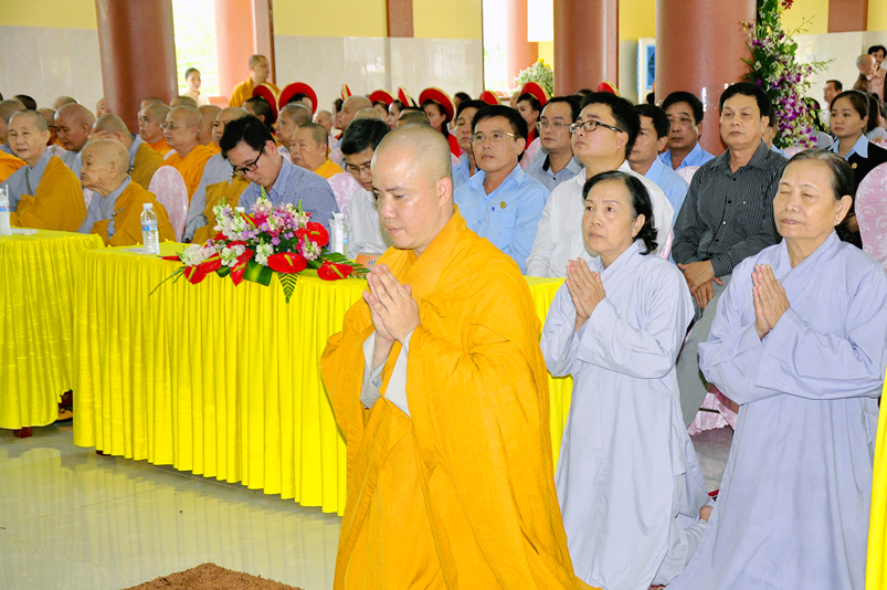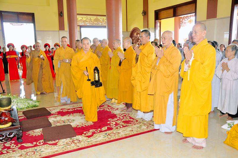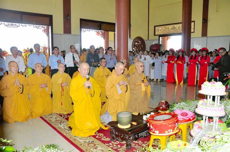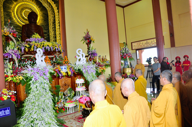 Tiếp theo, Ban Tổ chức cung thỉnh Chư Tôn đức Giáo phẩm tỉnh nhà, trân trọng kính mới quý vị khách quý thân lâm đại hùng bửu điện niêm hương, cầu nguyện, chứng minh Cắt băng mừng Lễ Lạc thành, an vị Thánh tượng Bổn Sư.
