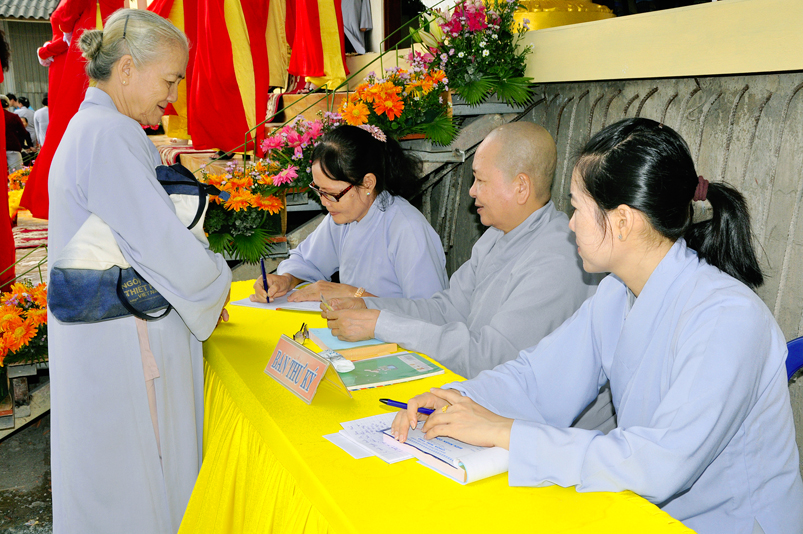 Từ sáng sớm, Ban Tổ chức đã cung tiếp nhiều phái đoàn chư tôn đức trụ trì các tự viện, chư Tôn đức môn phong pháp quyến Thiên Thai Giáo Quán tông cùng quý Phật tử xa gần về tham dự.