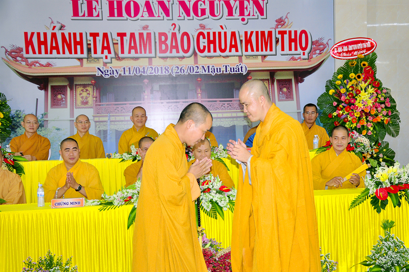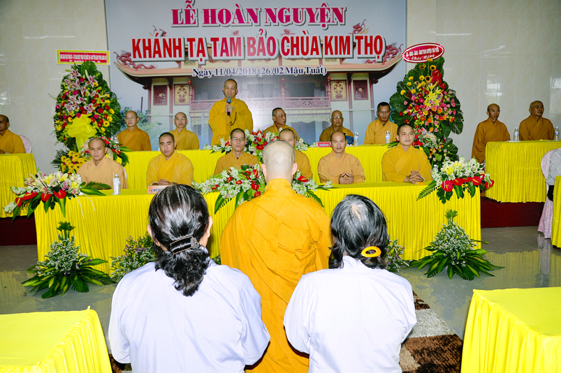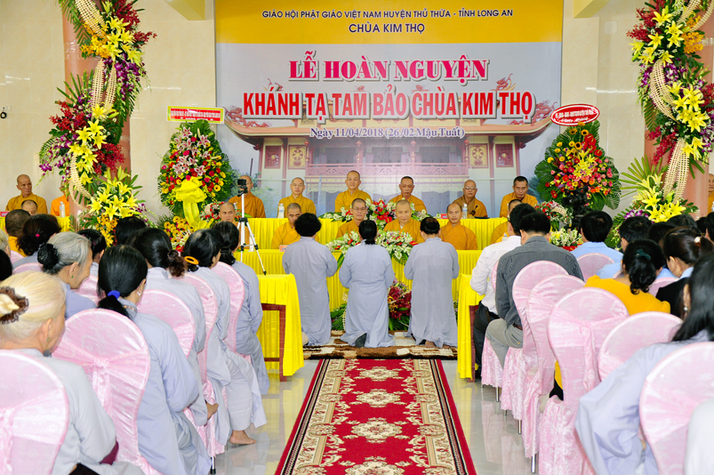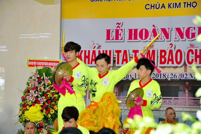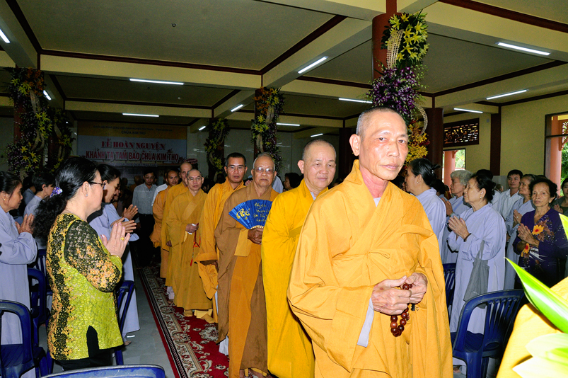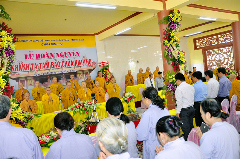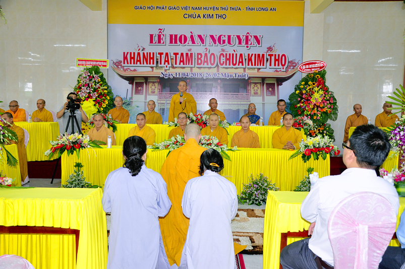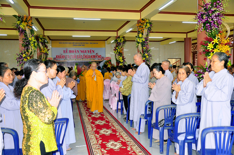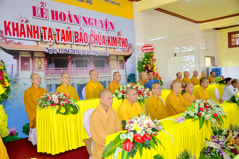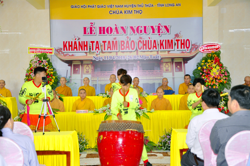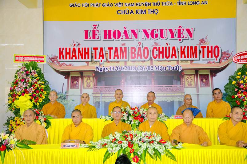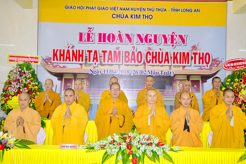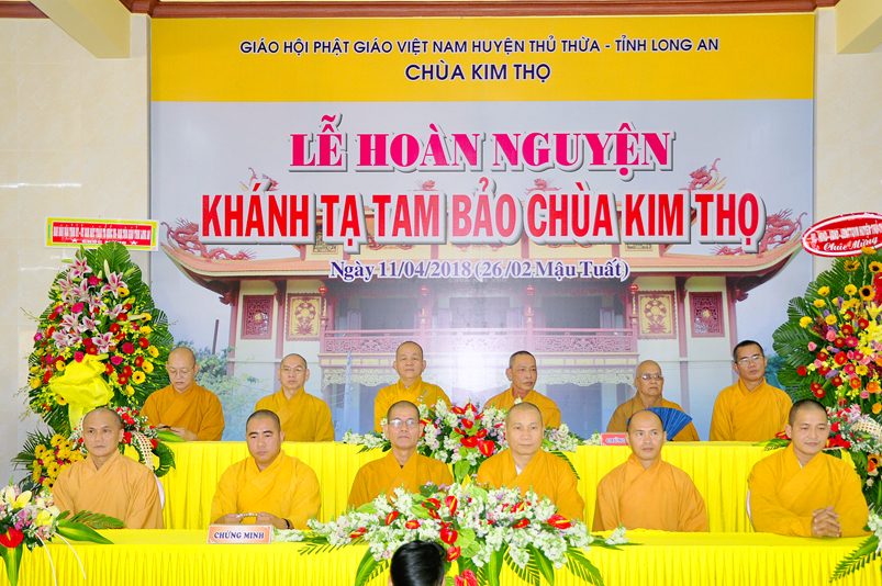 Đúng 8g30, Ban nghi lễ cung thỉnh chư Tôn thiền đức quang lâm chứng minh Lễ Lạc Thành chùa Kim Thọ. Điều phối chương trình do Đại đức Thích Lệ Ngôn- Trưởng BHP GHPGVN tỉnh Long An đảm nhiệm.