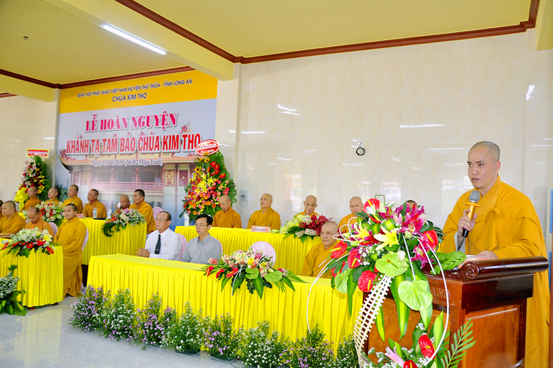 Trong giây phút thiêng liêng trang trọng của ngày Lễ Lạc Thành, Đại đức Trụ trì chùa Kim Thọ- Thích An Nhựt, TRưởng Ban Hướng dẫn Phật tử GHPGVN tỉnh Long An cung kính báo cáo tiến trình xây dựng chùa Kim Thọ trong suốt ba năm và khái quát tiền thân của ngôi chùa.