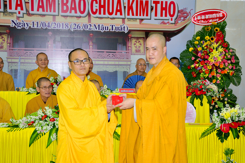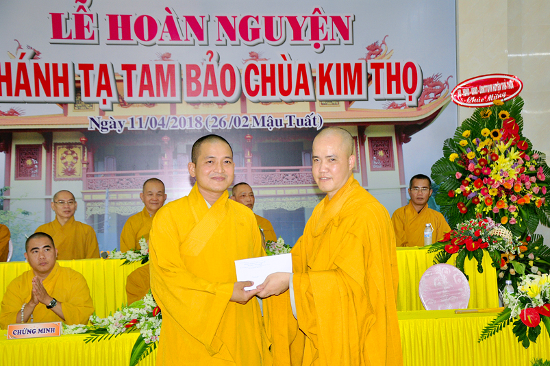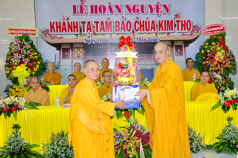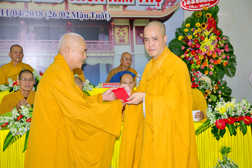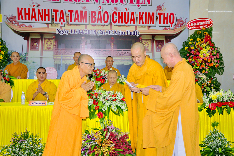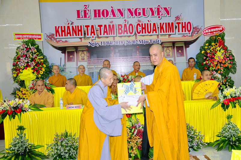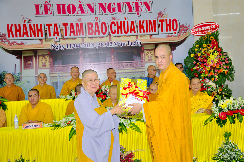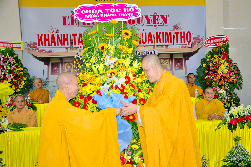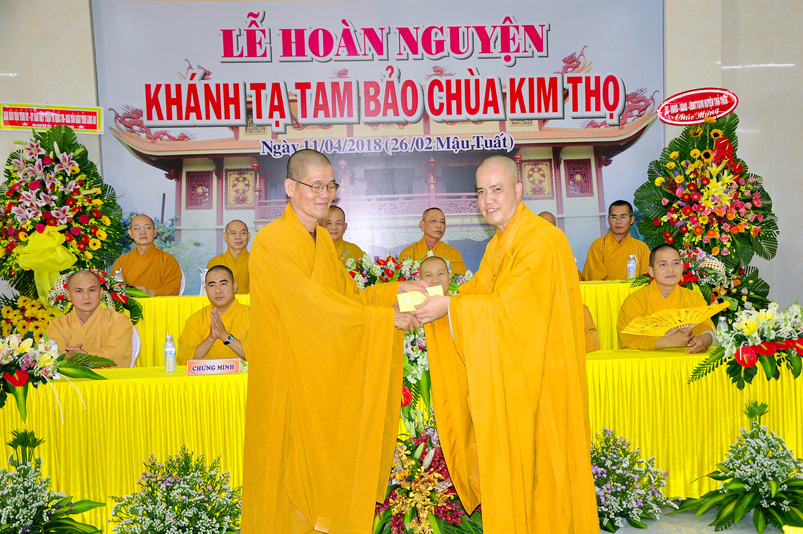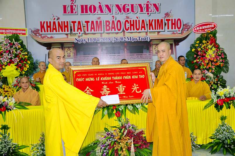 Vô cùng hoan hỷ trong ngày lễ Lạc Thành, Hòa thượng Thích Minh Thiện hướng niệm tri ân các Bậc trưởng lão Giáo phái Thiên Thai Giáo Quán Tông đã mật hộ công trình tái thiết hoàn thành viên mãn. Trước Phật sự được thành tựu từ những tấm lòng thương yêu che chở của những bậc Thầy đã ra đi, và niềm tin của chư Tôn Giáo phẩm, chư Tôn đức Môn phong hiện tiền trao gởi, Hòa thượng Trưởng Ban ân cần nhắc nhở Đại đức Trụ trì Thích An Nhựt hãy trân trọng khắc ghi và làm tốt các công tác Phật sự tại huyện nhà, hướng dẫn Phật tử tu học đúng chánh pháp. Hòa thượng nhấn mạnh, dù biết rằng con đường phía trước hãy còn nhiều khó khăn (với số nợ hơn 2 tỷ đồng), nhưng Ngài mong rằng Đại đức Thích An Nhựt hãy luôn luôn ‘chân cứng đá mềm’, cố gắng phấn đấu nhiều hơn nữa, hãy nhớ phát huy tinh thần đoàn kết hòa hợp với chư huynh đệ đồng môn, với Phật giáo tỉnh huyện nhà, cùng các cấp chính quyền địa phương sở tại cùng Phật tử xa gần. Có như thế mới gọi là thể hiện tinh thần tri ân và báo ân đúng nghĩa của người con Phật. Để khích lệ tinh thần cho Đại đức An Nhựt, Hòa thượng Trưởng Ban thân tình trao tăng 10.000.000 đồng (mười triệu đồng) và trân trọng kêu gọi lòng hảo tâm của các Mạnh Thường Quân cùng chung tay ủng hộ đạo tràng chùa Kim Thọ.