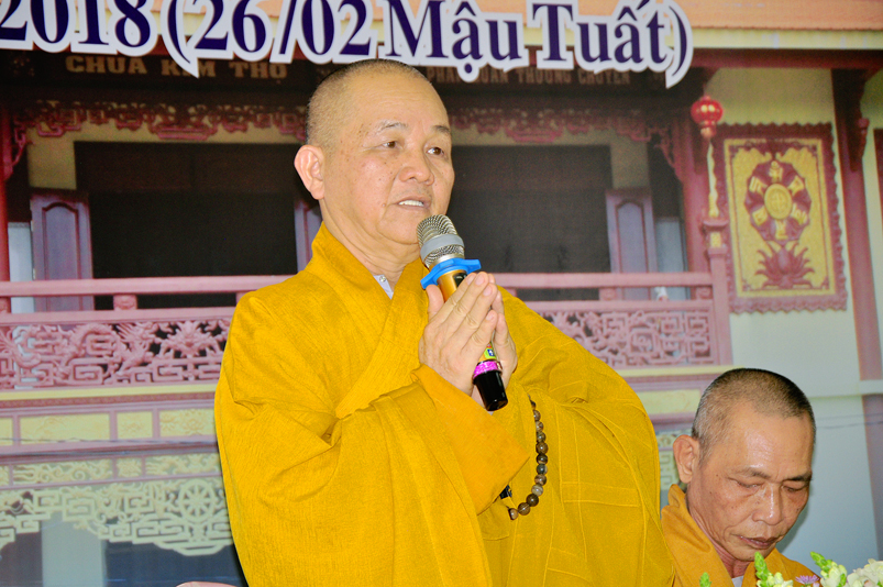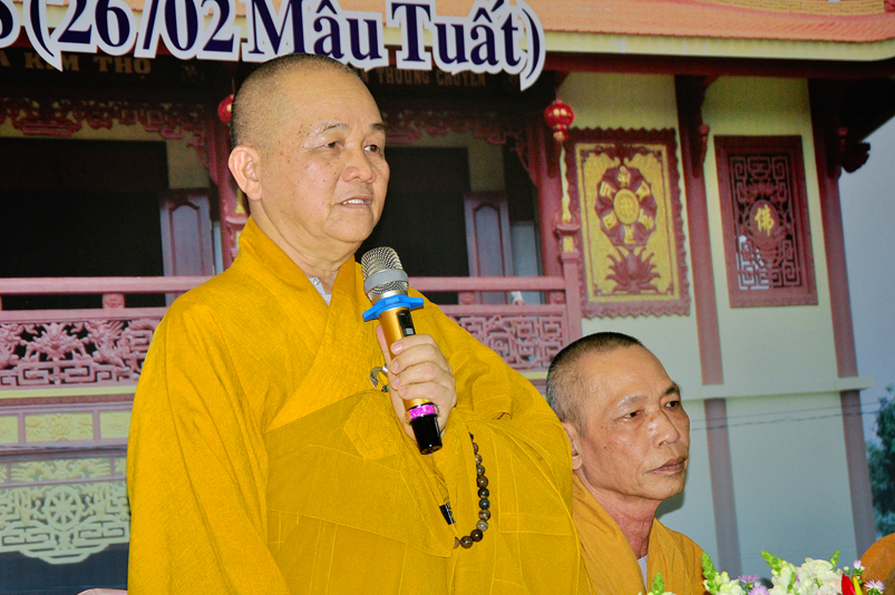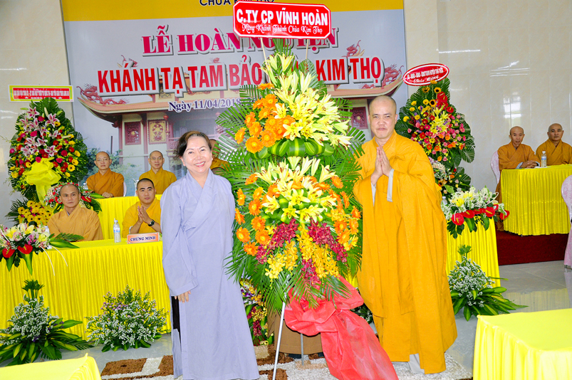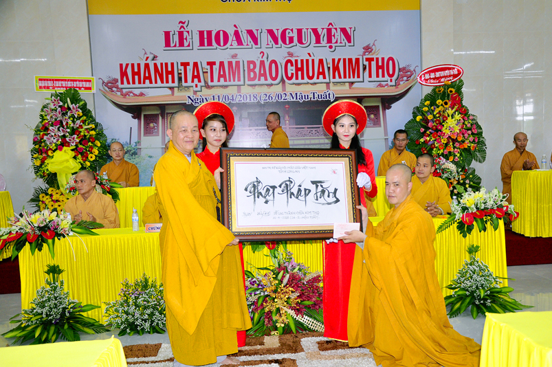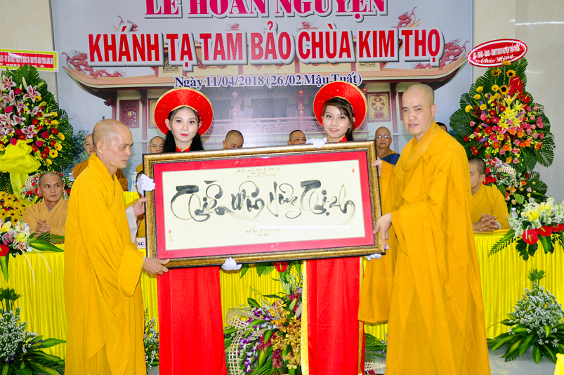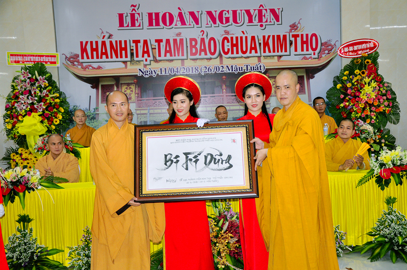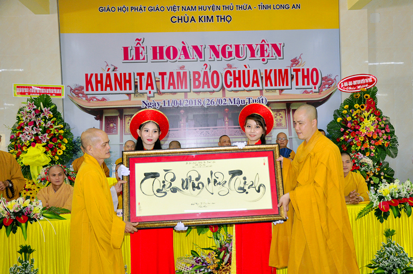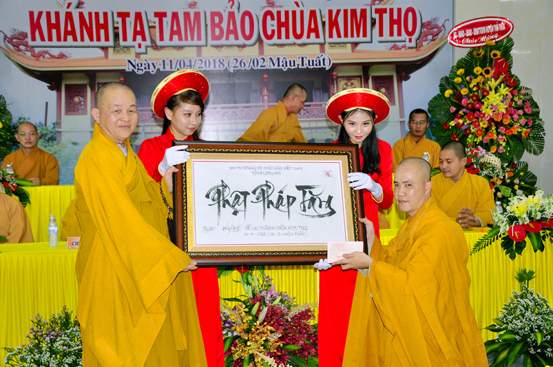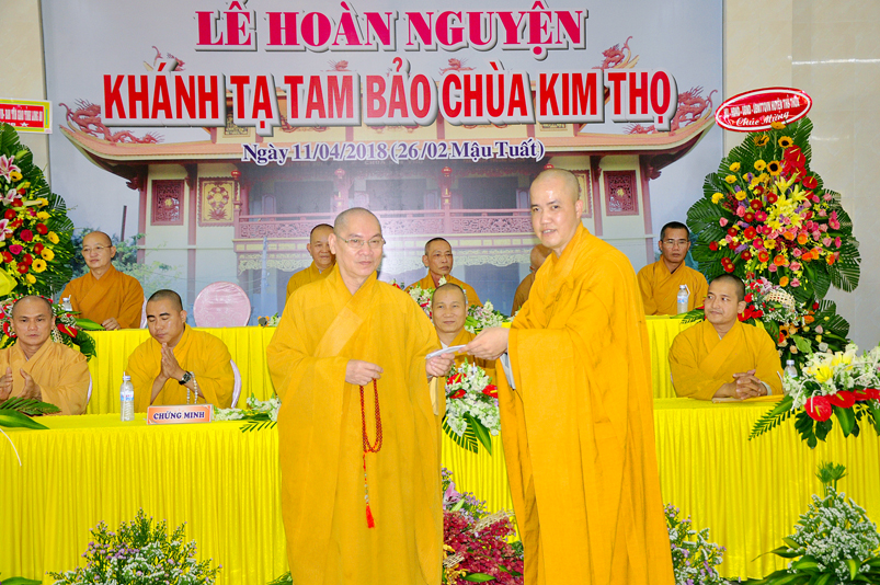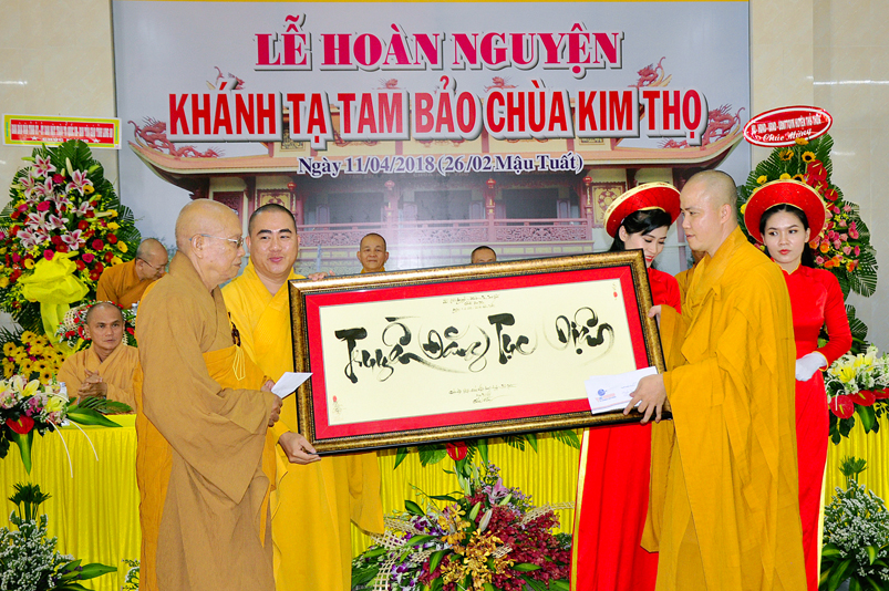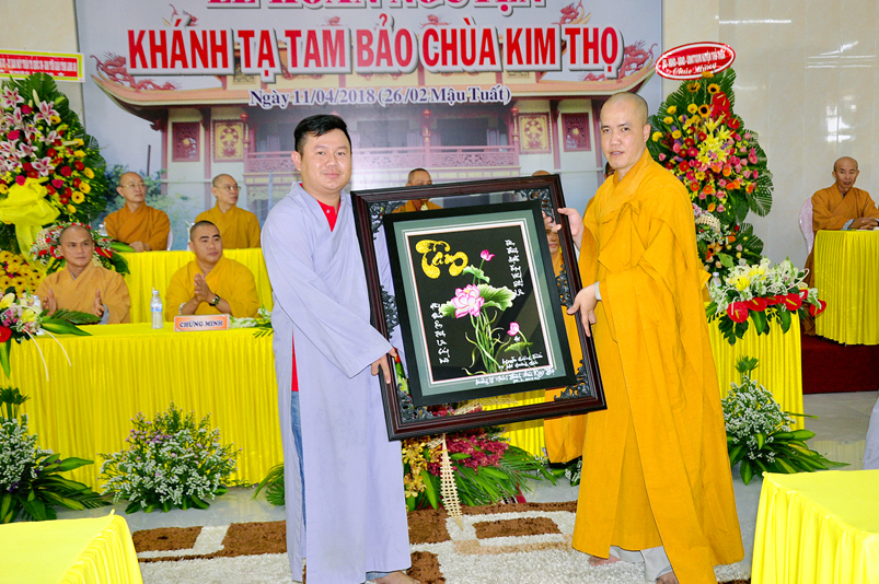 Vô cùng hoan hỷ trong ngày lễ Lạc Thành, Hòa thượng Thích Minh Thiện hướng niệm tri ân các Bậc trưởng lão Giáo phái Thiên Thai Giáo Quán Tông đã mật hộ công trình tái thiết hoàn thành viên mãn. Trước Phật sự được thành tựu từ những tấm lòng thương yêu che chở của những bậc Thầy đã ra đi, và niềm tin của chư Tôn Giáo phẩm, chư Tôn đức Môn phong hiện tiền trao gởi, Hòa thượng Trưởng Ban ân cần nhắc nhở Đại đức Trụ trì Thích An Nhựt hãy trân trọng khắc ghi và làm tốt các công tác Phật sự tại huyện nhà, hướng dẫn Phật tử tu học đúng chánh pháp. Hòa thượng nhấn mạnh, dù biết rằng con đường phía trước hãy còn nhiều khó khăn (với số nợ hơn 2 tỷ đồng), nhưng Ngài mong rằng Đại đức Thích An Nhựt hãy luôn luôn ‘chân cứng đá mềm’, cố gắng phấn đấu nhiều hơn nữa, hãy nhớ phát huy tinh thần đoàn kết hòa hợp với chư huynh đệ đồng môn, với Phật giáo tỉnh huyện nhà, cùng các cấp chính quyền địa phương sở tại cùng Phật tử xa gần. Có như thế mới gọi là thể hiện tinh thần tri ân và báo ân đúng nghĩa của người con Phật. Để khích lệ tinh thần cho Đại đức An Nhựt, Hòa thượng Trưởng Ban thân tình trao tăng 10.000.000 đồng (mười triệu đồng) và trân trọng kêu gọi lòng hảo tâm của các Mạnh Thường Quân cùng chung tay ủng hộ đạo tràng chùa Kim Thọ.