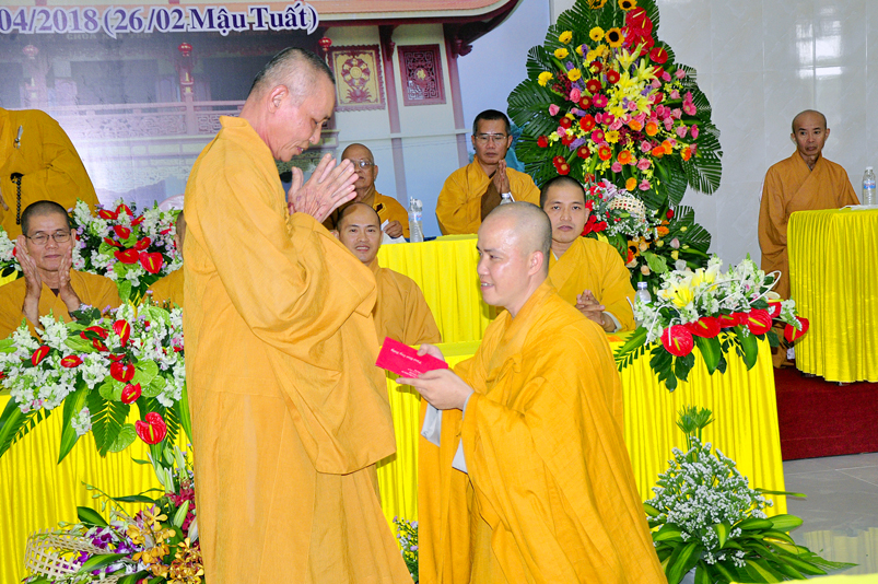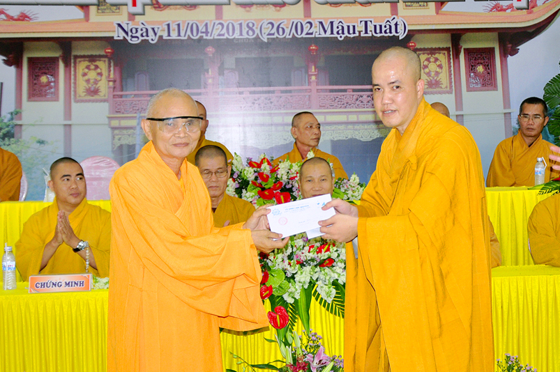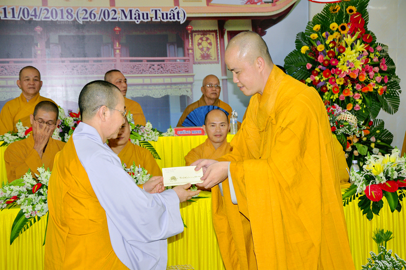 Bầu không khí buổi lễ thêm ấm tình đạo vị, Đại đức Thích An Nhựt cung kính đón nhận nhiều tịnh phẩm, tịnh tài của Chư Tôn đức Thường trực Ban Trị sự tỉnh, thành, huyện, thị; chư Tôn đức Môn phong pháp quyến Thiên Thai; các huynh đệ đồng học, và những phần quà tiêu biểu của quý vị khách quý cùng các Phật tử gần xa trao tặng.