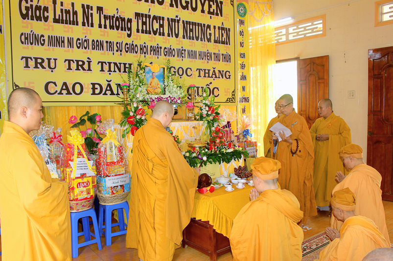 Đối trước Án tiền cố Ni trưởng Thích Nữ Nhung Liên, Hòa thượng Thích Thiện Tài – Phó ban Trị sự kiêm Trưởng Ban Nghi lễ GHPGVN tỉnh Long An cung tiến Giác linh cố Ni trưởng.