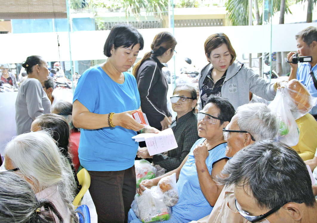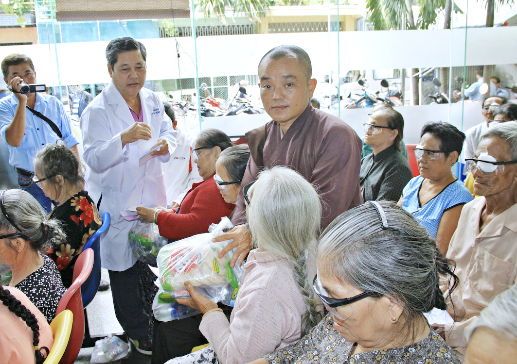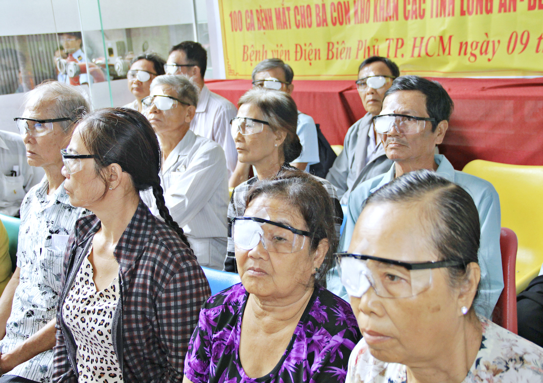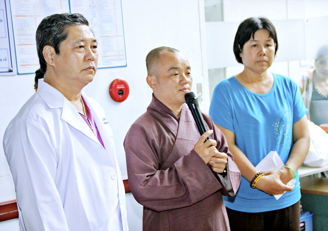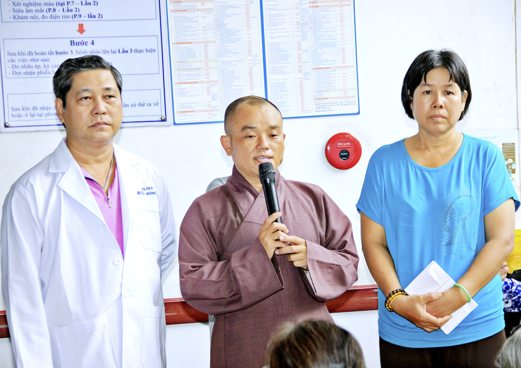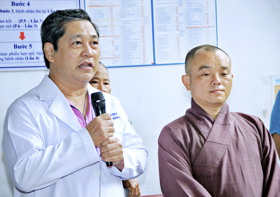 Tại đây, bác sĩ Nguyễn Hoàng Cẩn đại diện cho quý Y bác sĩ bệnh viện phát biểu cảm ơn đoàn và các Phật tử kiều bào đã phát tâm hỗ trợ cho các bà con nghèo, gia cảnh khó khăn được đôi mắt sáng nguyên vẹn. Theo Bác sĩ, đây là một việc làm tốt đẹp có ý nghĩa nhân văn sâu sắc cần được duy trì, nhân rộng ở nhiều phạm vi. Sau lời phát biểu, đoàn đã gởi tặng mỗi bệnh nhân một phần quà và bao thư (tiệm mắt kính Duy Cường Tp. Tân An tặng cặp kính che bụi).