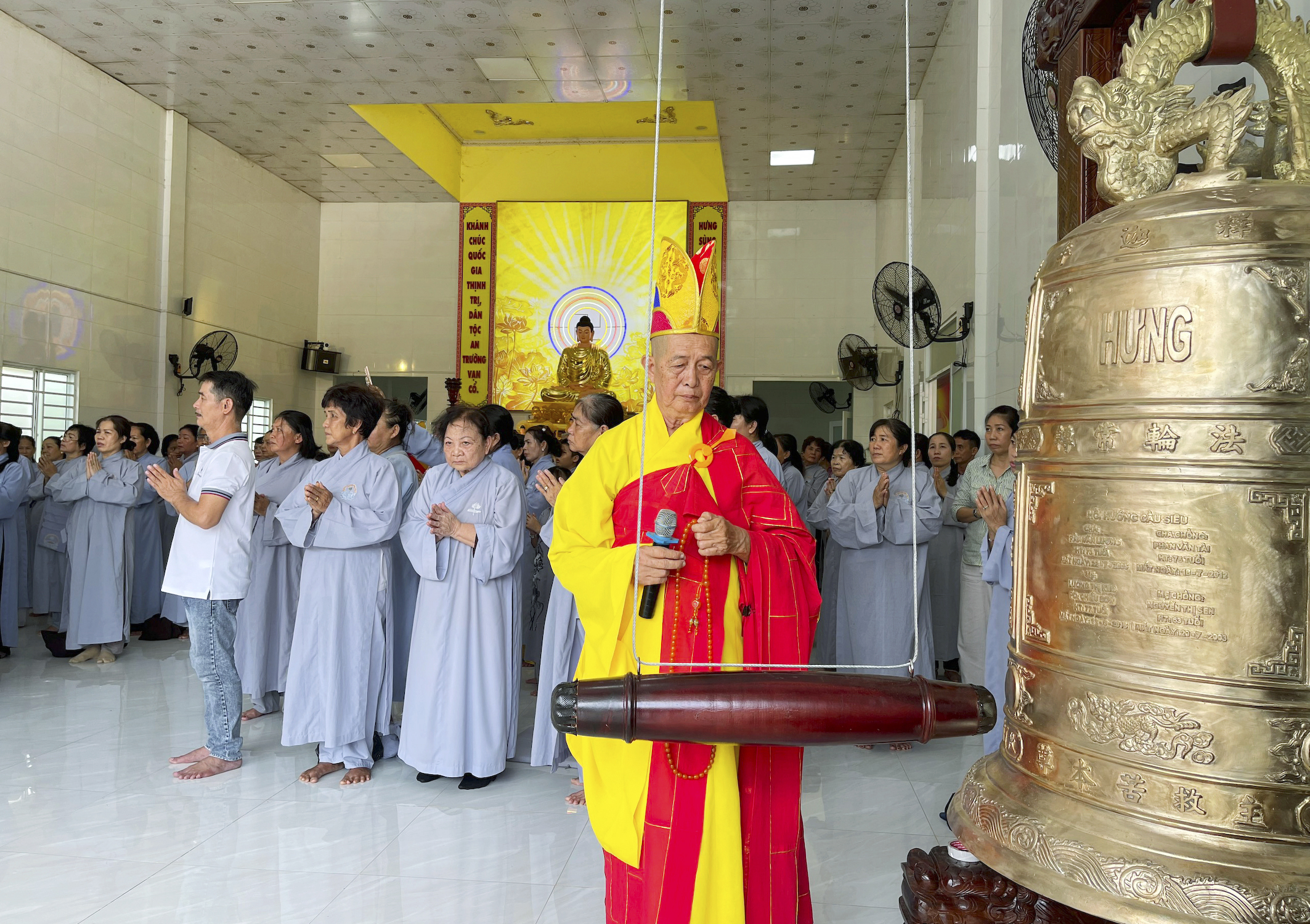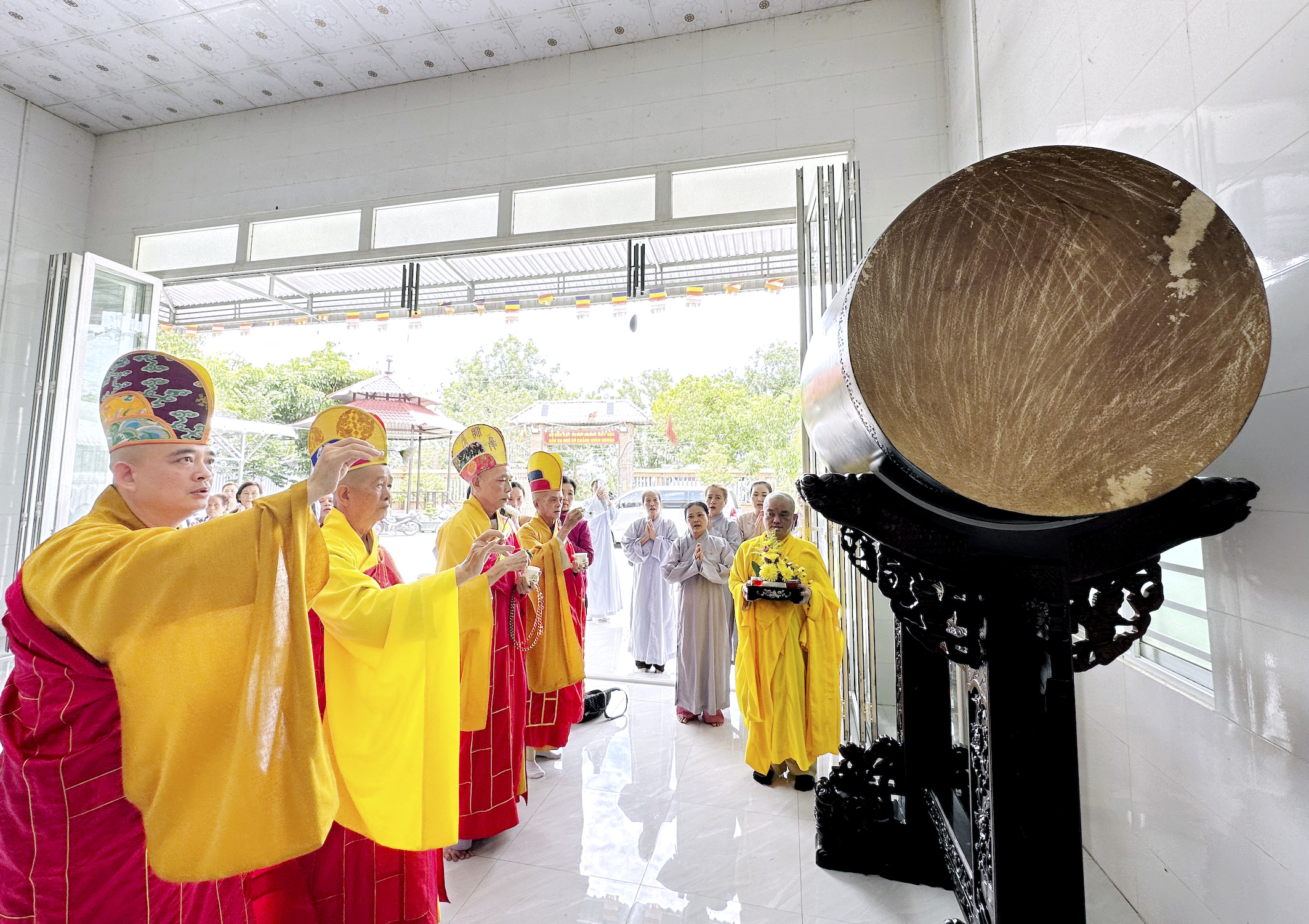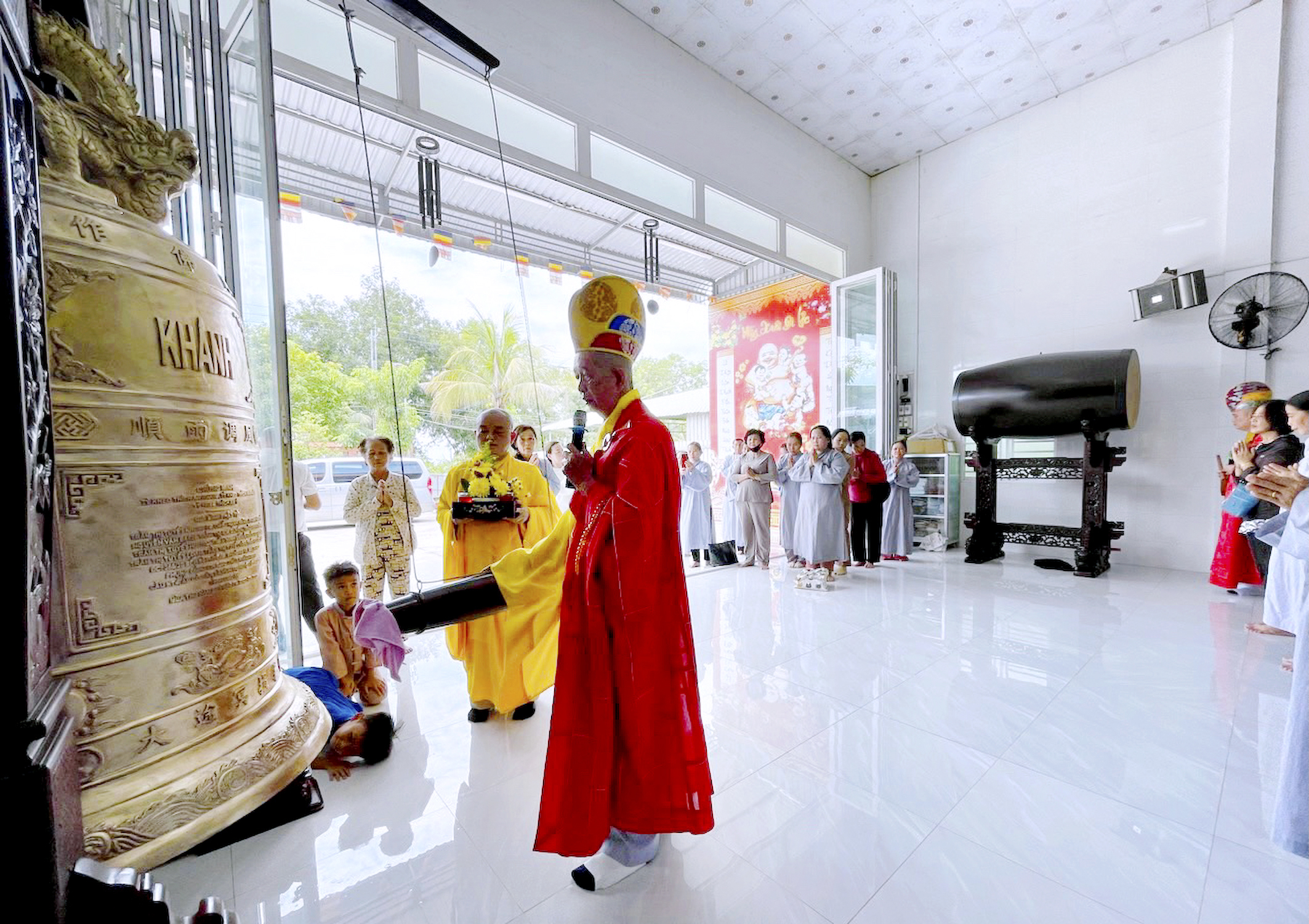 Sau nghi thức niêm hương, bạch Phật, chư Tôn Đức đồng gia trì sái tịnh, cung thỉnh chư vị Hòa thượng chứng minh thân lâm khởi Chuông-Trống. Từng nhịp trống, chuông hòa âm vang vọng giữa thôn làng, xua tan bao phiền muộn, Phật tử chí thành theo nghi lễ, đạo tràng Khánh Hưng như sáng bừng lên trong nắng sớm.