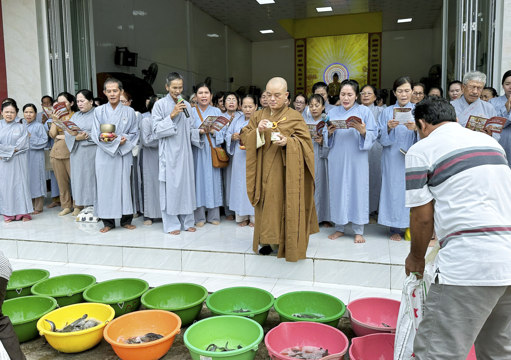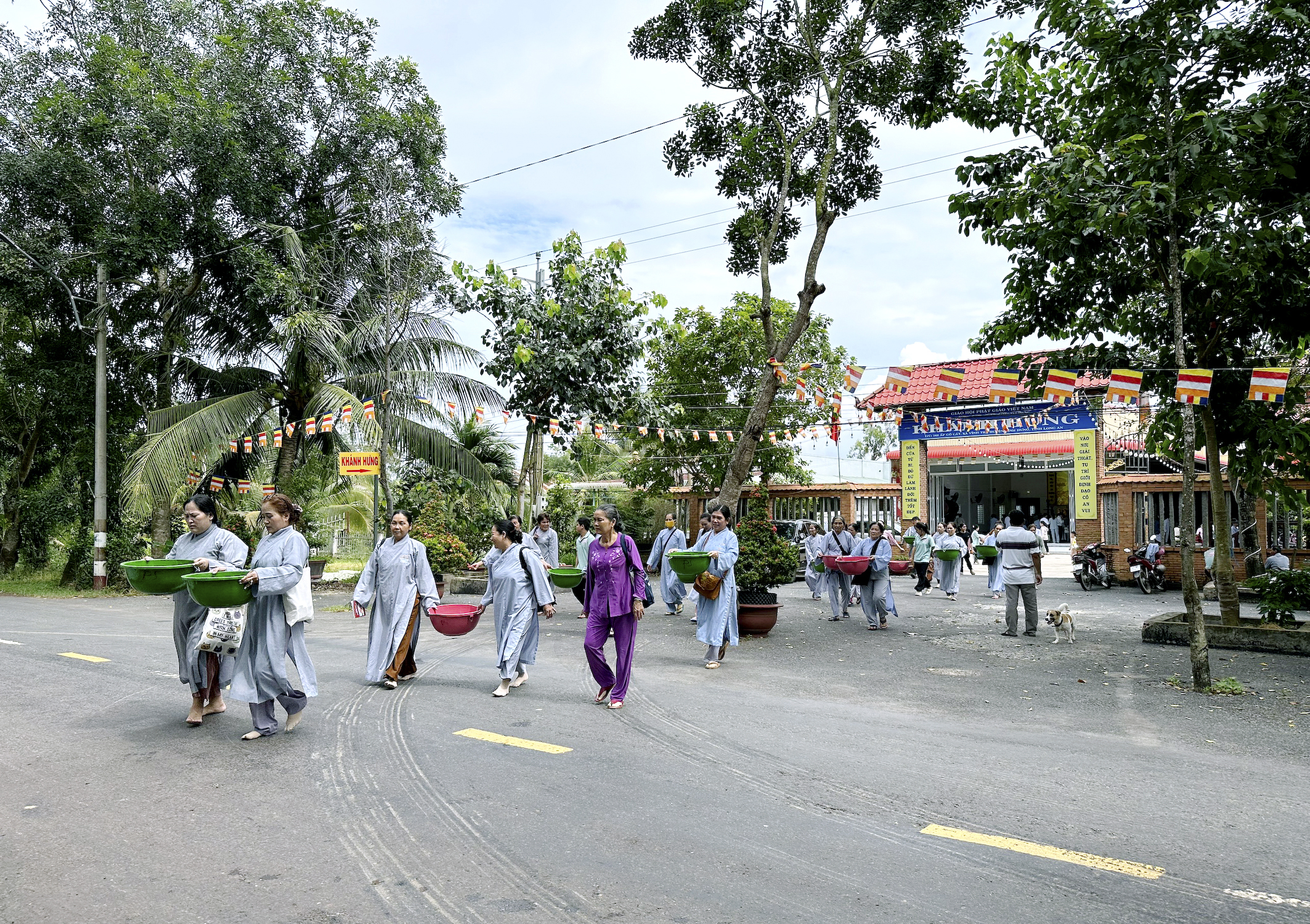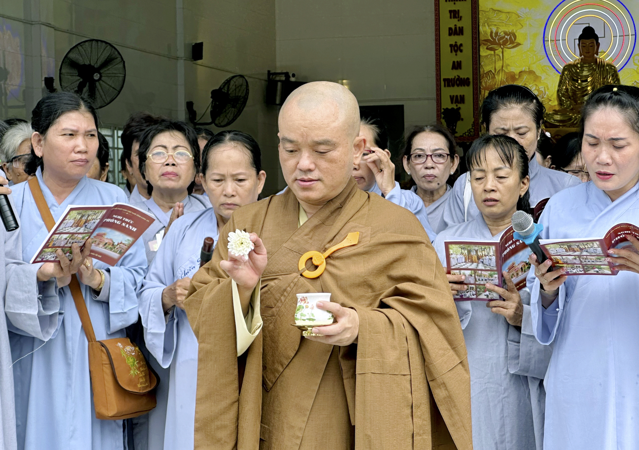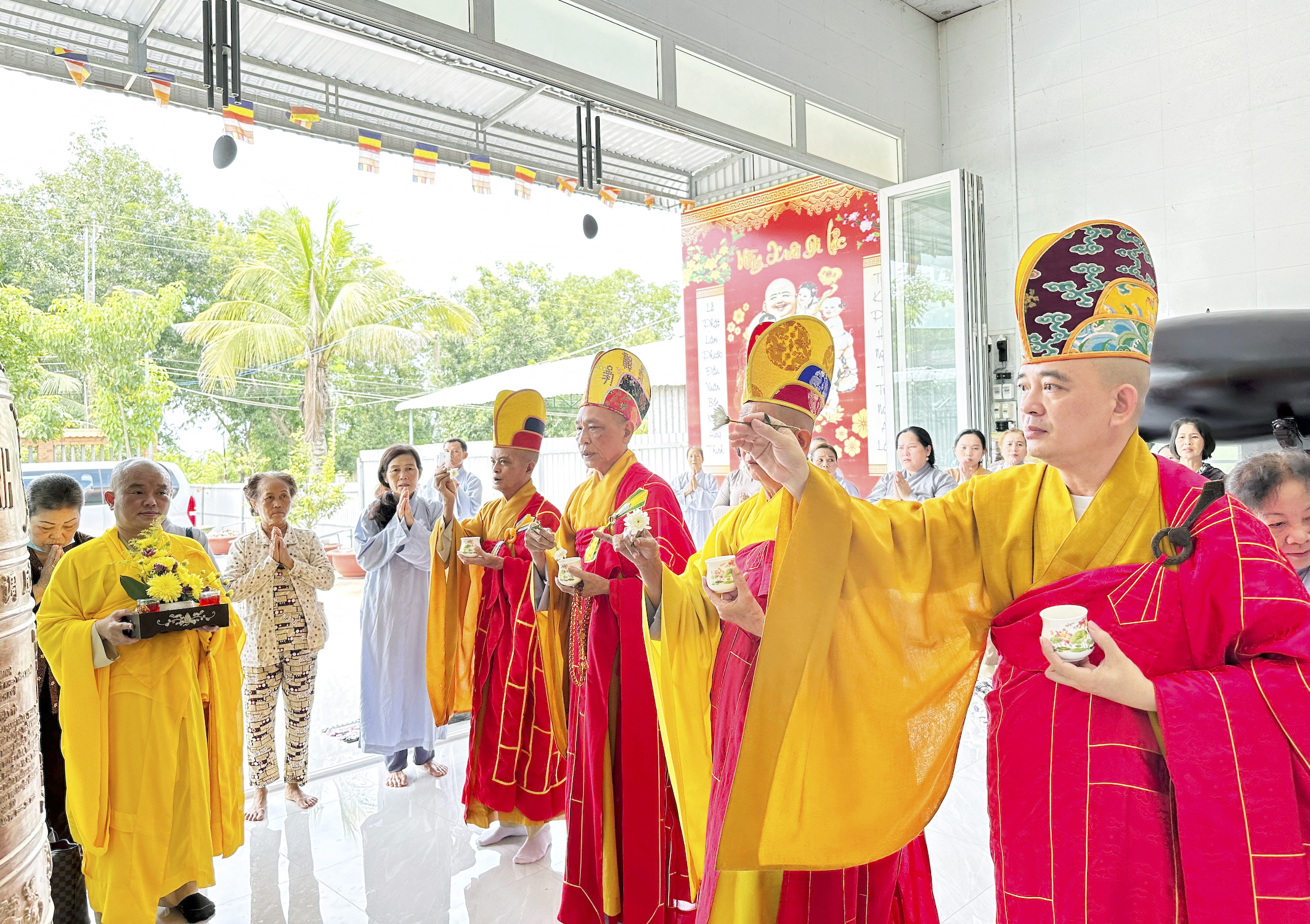 Sau nghi thức niêm hương, bạch Phật, chư Tôn Đức đồng gia trì sái tịnh, cung thỉnh chư vị Hòa thượng chứng minh thân lâm khởi Chuông-Trống. Từng nhịp trống, chuông hòa âm vang vọng giữa thôn làng, xua tan bao phiền muộn, Phật tử chí thành theo nghi lễ, đạo tràng Khánh Hưng như sáng bừng lên trong nắng sớm.