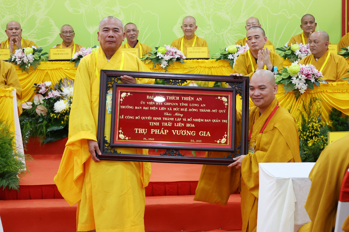 Thay mặt Ban Quản trị Tịnh thất Liên Hoa, Đại đức Thích Đức Thuận – tân trụ trì, trưởng ban Quản trị Tịnh thất Liên Hoa dâng lời phát nguyện nhận nhiệm vụ. Đại đức bày tỏ lòng tri ân sâu sắc đến Hòa thượng Trưởng BTS GHPGVN tỉnh Long An, Chư tôn đức BTS GHPGVN tỉnh Long An, huyện Đức Huệ cũ và các cấp lãnh đạo chính quyền đã tạo điều kiện để Tịnh thất Liên Hoa được chính thức trở thành cơ sở trực thuộc Phật giáo tỉnh nhà, với tinh thần “Tổ đức nan thù” Đại đức đã cung thỉnh Thượng tọa Thích Nhuận Lễ – Bổn sư thế độ của Đại đức vào ngôi vị chứng minh BQT tịnh thất Liên Hoa, Thượng tọa Thích Tâm Hướng – Ân sư của Đại đức vào ngôi vị Viện chủ Tịnh thất Liên Hoa để nương tâm hạnh của Qúy Ngài trên bước đường thừa hành Phật sự.